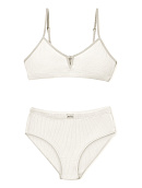 Комплект выполнен из мягкого трикотажа в рубчик, содержащего хлопок и модал.