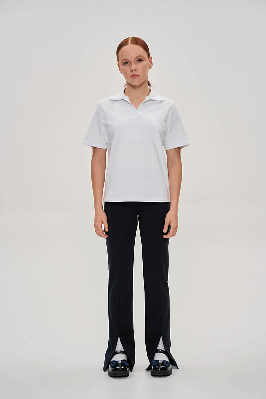 Брюки прямого кроя с разрезами спереди из плотного трикотажного материала, который обладает высокой износостойкостью, практически не мнется, быстро сохнет и не закатывается.