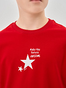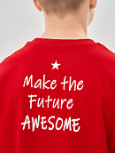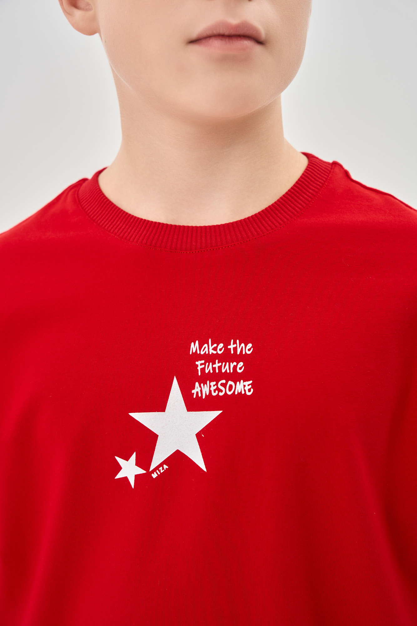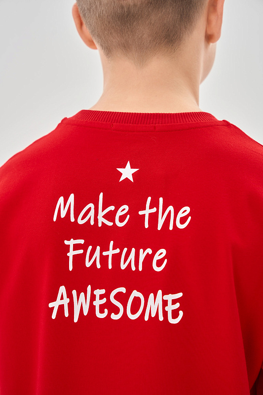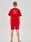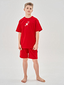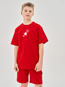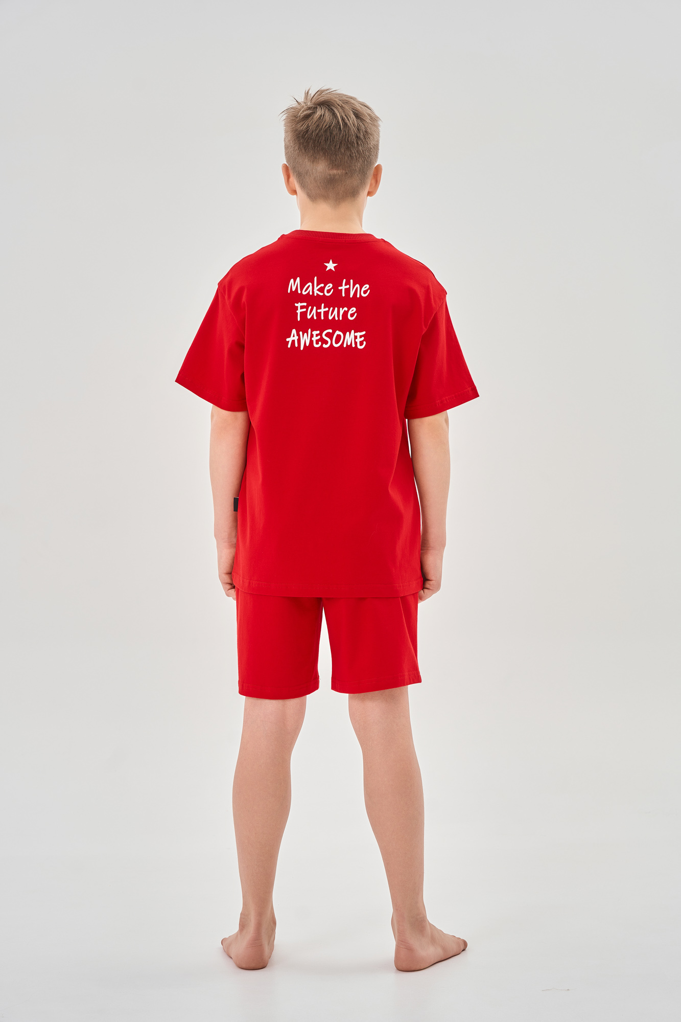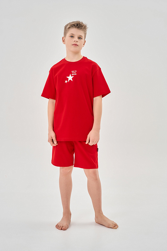 Комплект состоит из футболки свободного кроя, дополненной дизайнерскими принтами в объемной технике, и шорт прямого кроя.