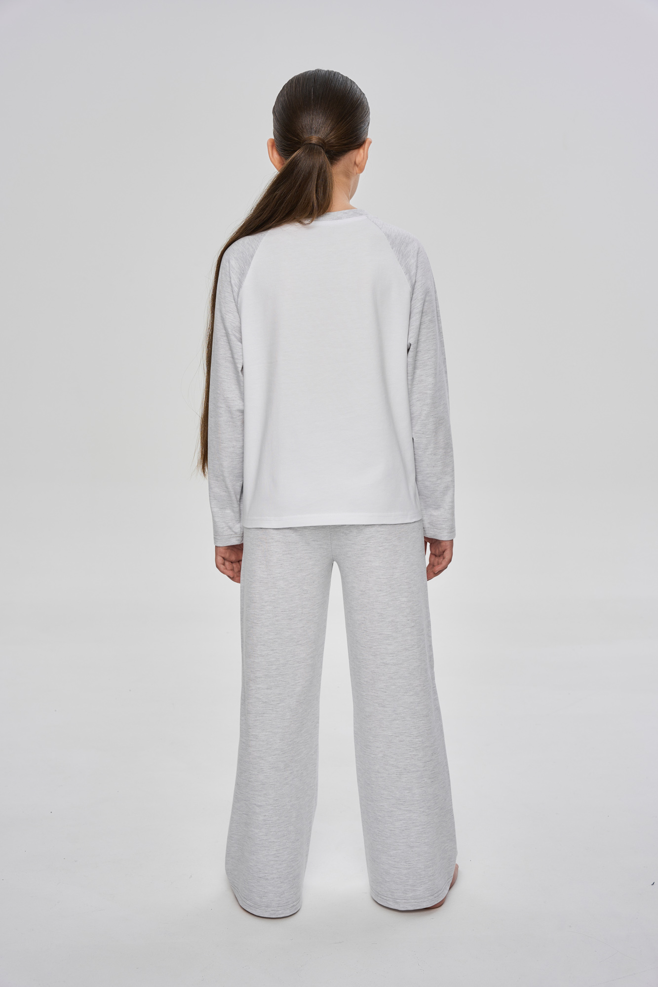 Комплект состоит из лонгслива с рукавом кроя реглан и брюк прямого свободного кроя.