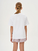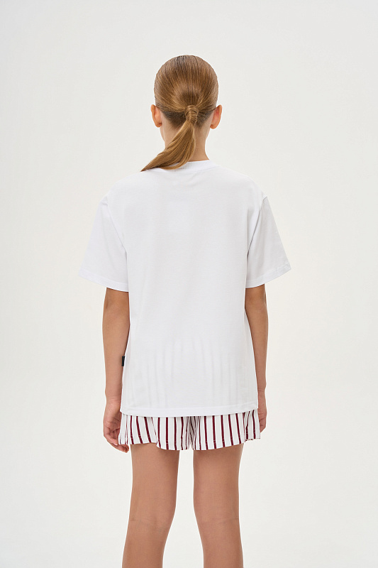 Комплект состоит из футболки прямого свободного кроя с принтом и шортиков из полосатого трикотажа.