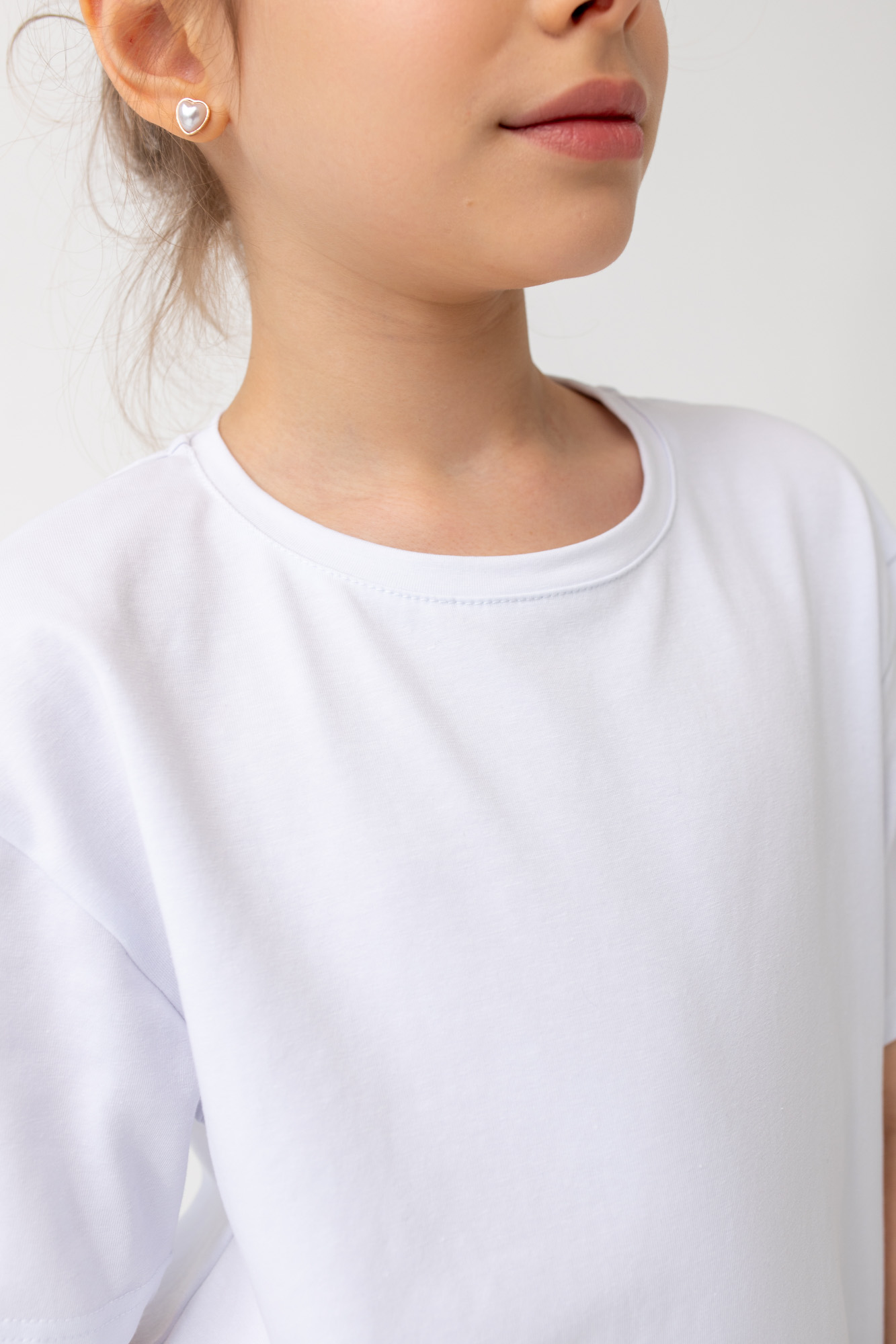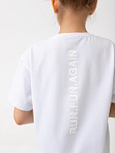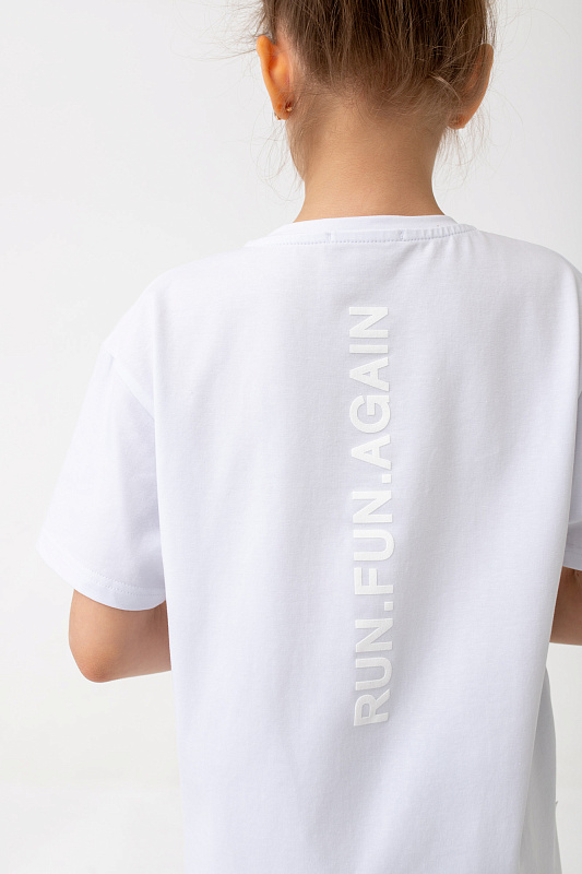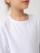 Удлинённая футболка свободного кроя для девочки из экологичного премиального трикотажа, содержащего хлопок с лайкрой, с брендовой нашивкой на спине.