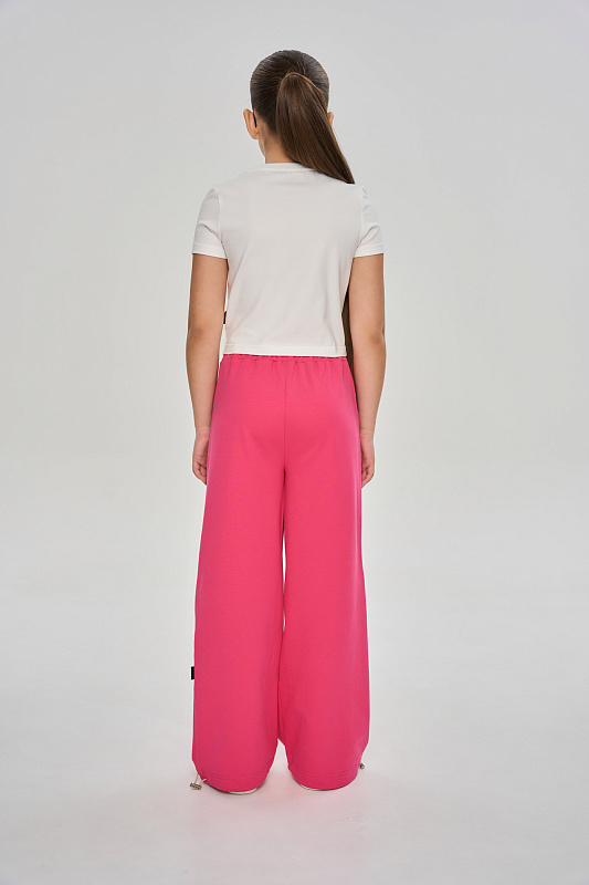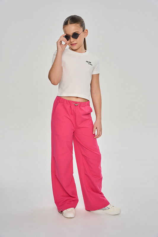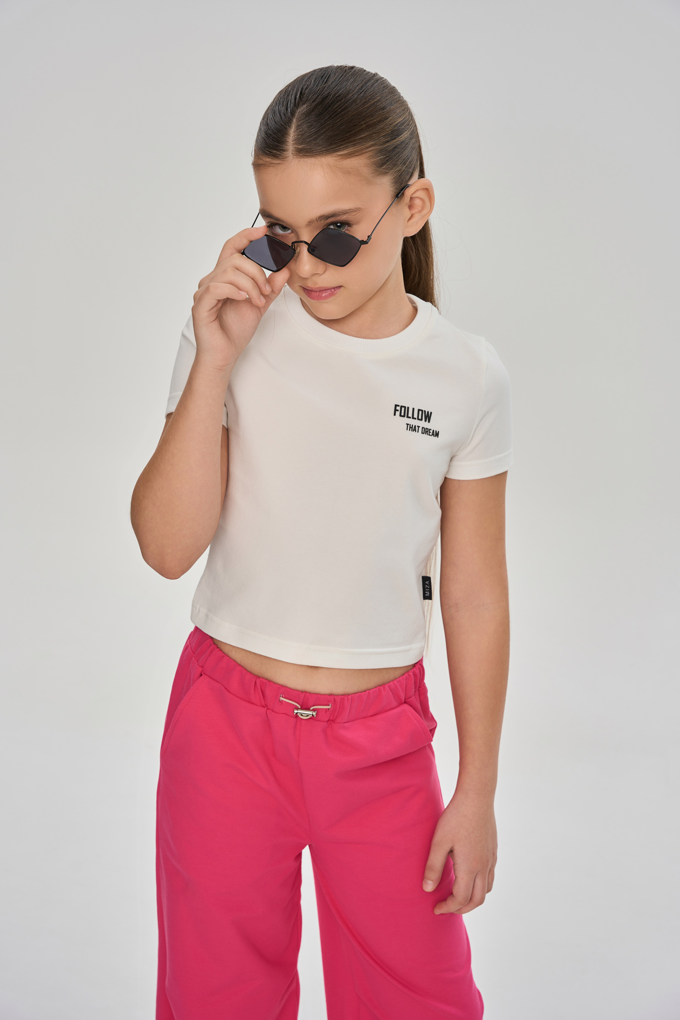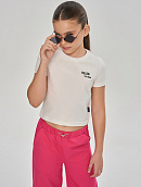 Укороченная футболка прилегающего кроя с небольшим принтом на переде.