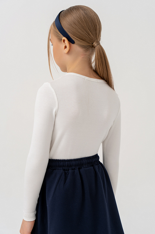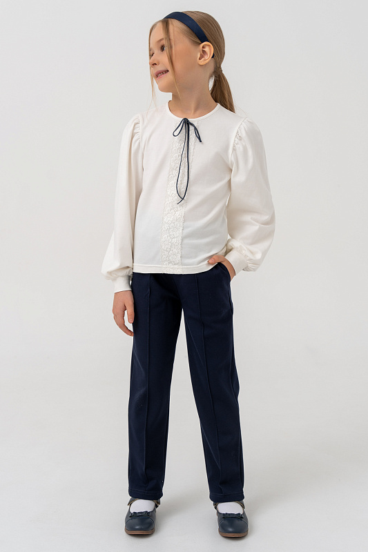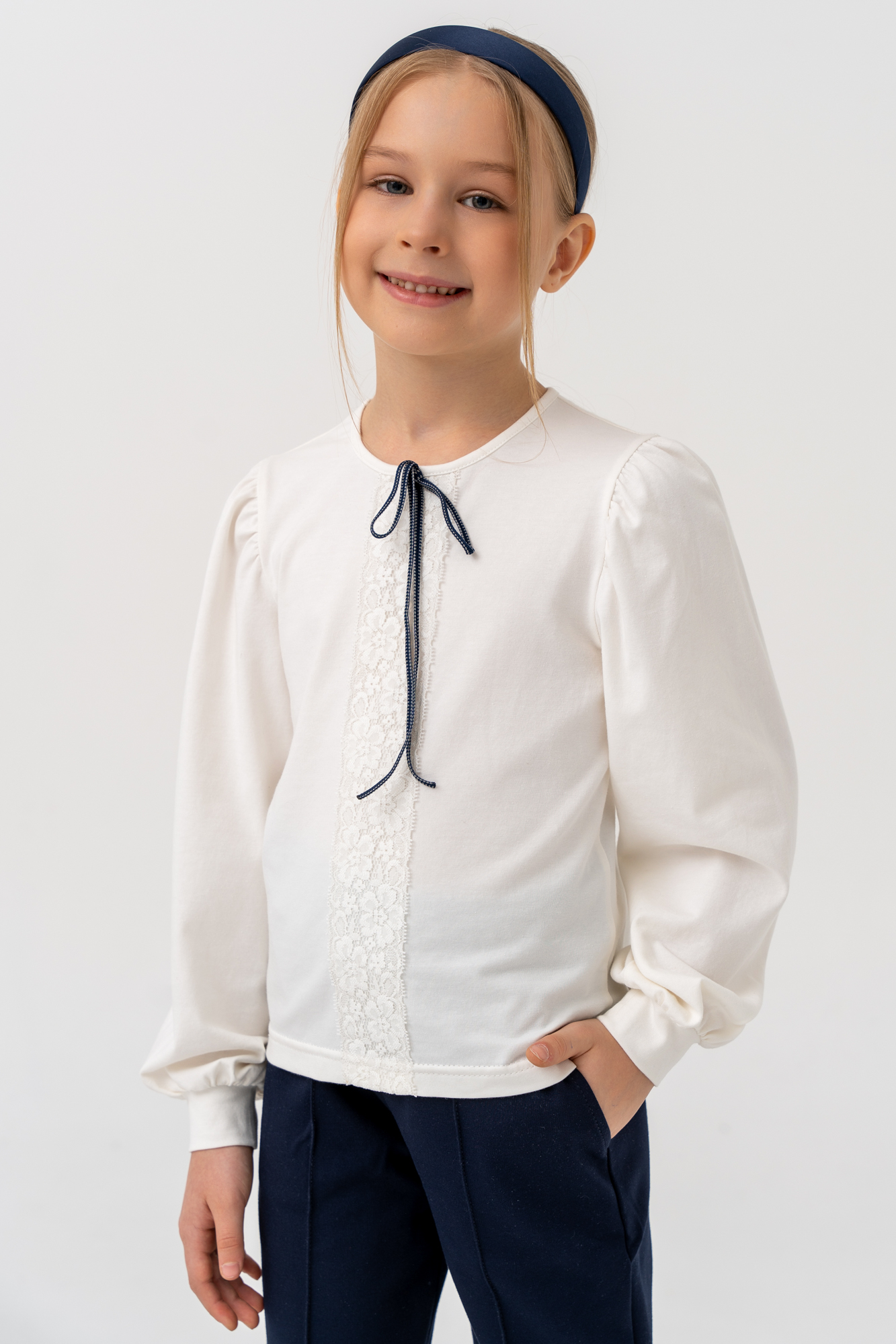 Лонгслив с объёмными рукавами и декоративной кружевной вставкой на переде, дополнен отделочной лентой.