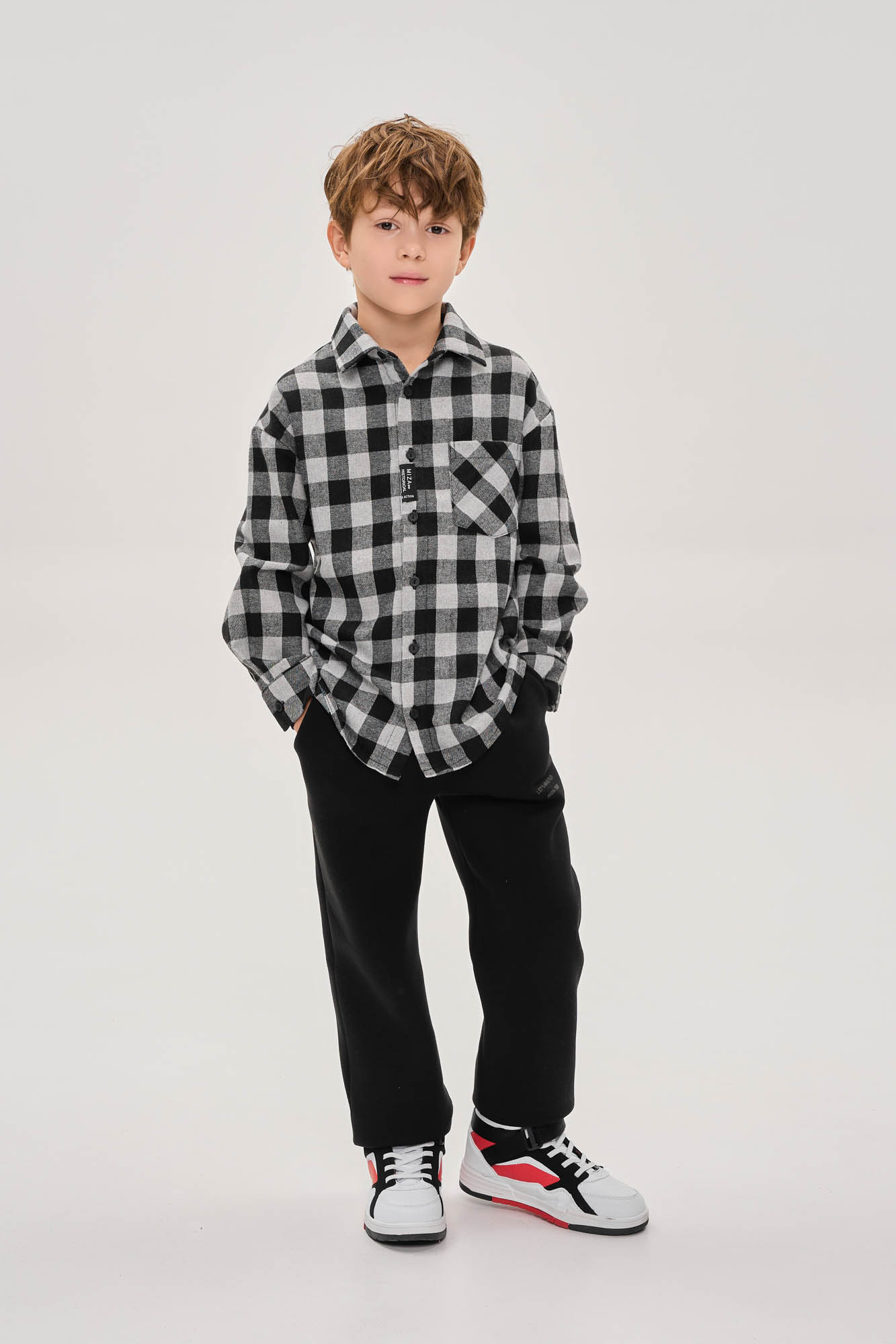 На переде застежка на пуговицы, оформлена брендированной нашивкой, и накладной карман.