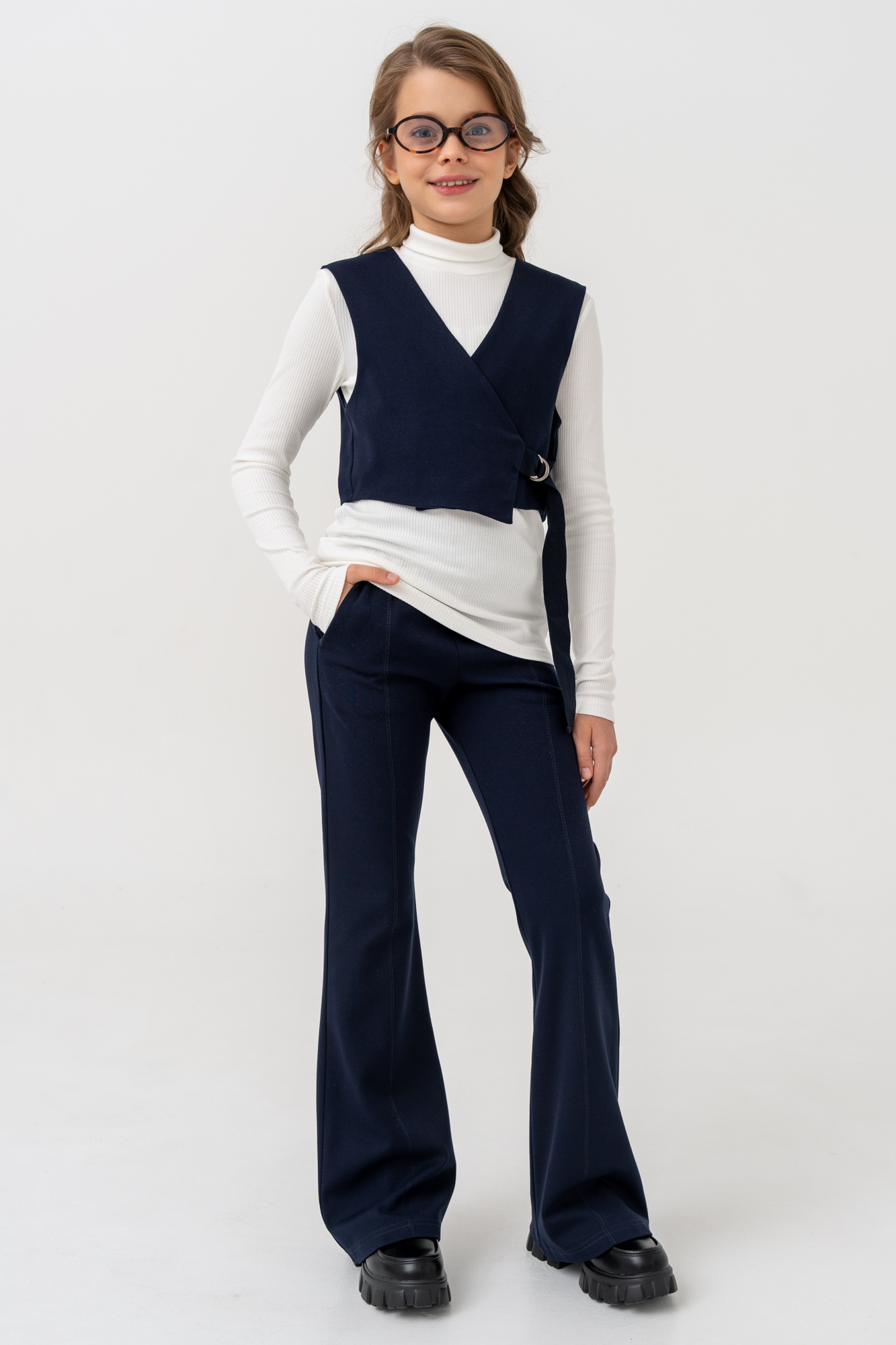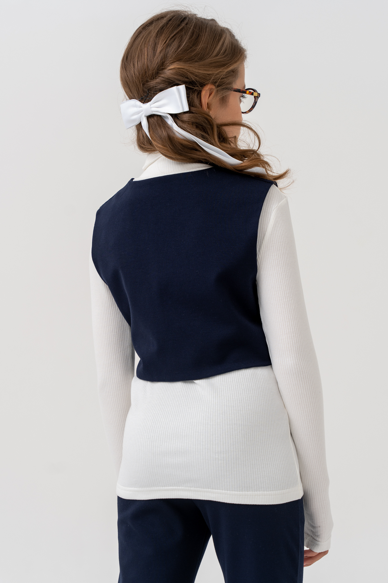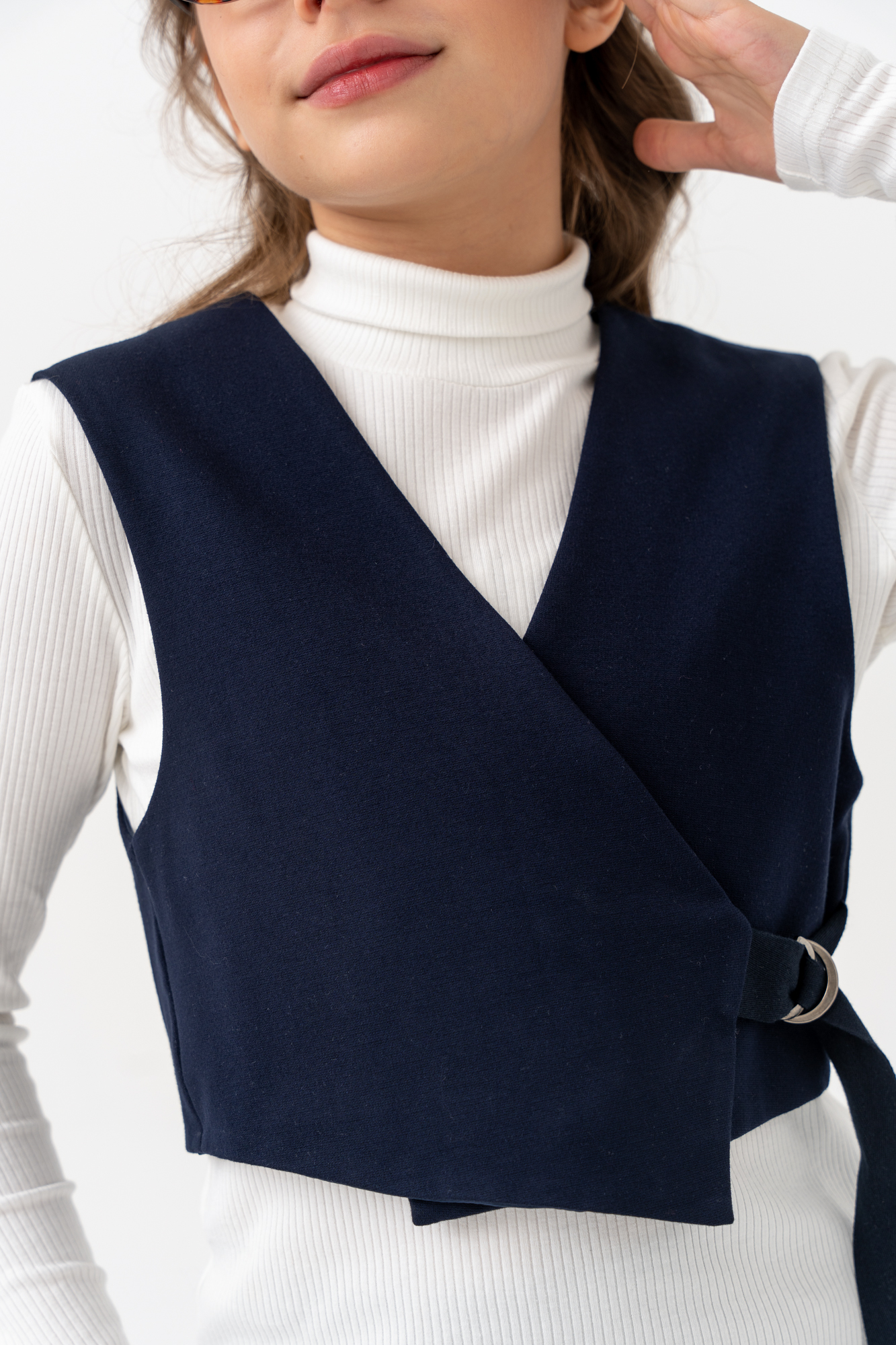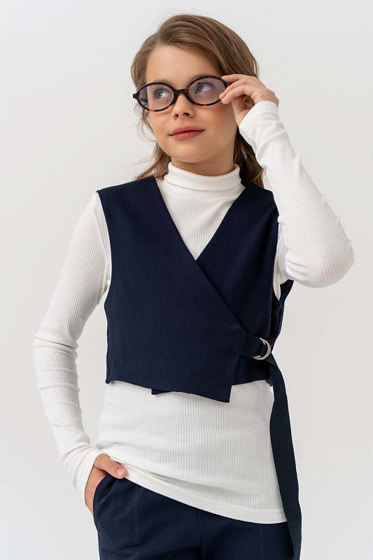 Жилет укороченный, асимметричного кроя, с боковой завязкой из текстильной ленты.
