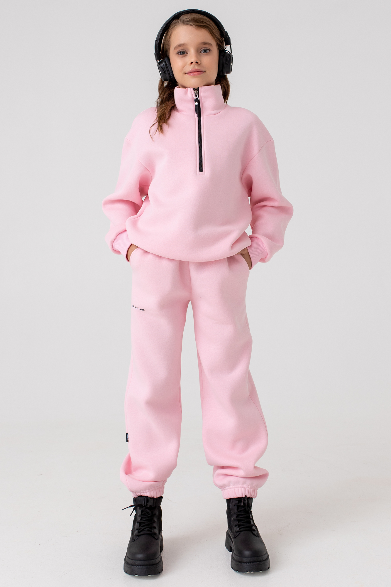 Костюм состоит из свитшота с воротником-стойкой и застежкой-молнией до линии груди и брюк-джоггеров базового кроя.