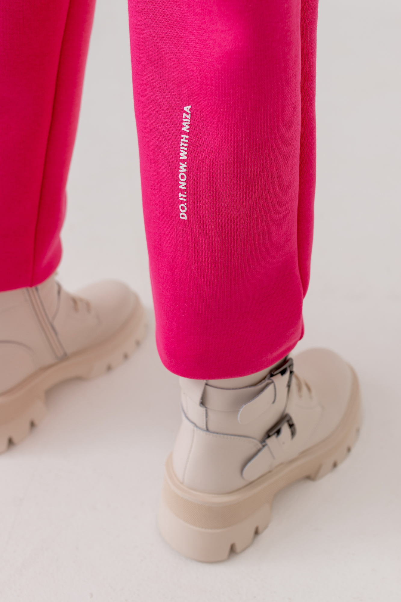 На задней половине брюк также текстовый принт.
