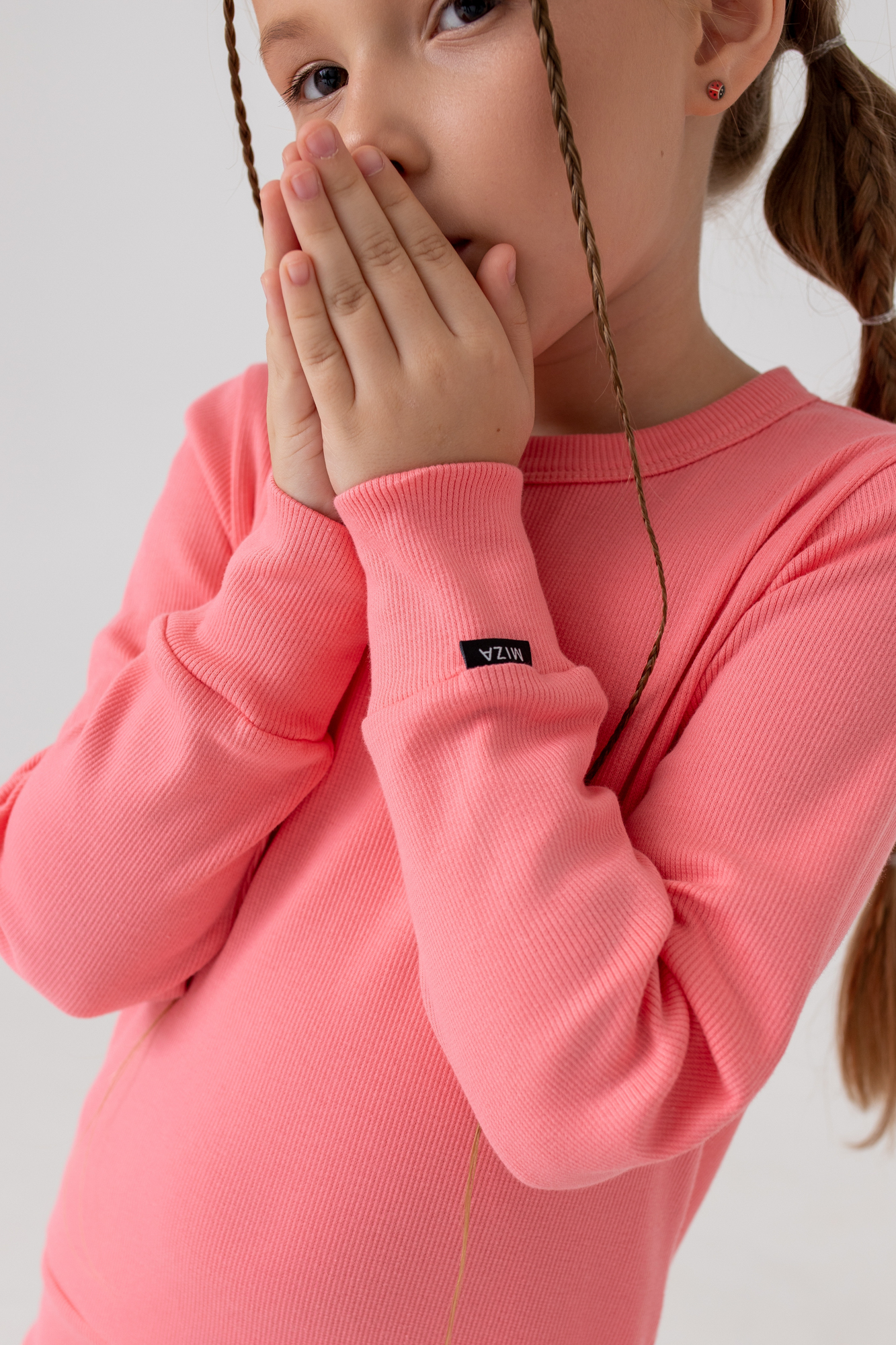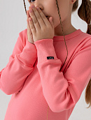 Низ рукава лонгслива на широкой манжете, низ изделия на поясе.