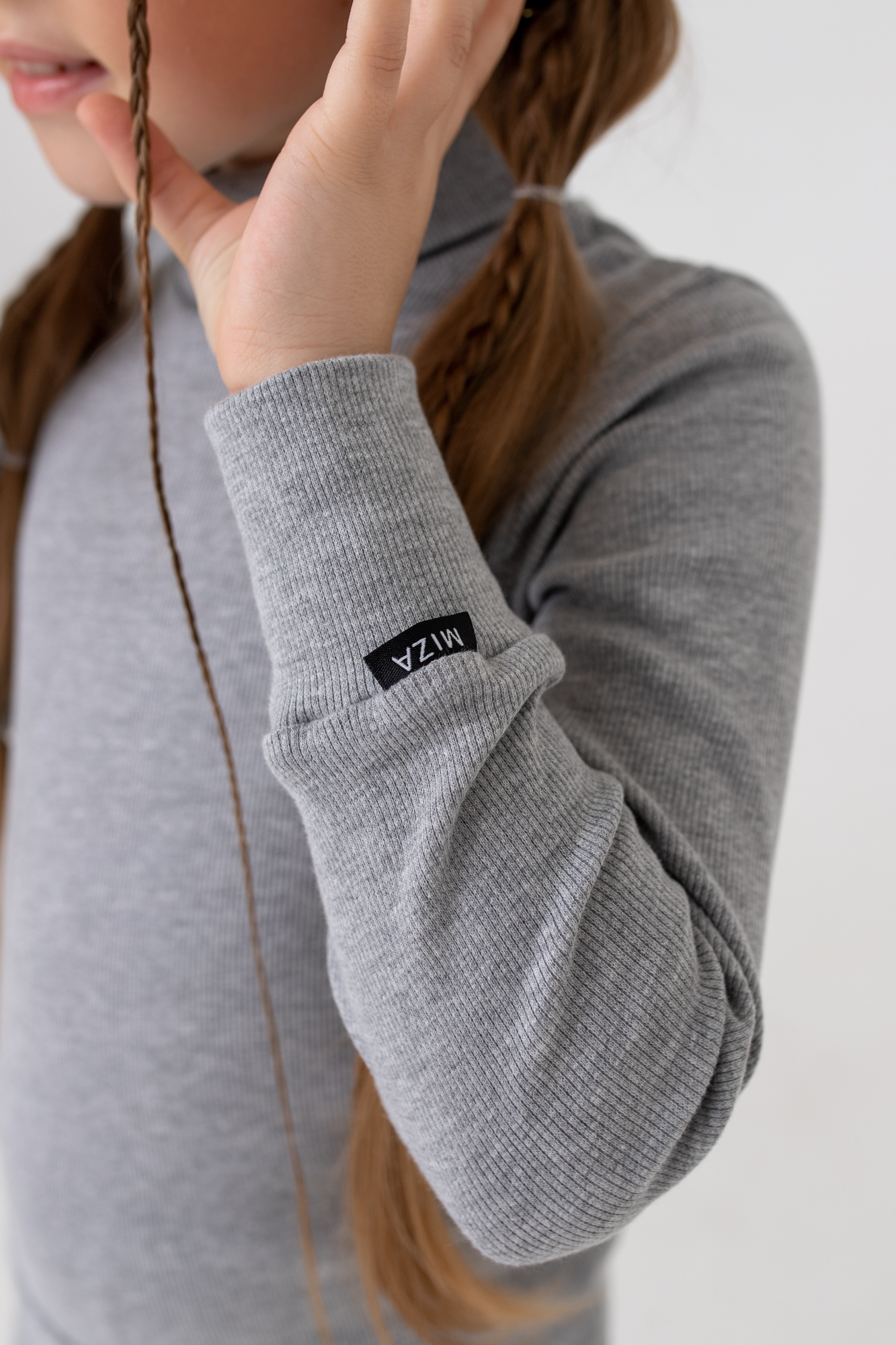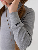 Низ рукава лонгслива на широкой манжете, низ изделия на поясе.