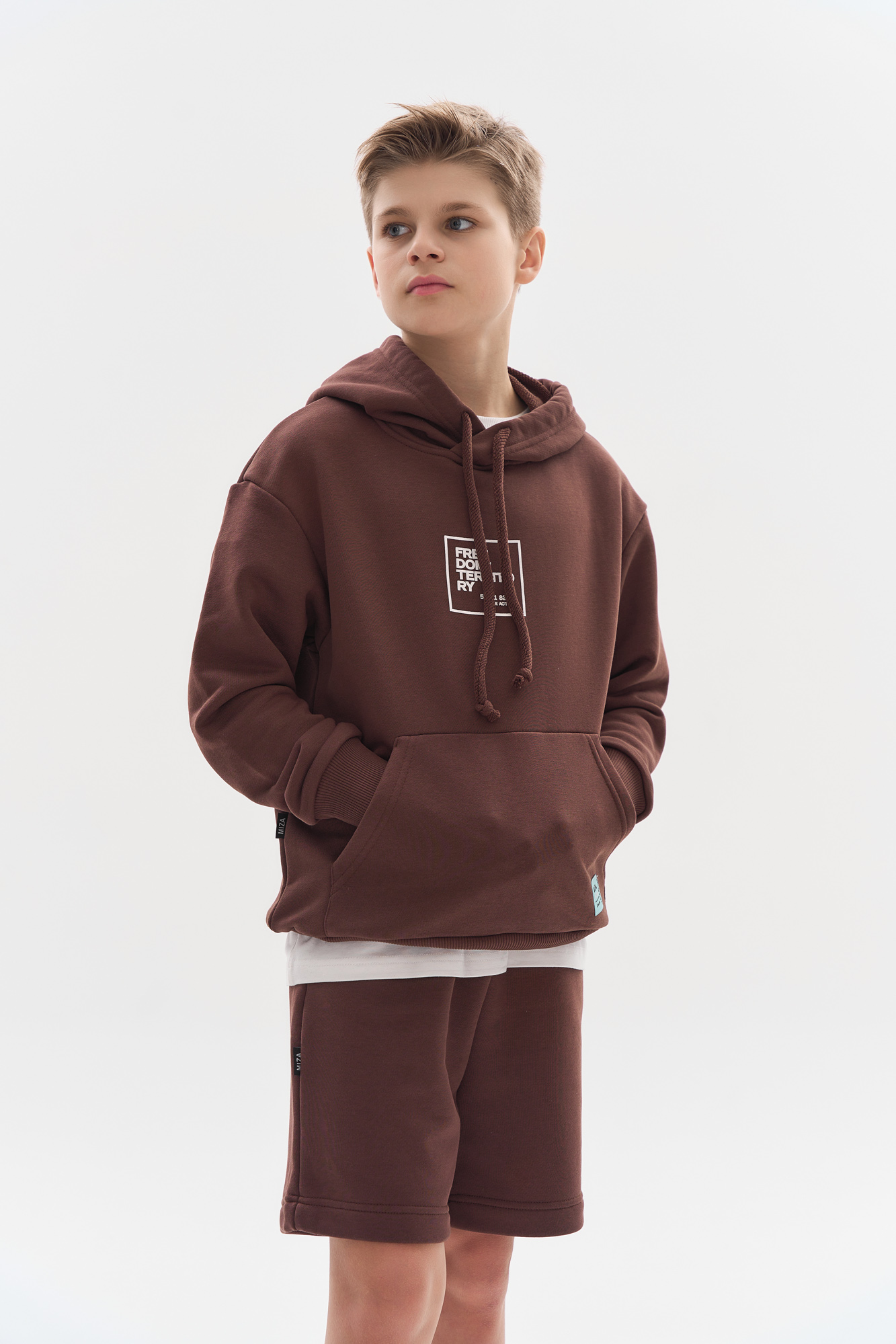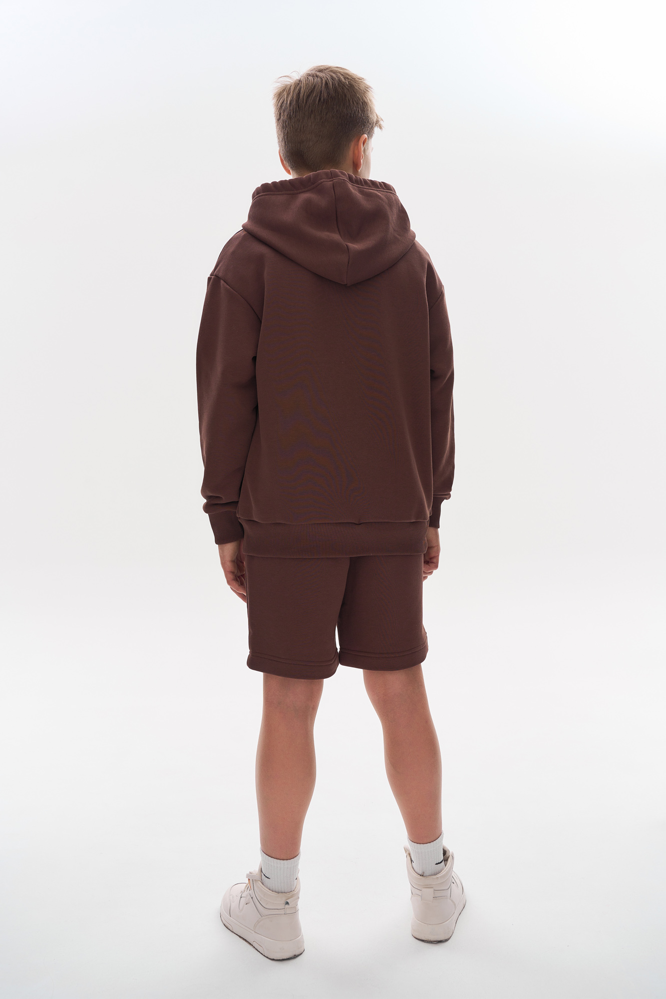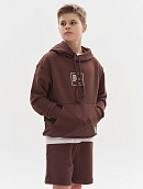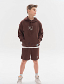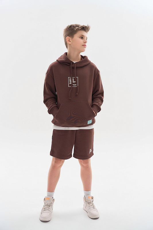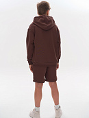 Состоит из свободного худи и шорт прямого кроя.