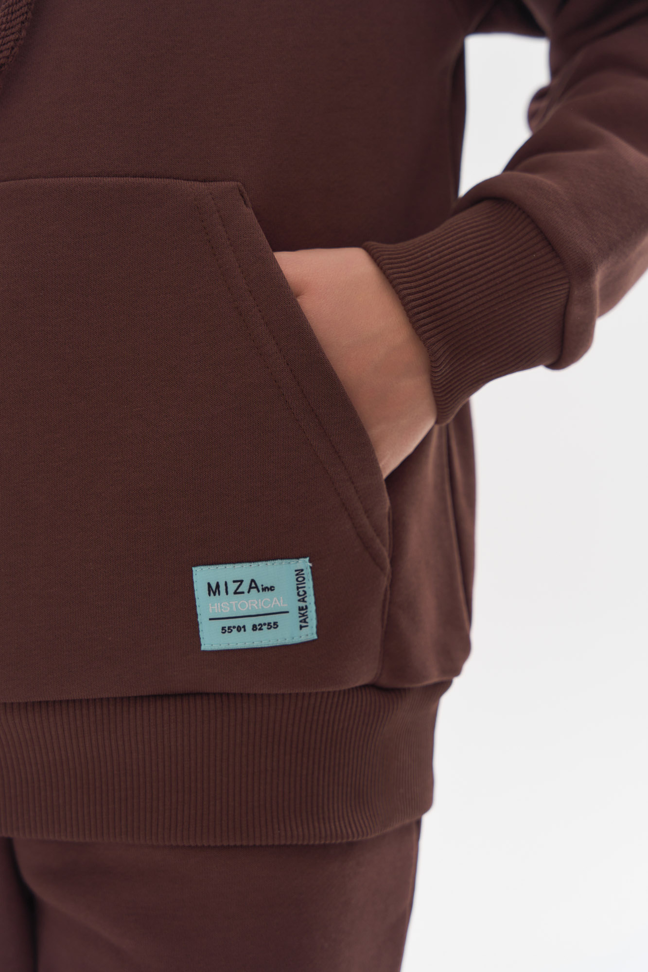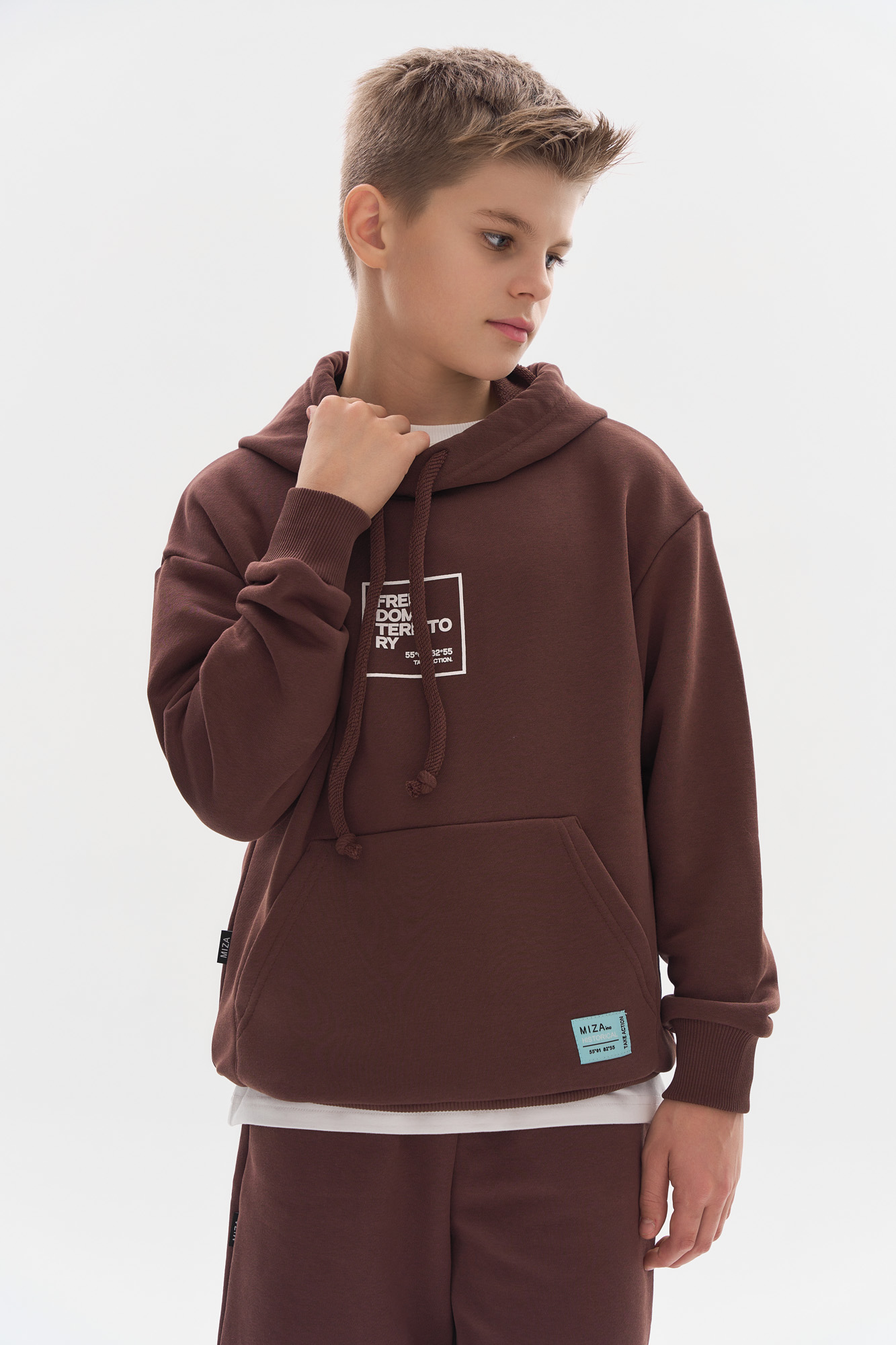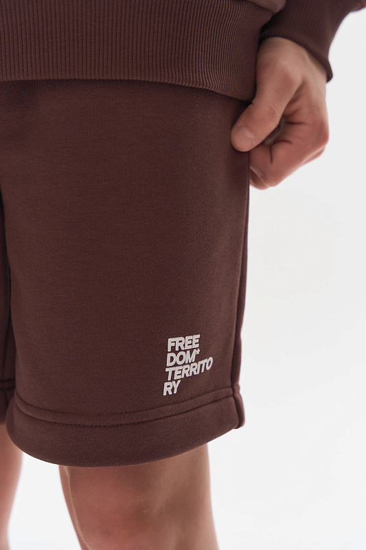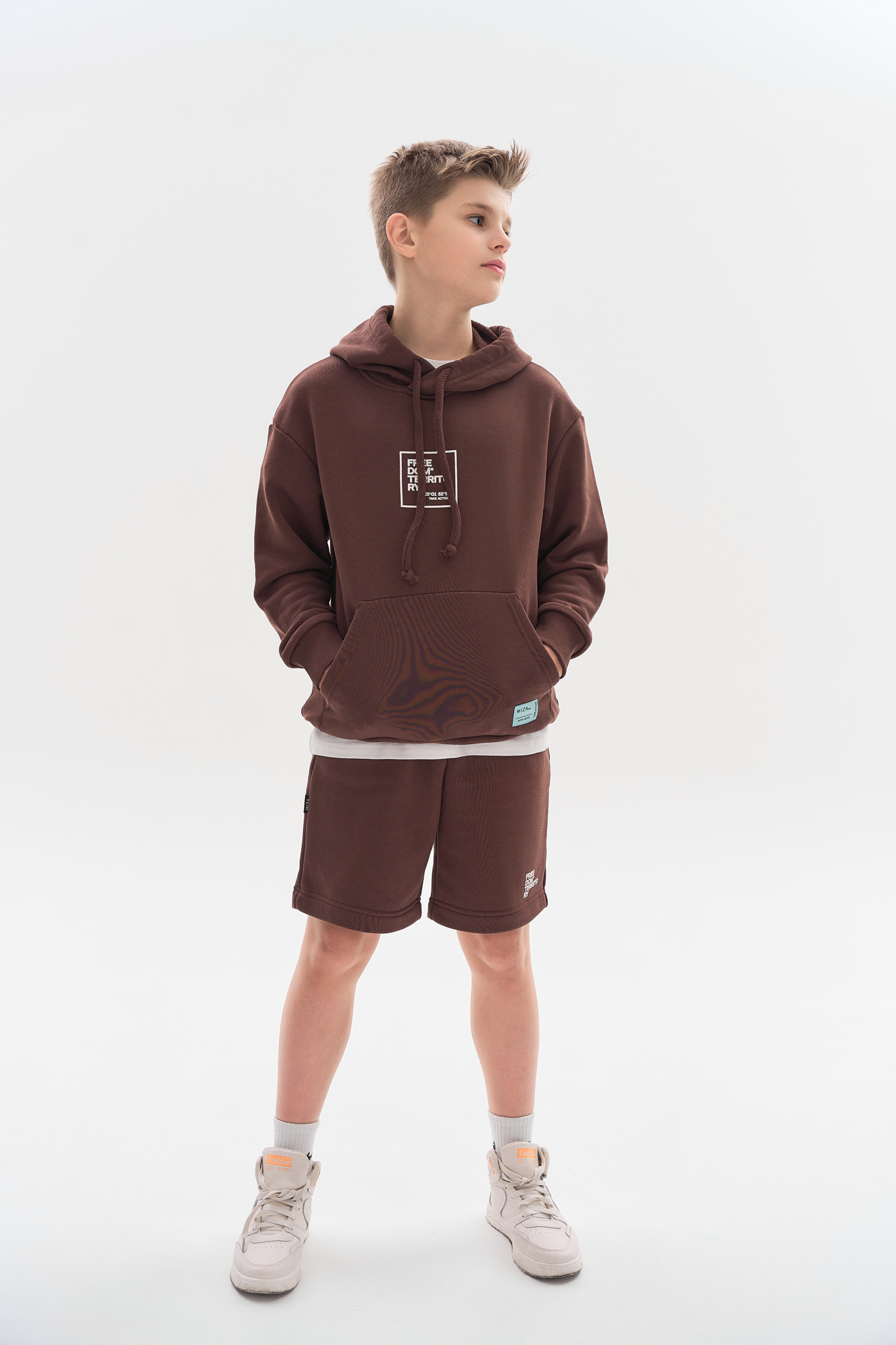 Состоит из свободного худи и шорт прямого кроя.