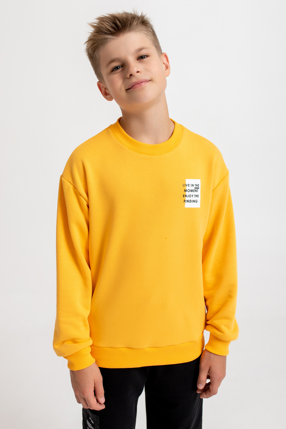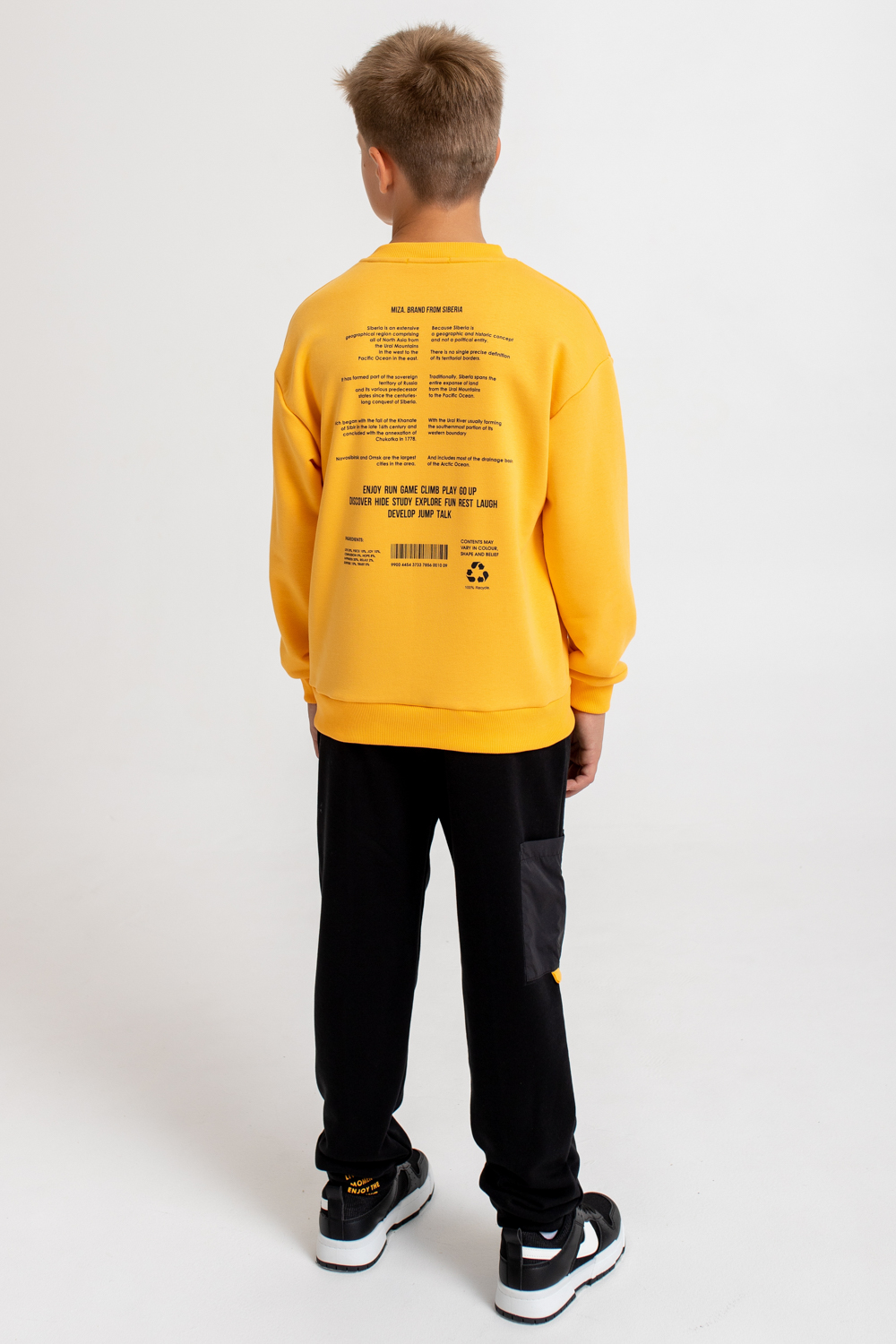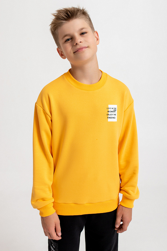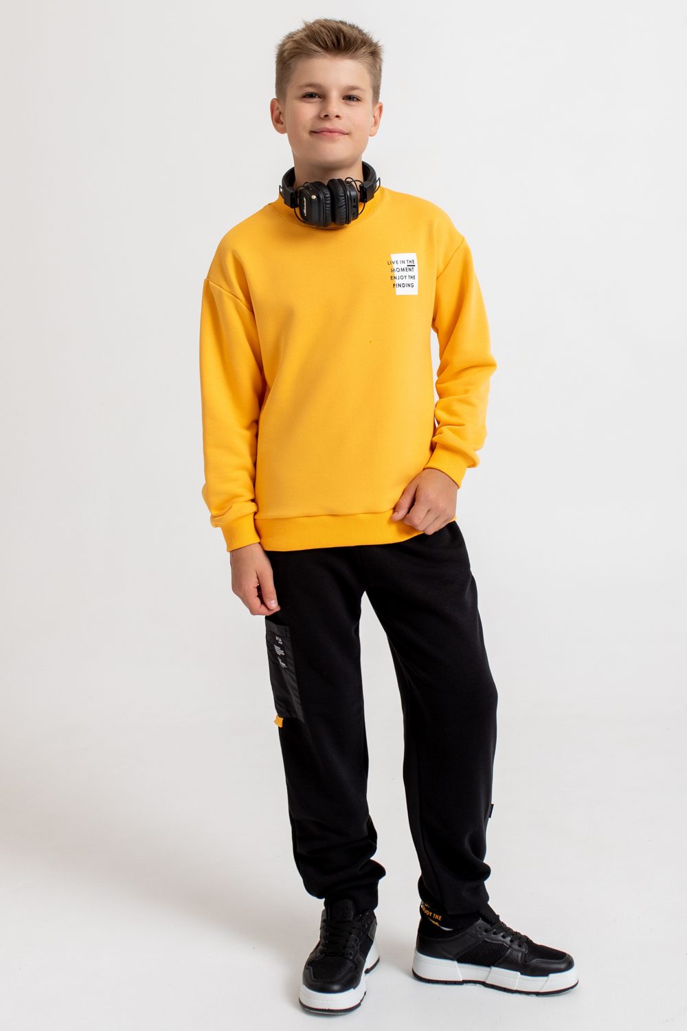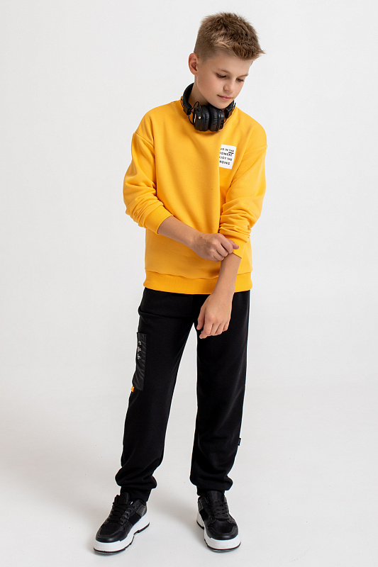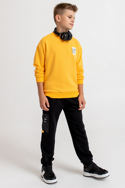 Костюм состоит из свитшота прямого кроя, оформленного принтами, и брюк-джоггеров базового кроя.