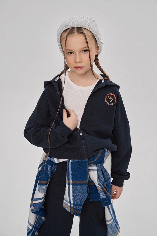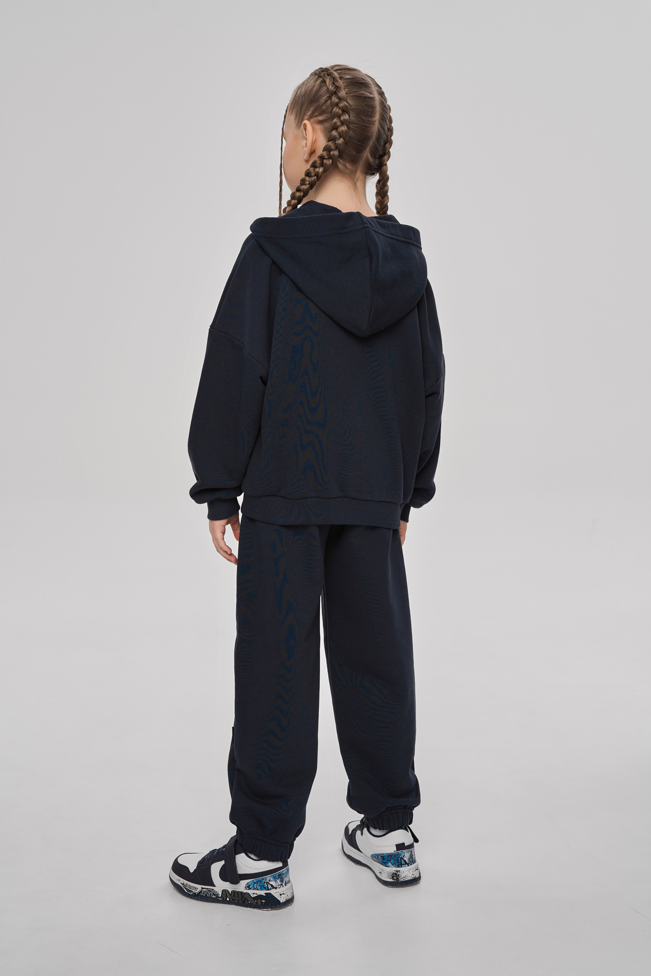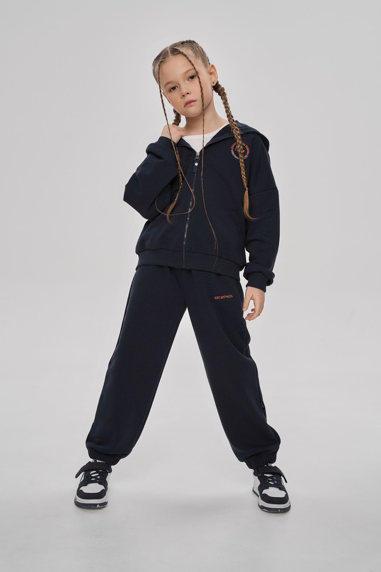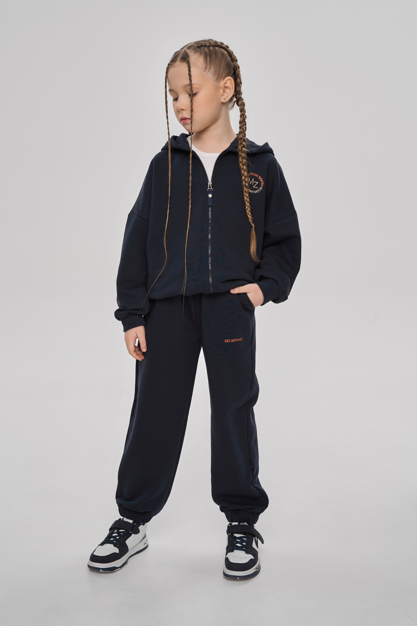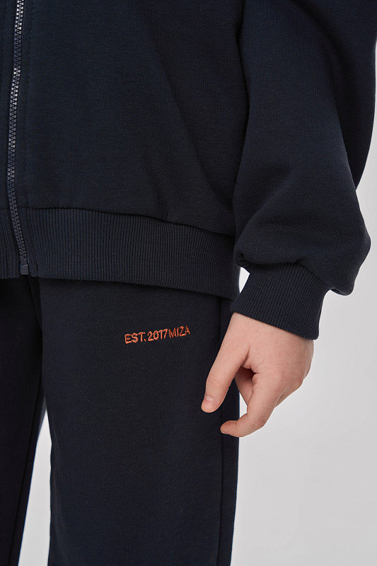 Состоит из худи на молнии и брюк джоггеров.