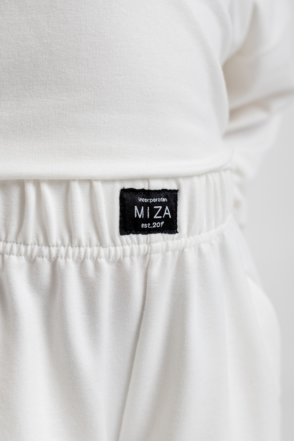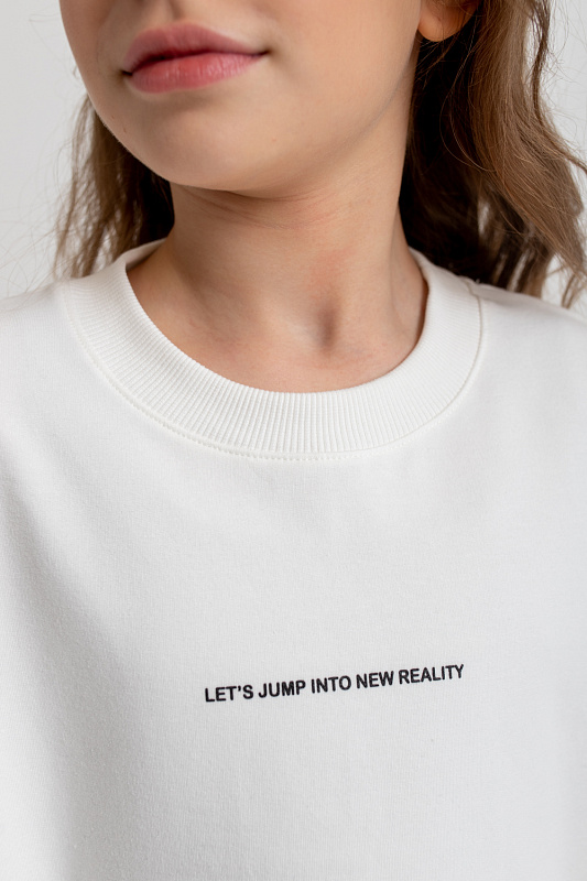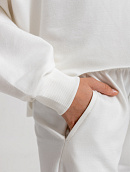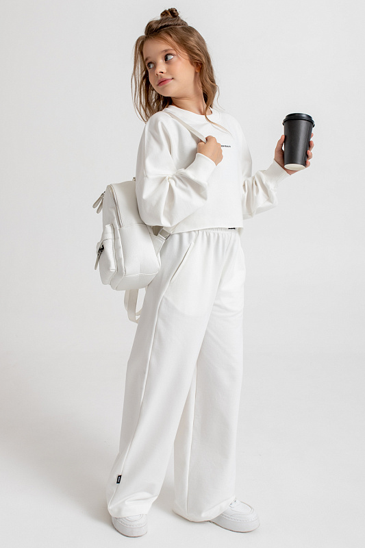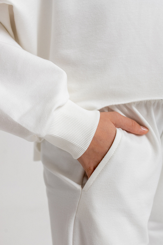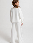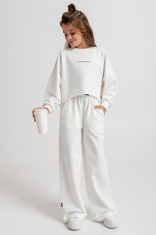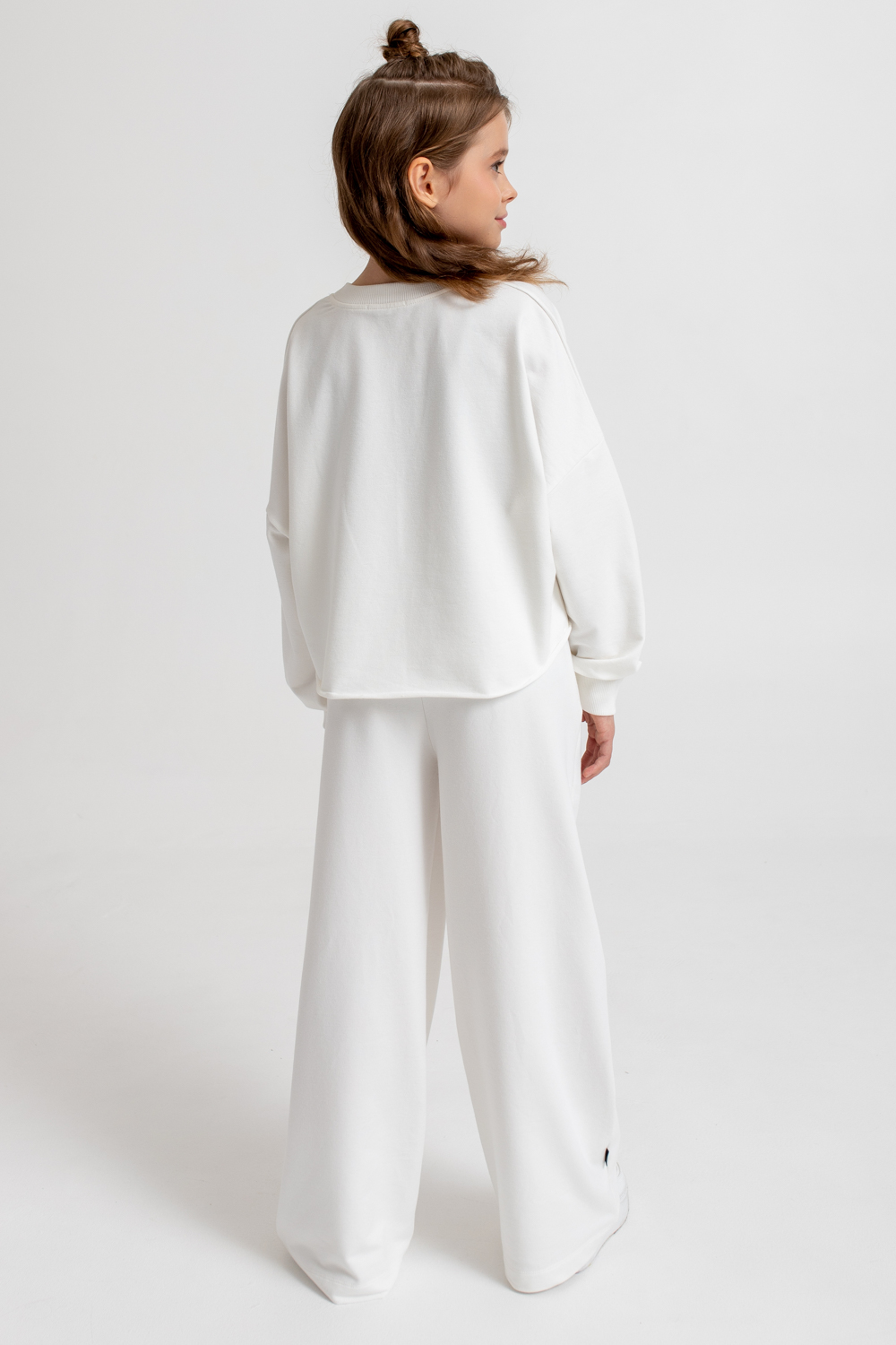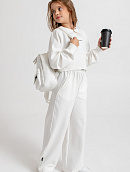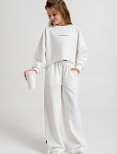 Костюм состоит из свитшота свободного кроя с имитацией необработанного края и брюк "палаццо".