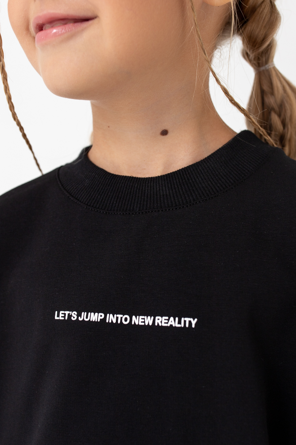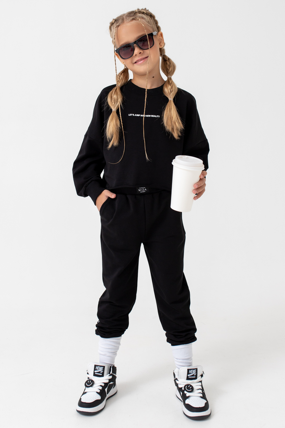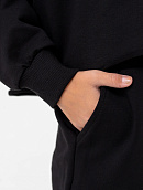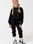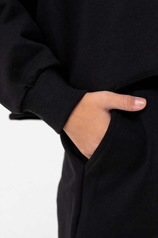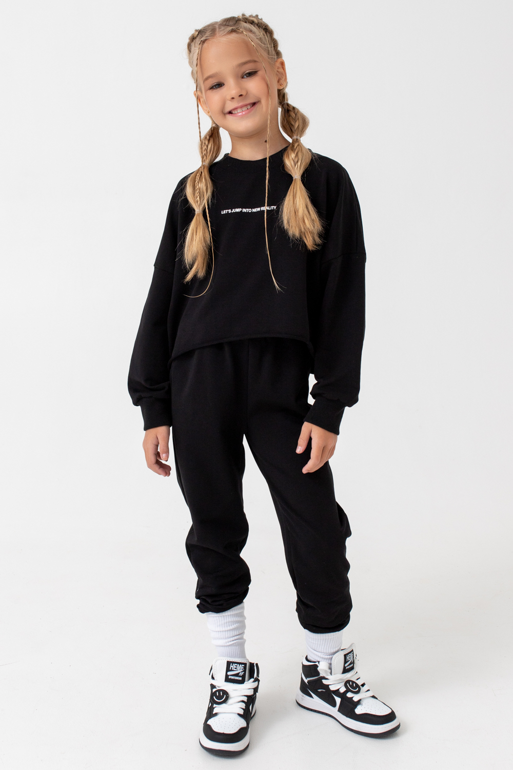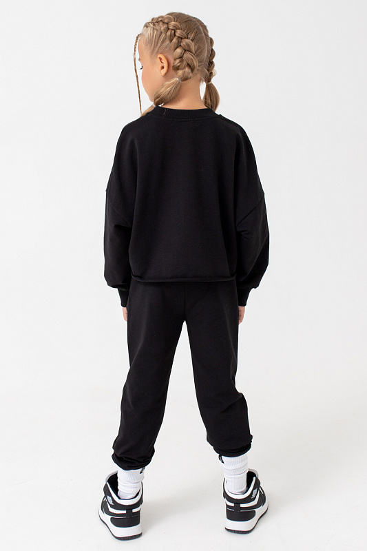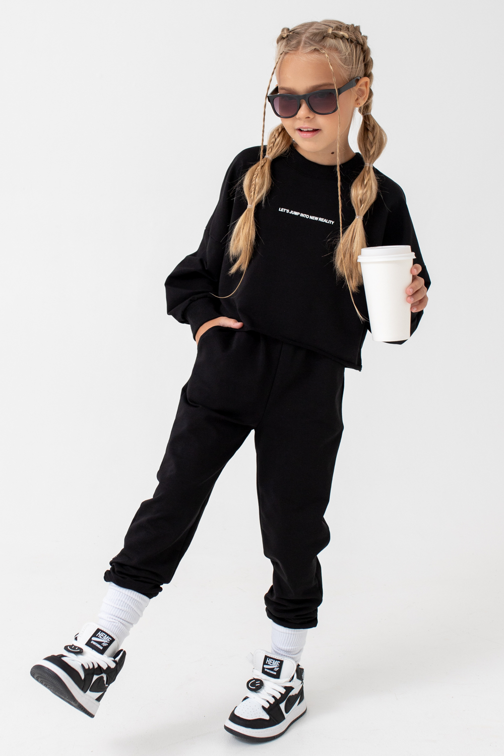 Костюм состоит из свитшота свободного кроя с необработанной линией низа и брюк-джоггеров.