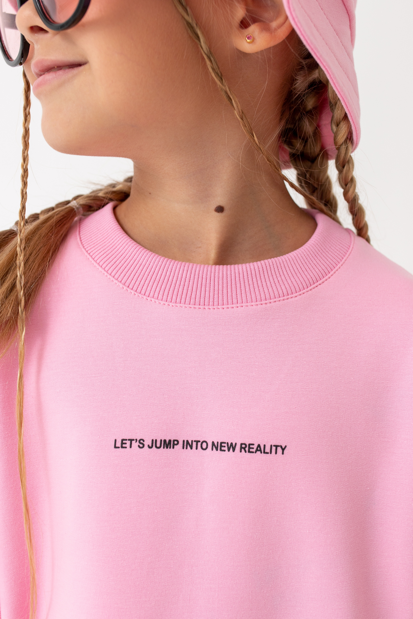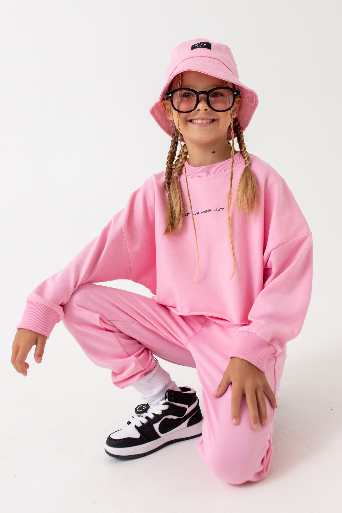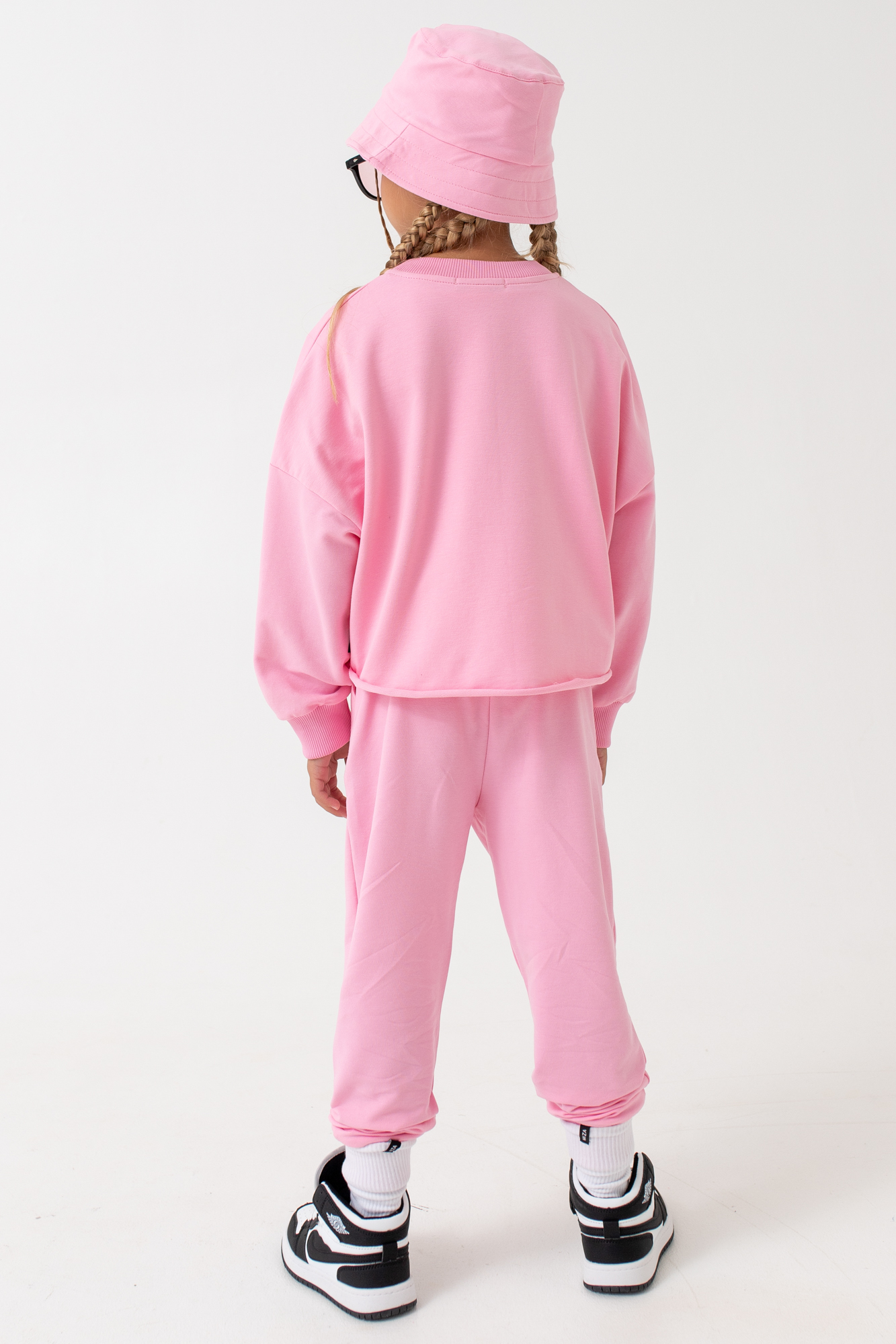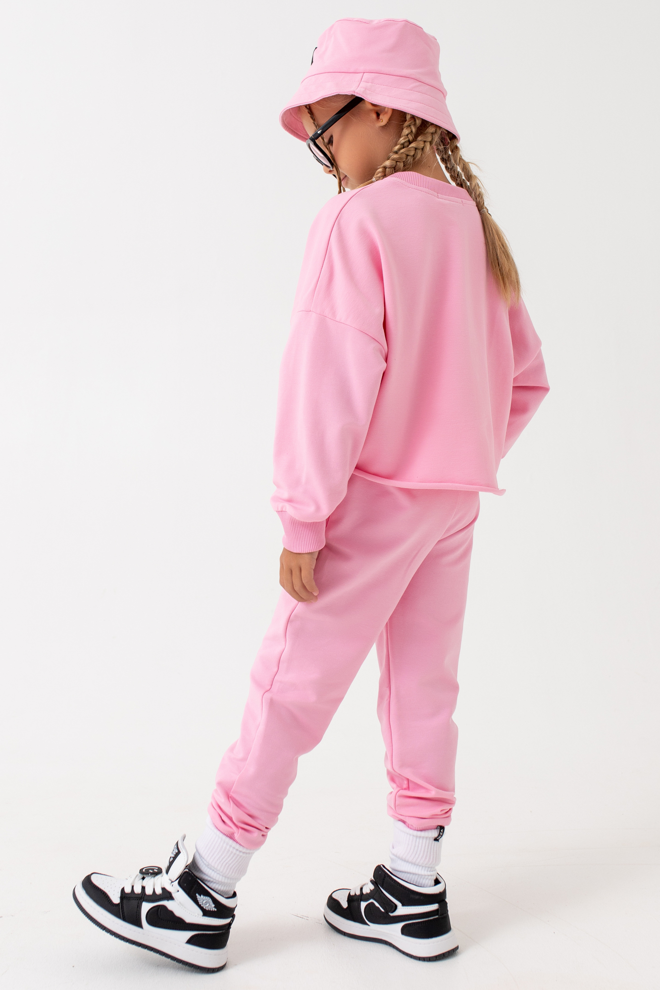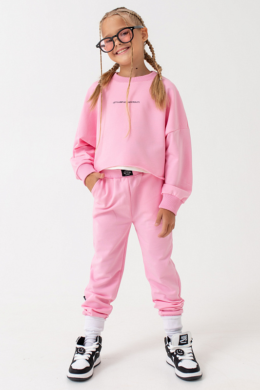 Костюм состоит из свитшота свободного кроя с необработанной линией низа и брюк-джоггеров.