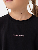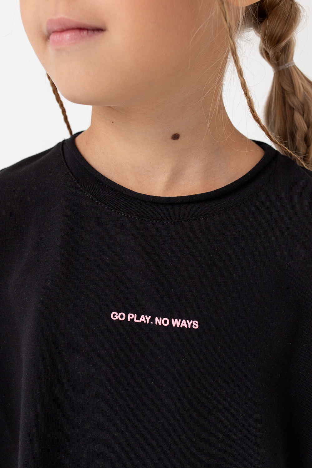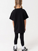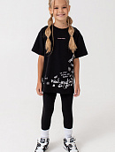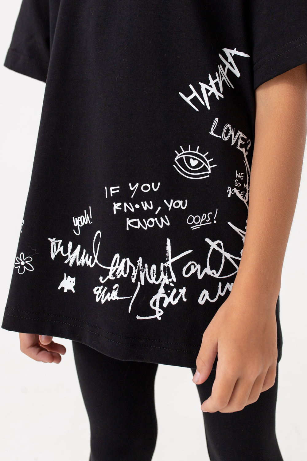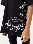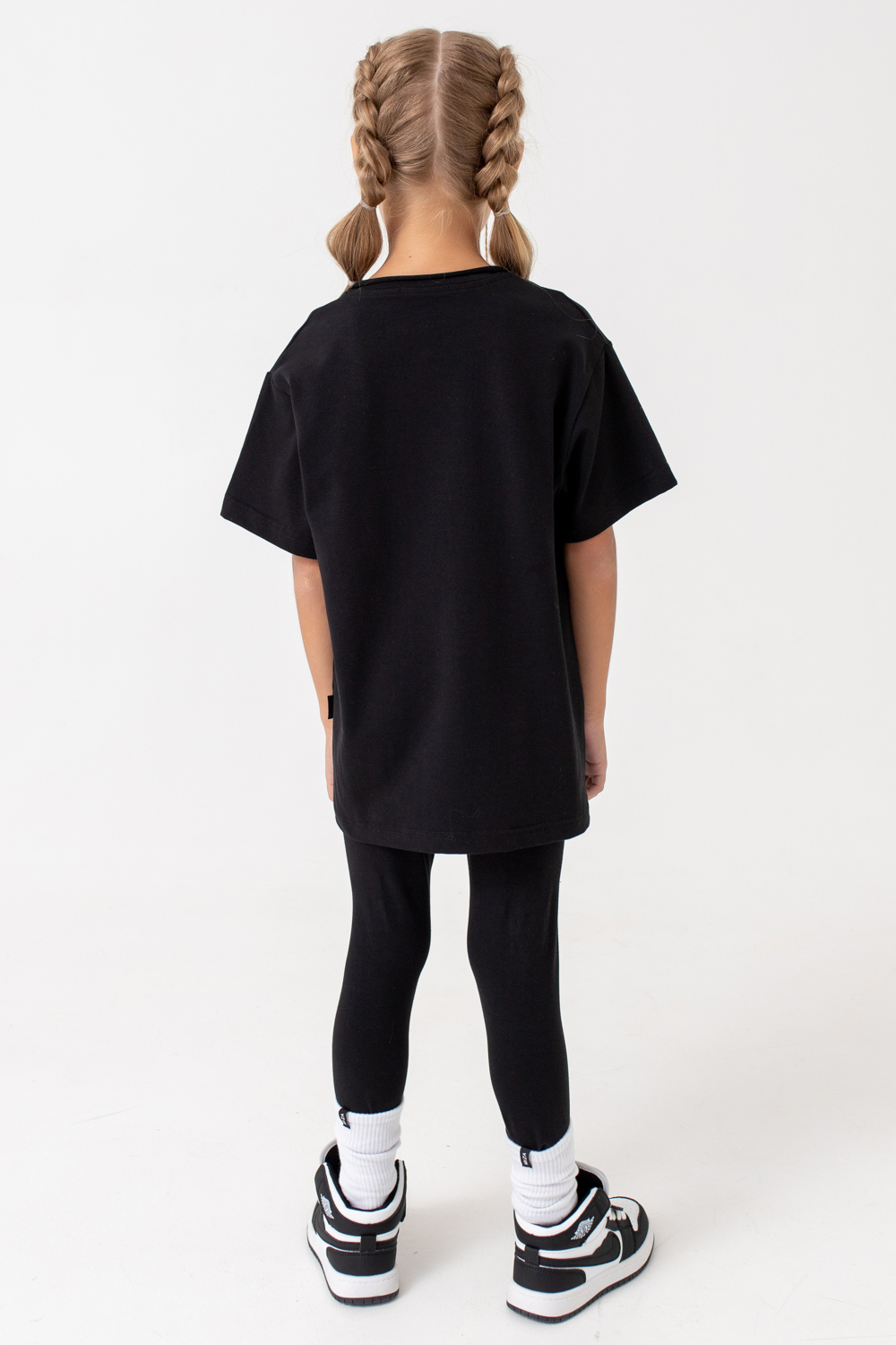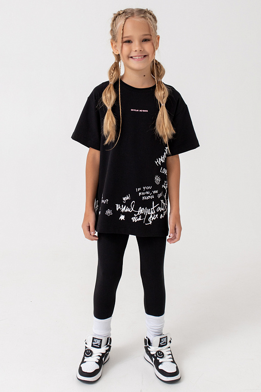 Костюм состоит из удлиненной футболки свободного кроя, оформленной дизайнерским принтом, и лосин базового кроя.
