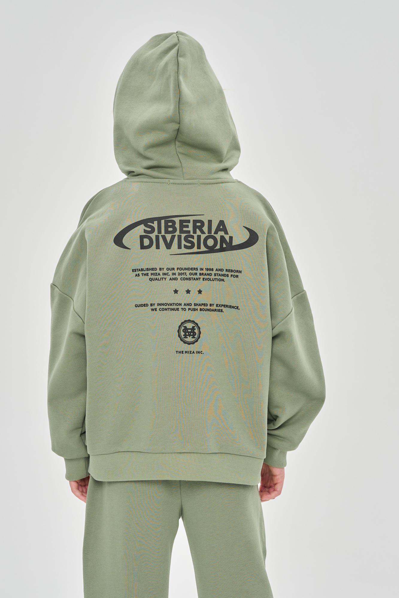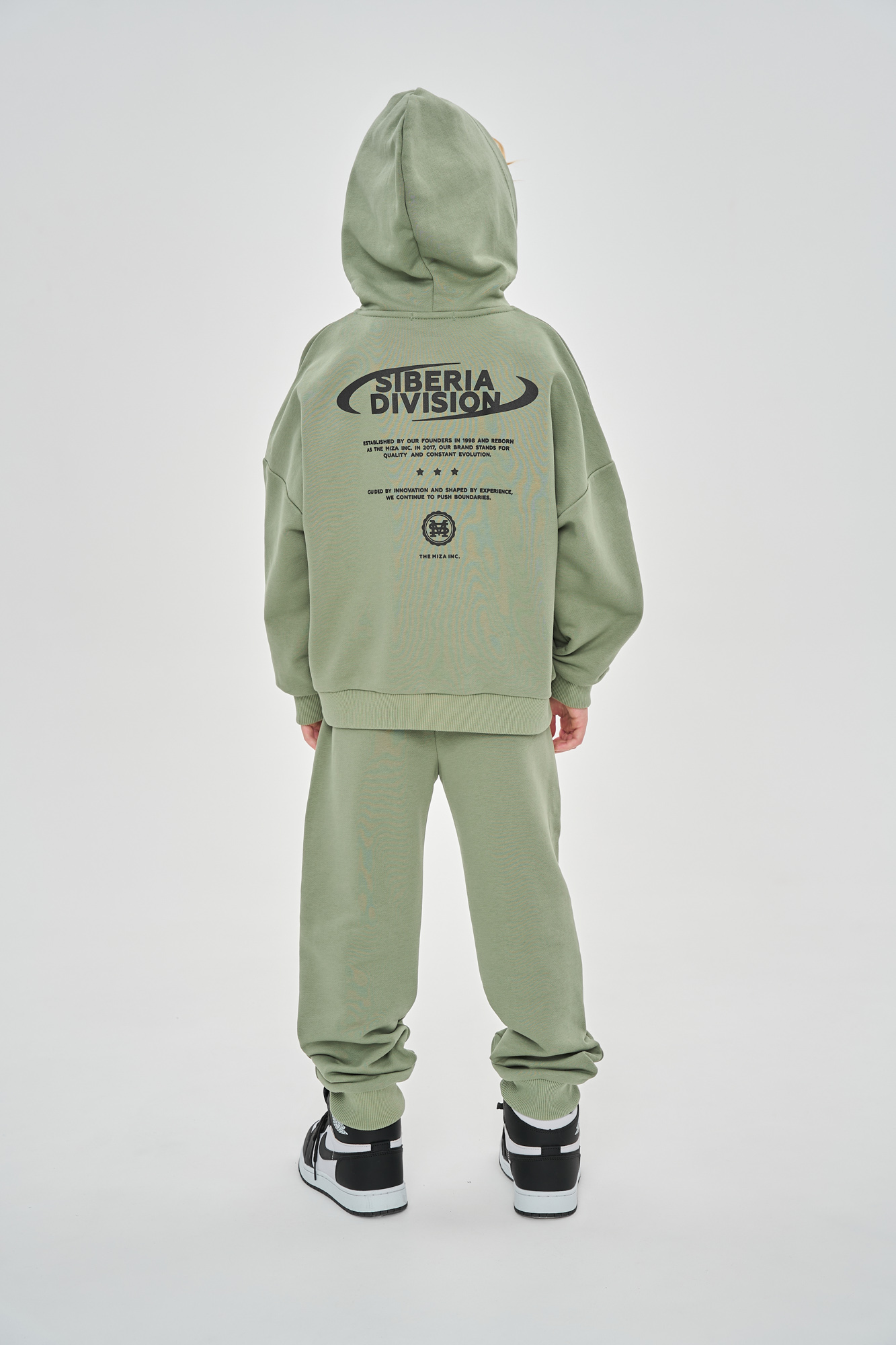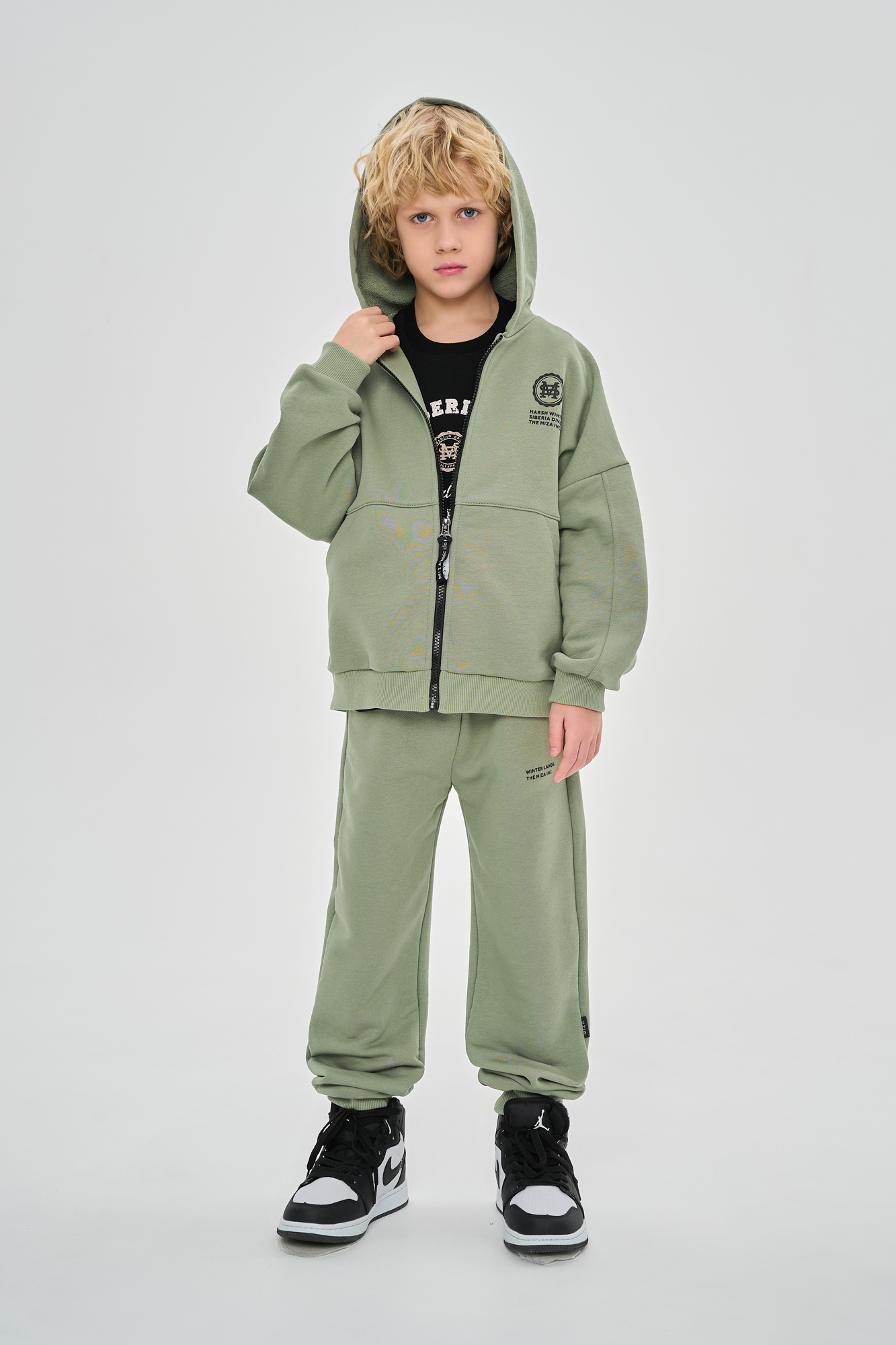 Состоит из худи свободного кроя и джоггеров, с манжетой из кашкорсе по низу.