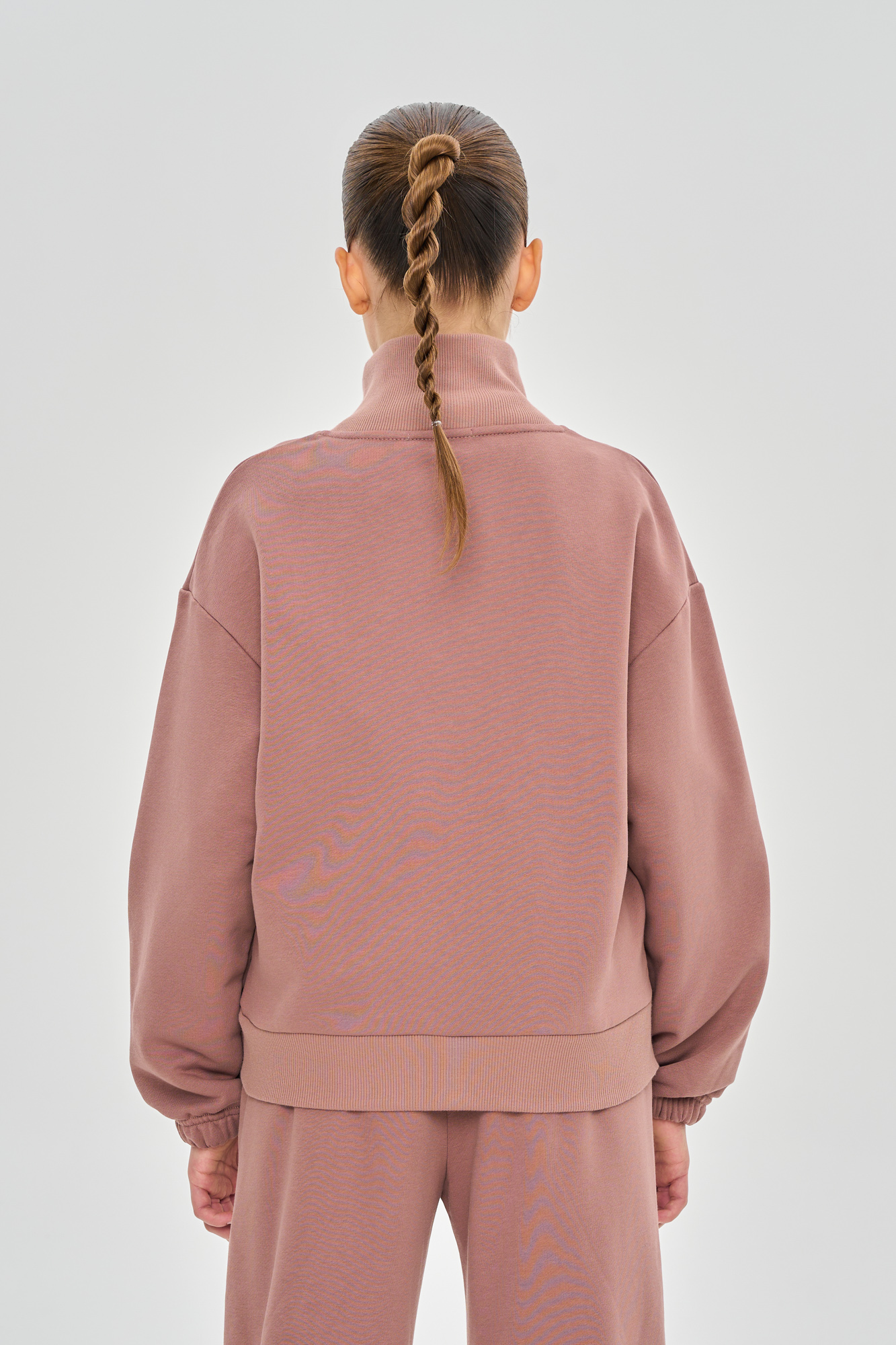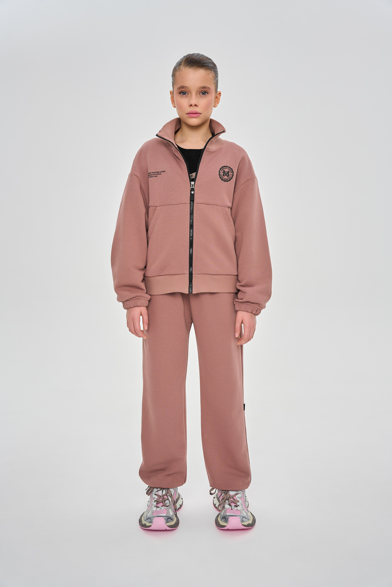 Состоит из свитшота на молнии свободного кроя с воротником-стойкой и джоггеров, с манжетой из кашкорсе по низу.