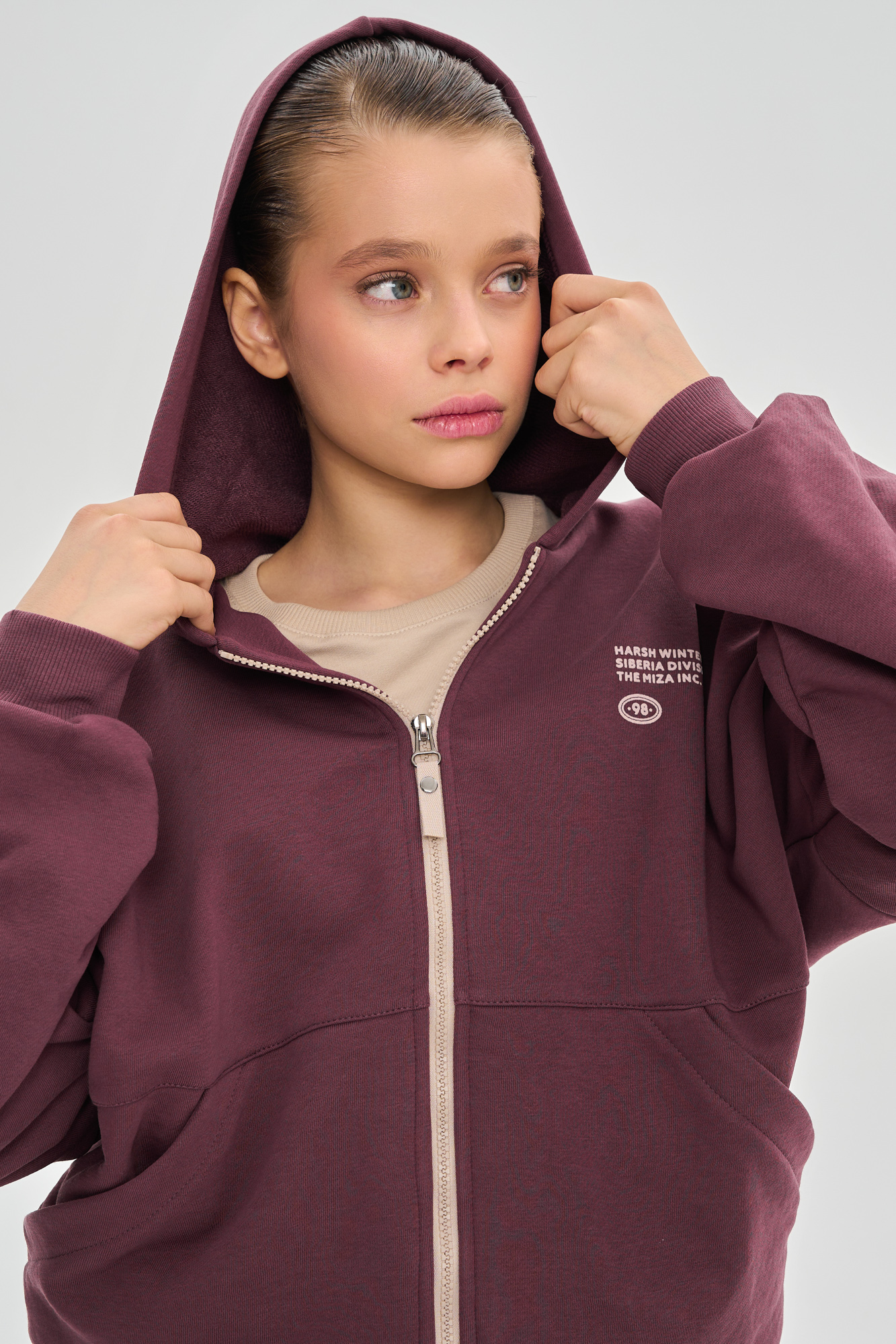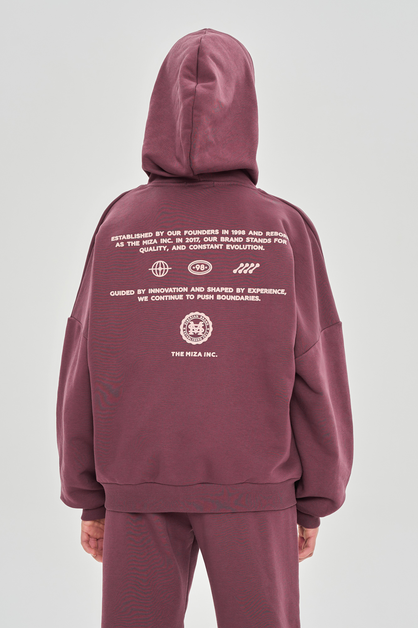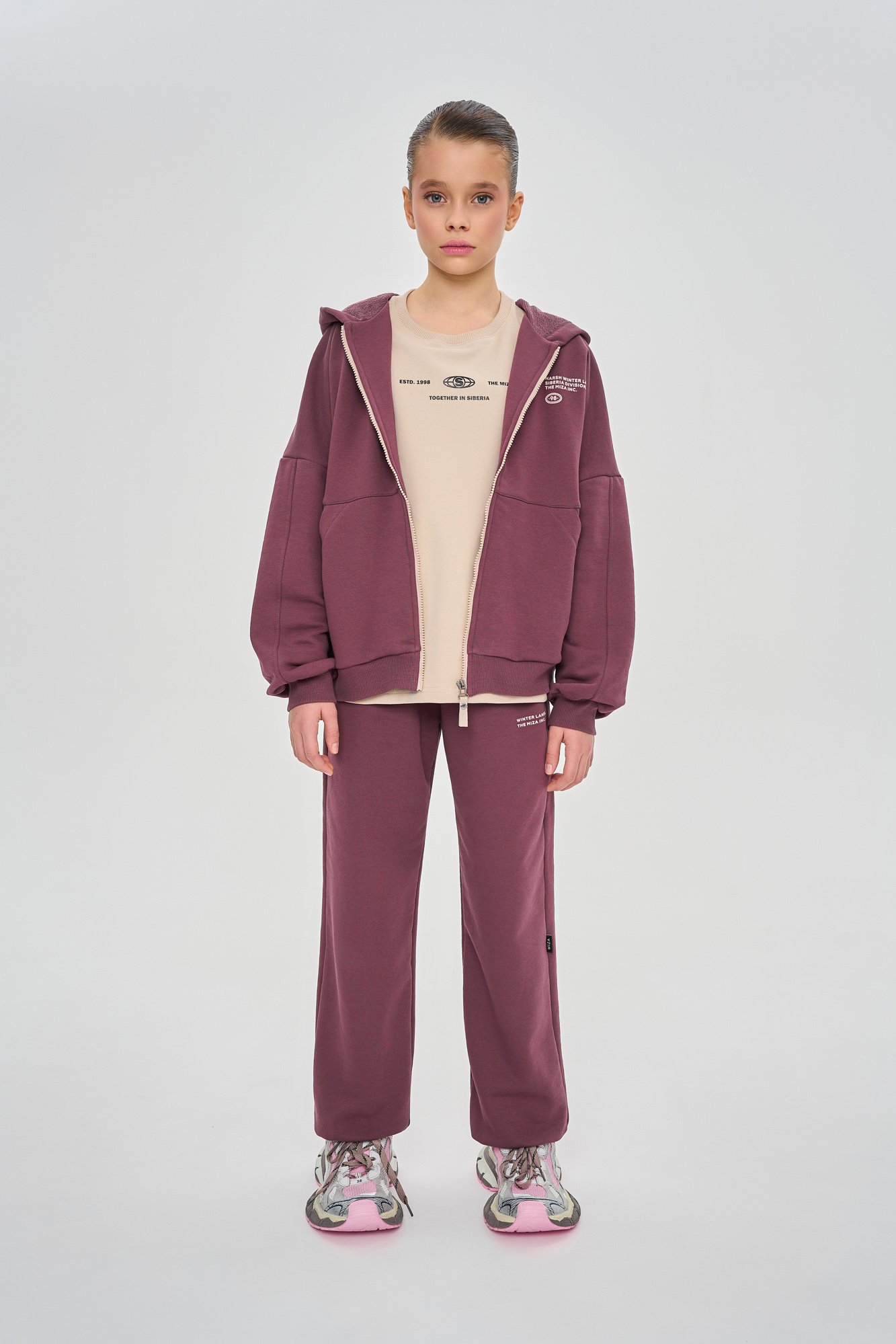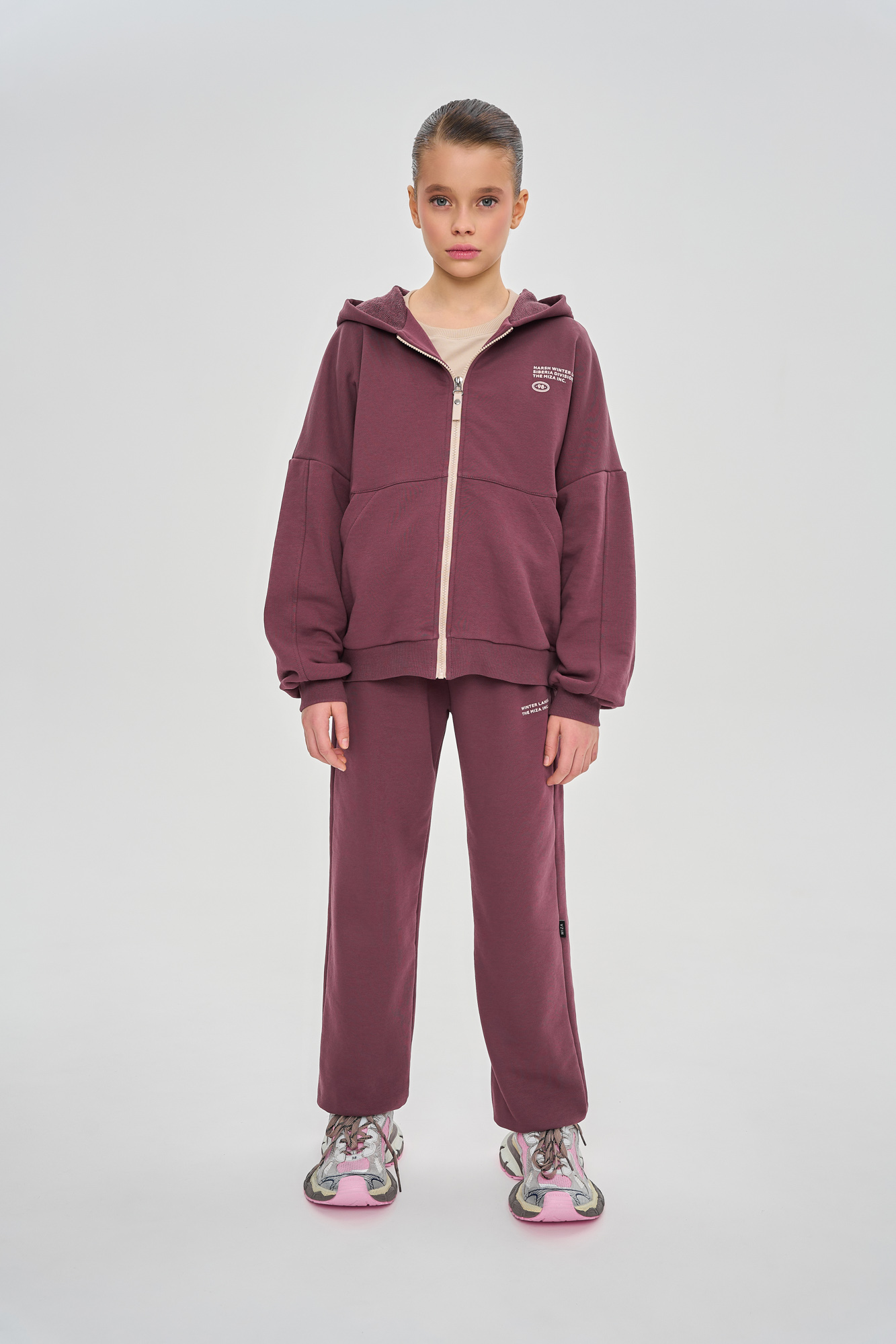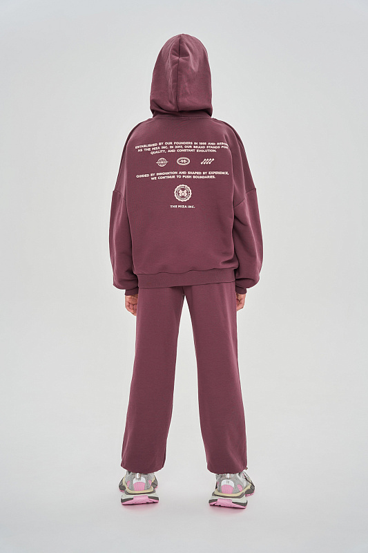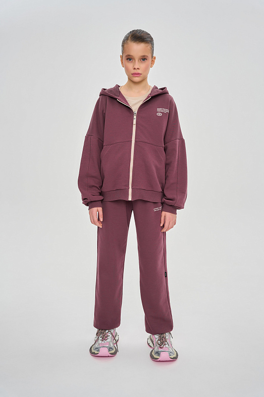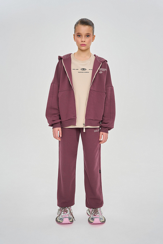 Состоит из худи сободного кроя и джоггеров, с манжетой из кашкорсе по низу.