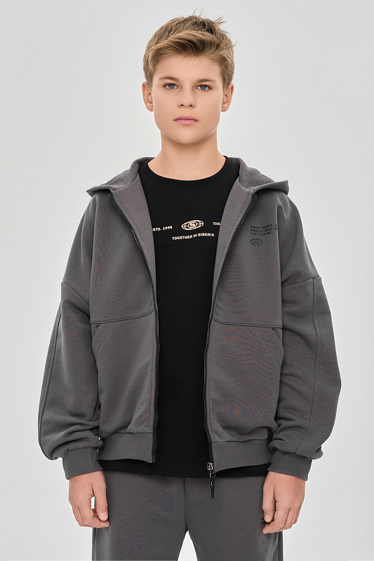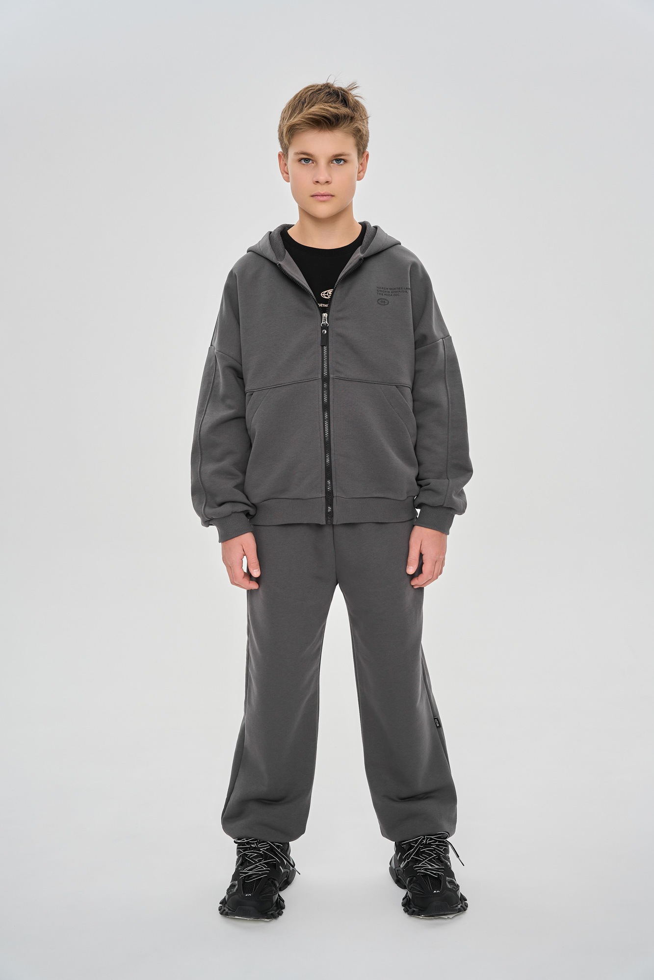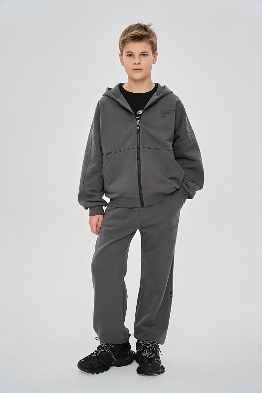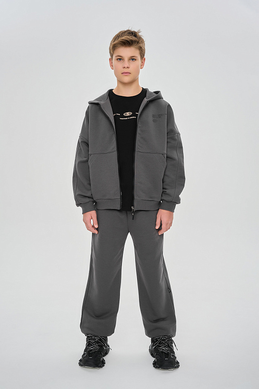 Состоит из худи сободного кроя и джоггеров, с манжетой из кашкорсе по низу.