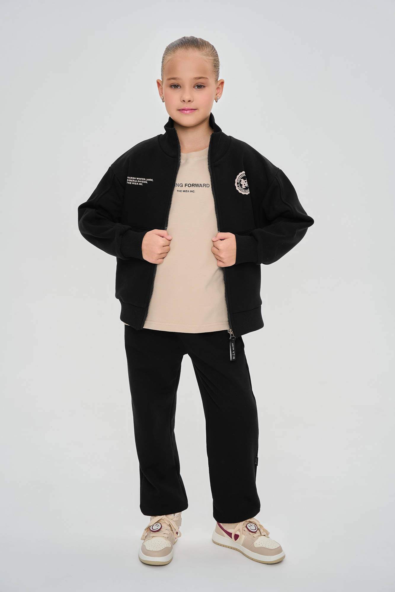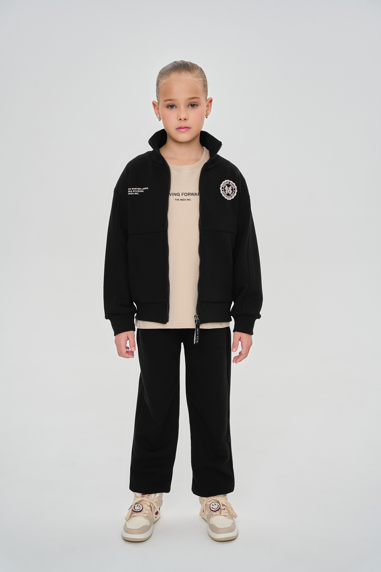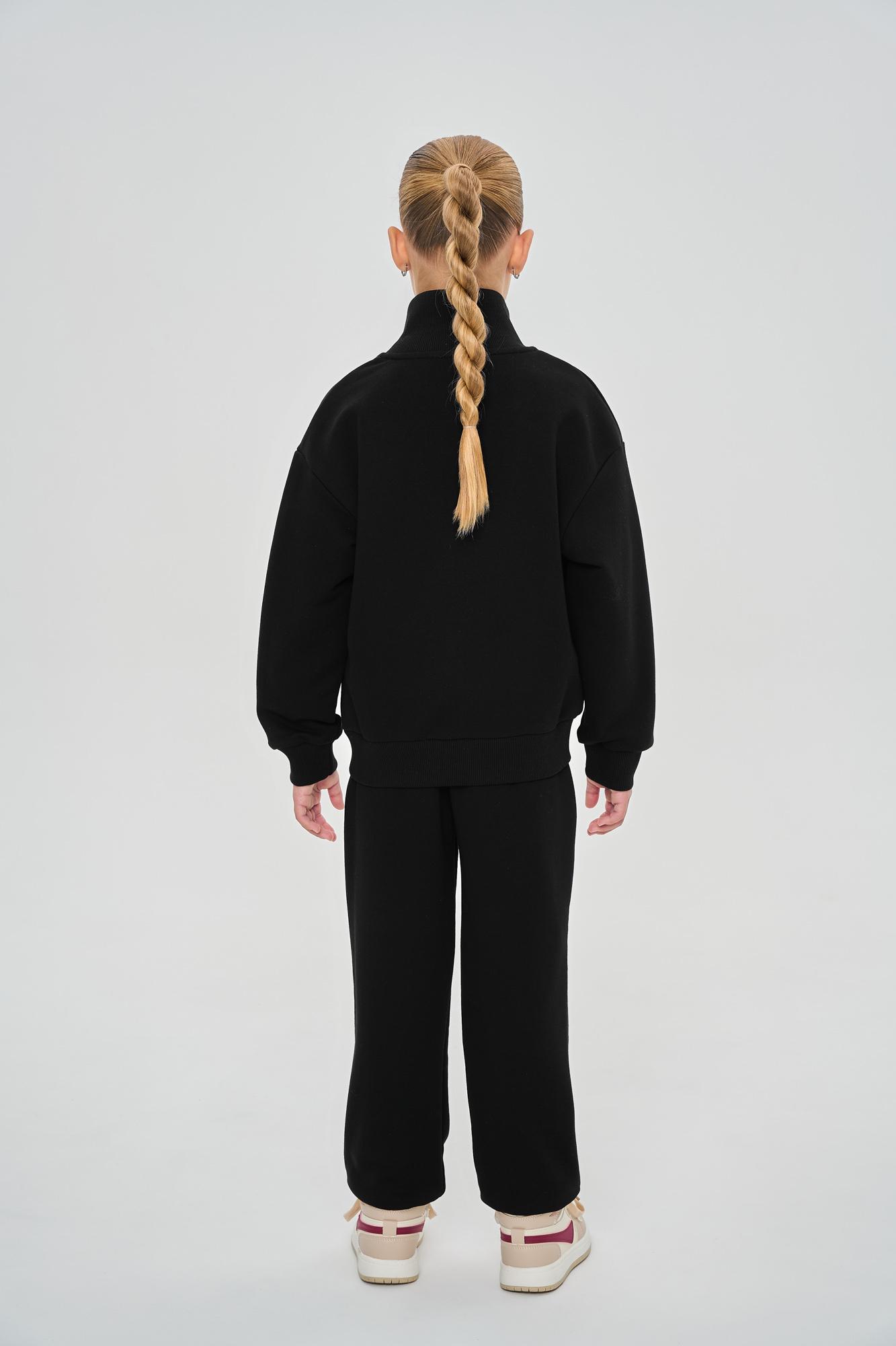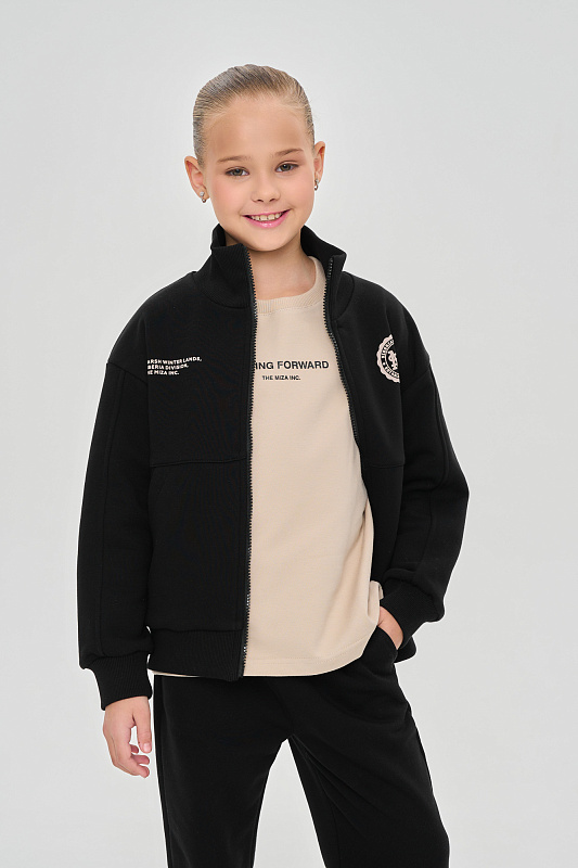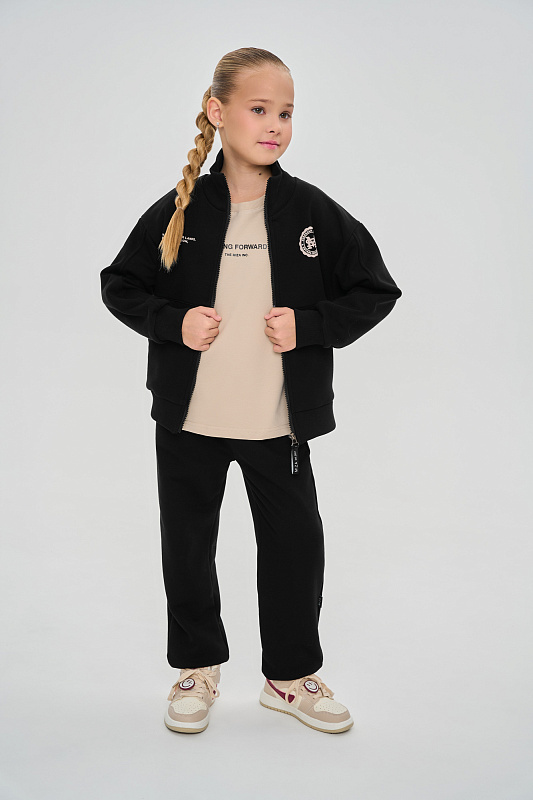 Состоит из свитшота на молнии свободного кроя с воротником-стойкой и джоггеров, с манжетой из кашкорсе по низу.