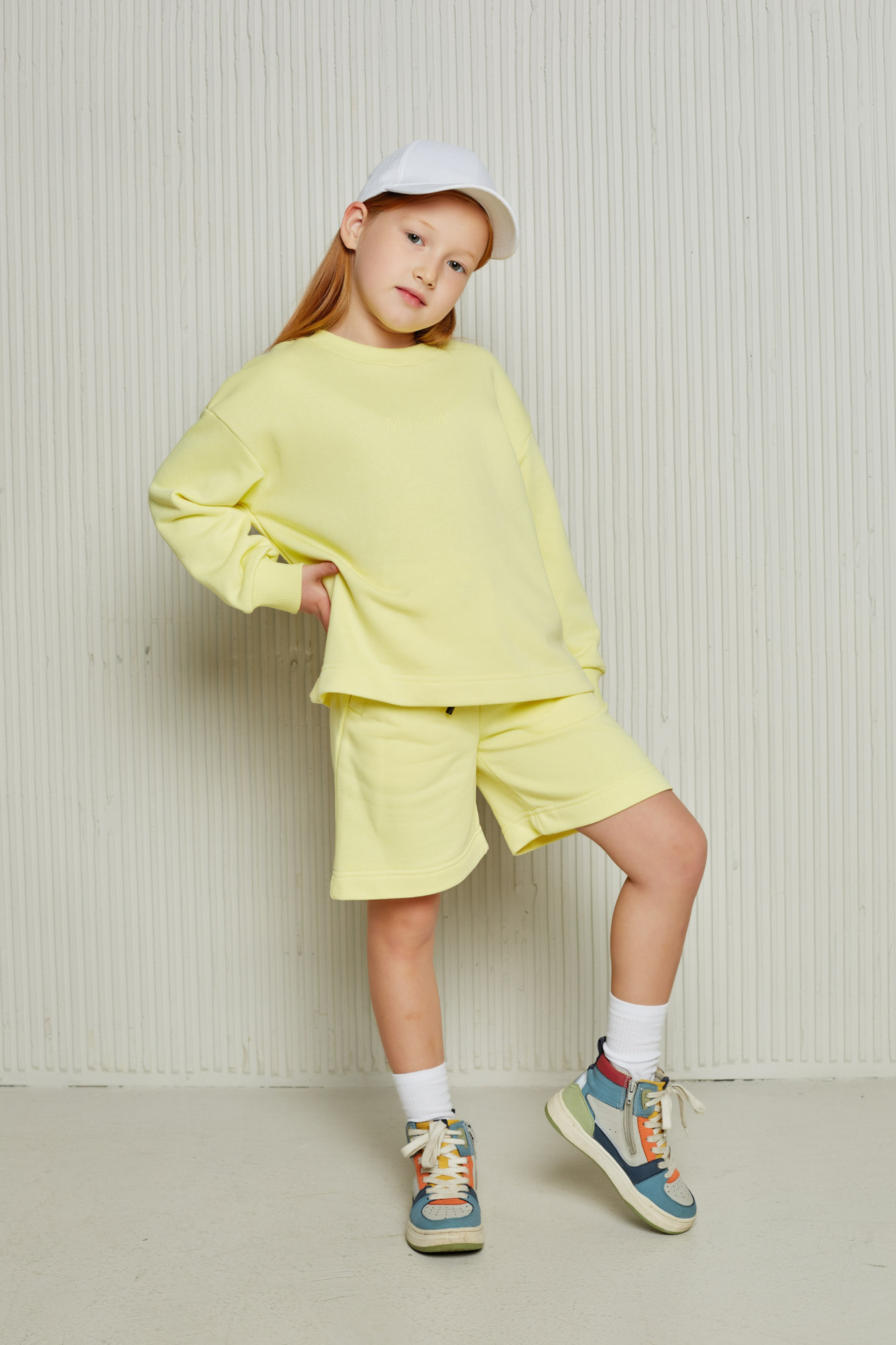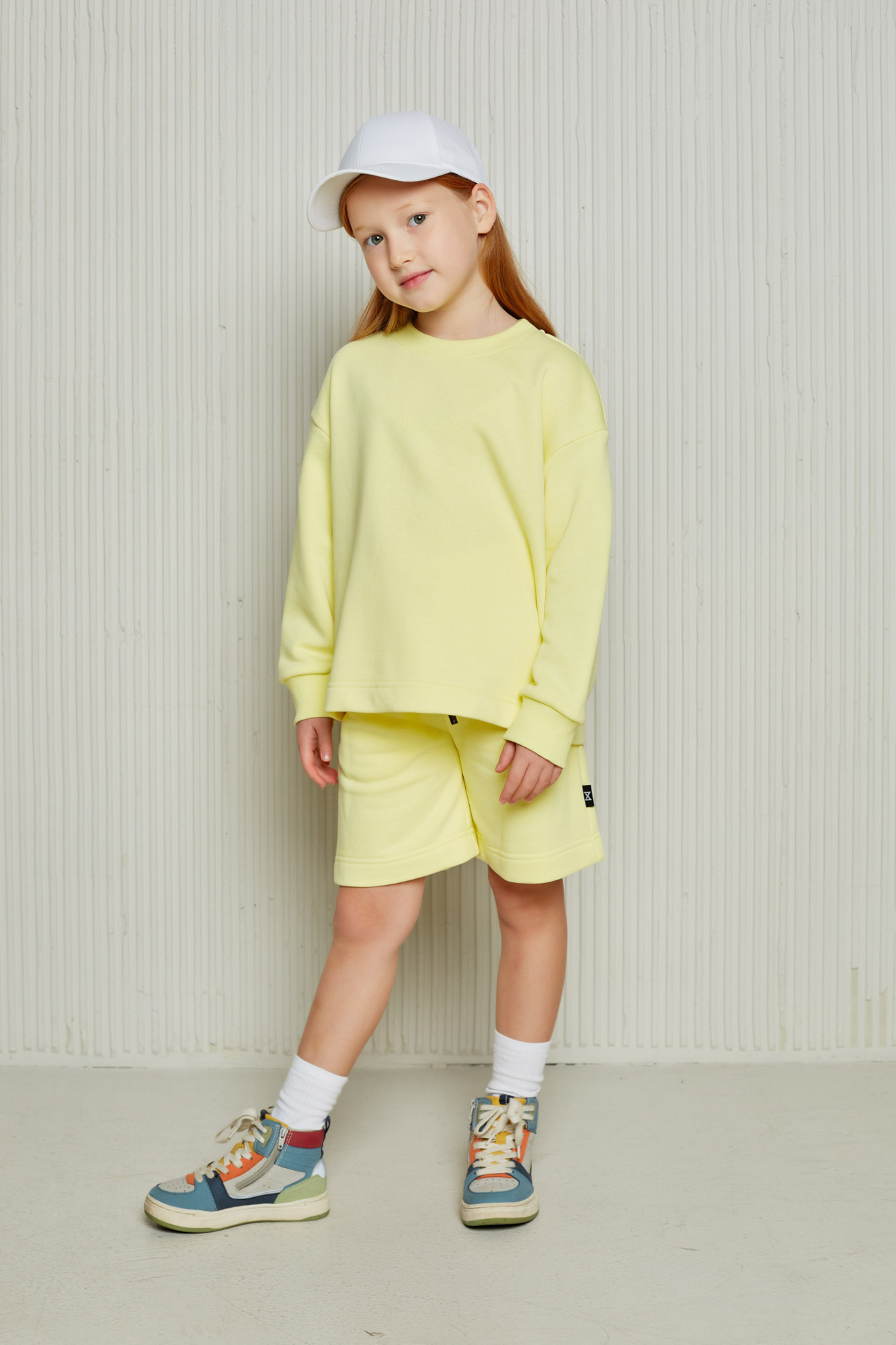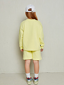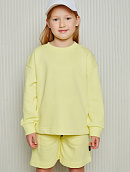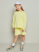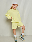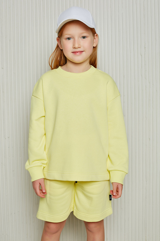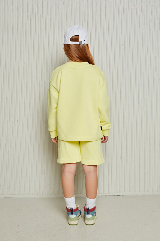 Состоит из свободного свитшота с имитацией необработанного края и прямых широких шорт на мягком эластичном поясе со шнурком.