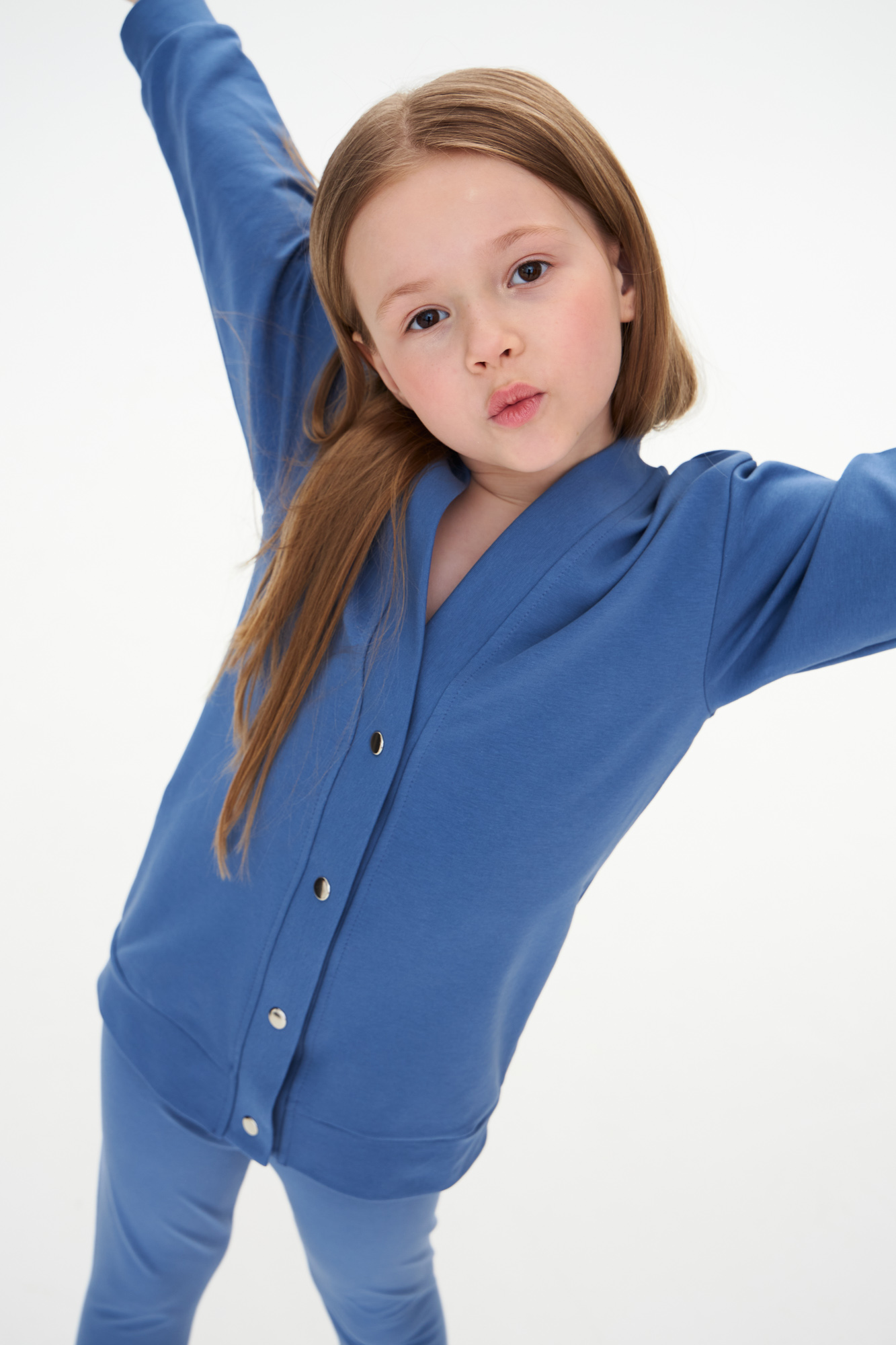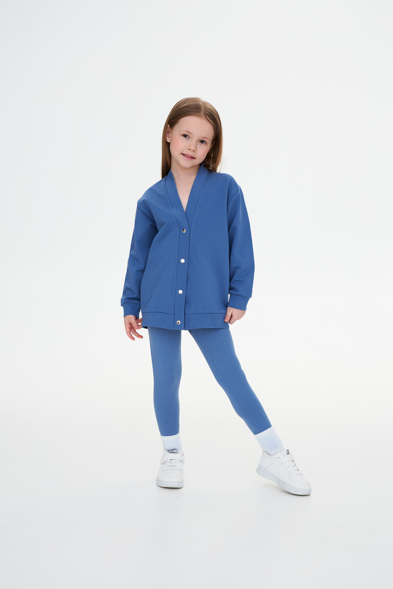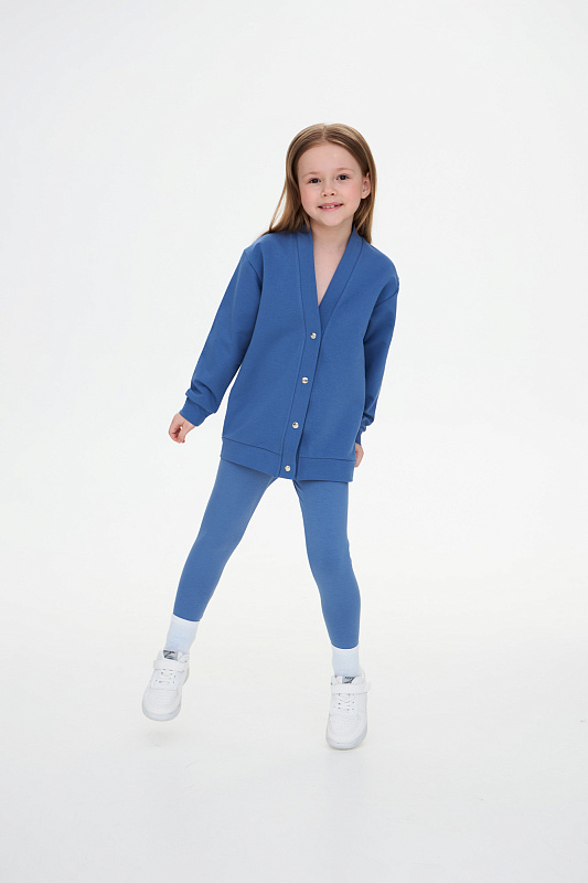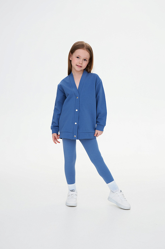 Комплект состоит из кардигана с застежкой на металлические кнопки и базовых леггинсов.