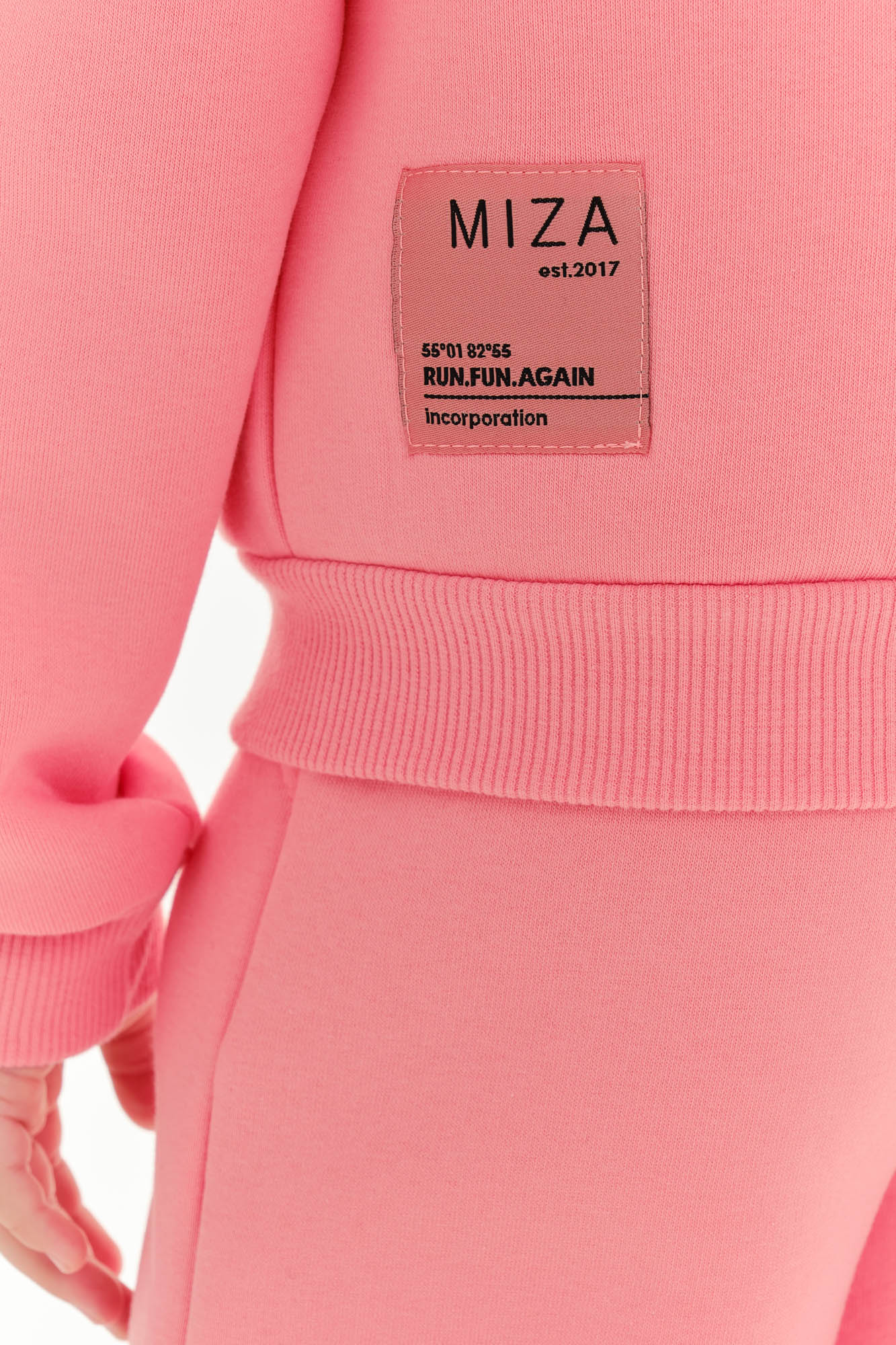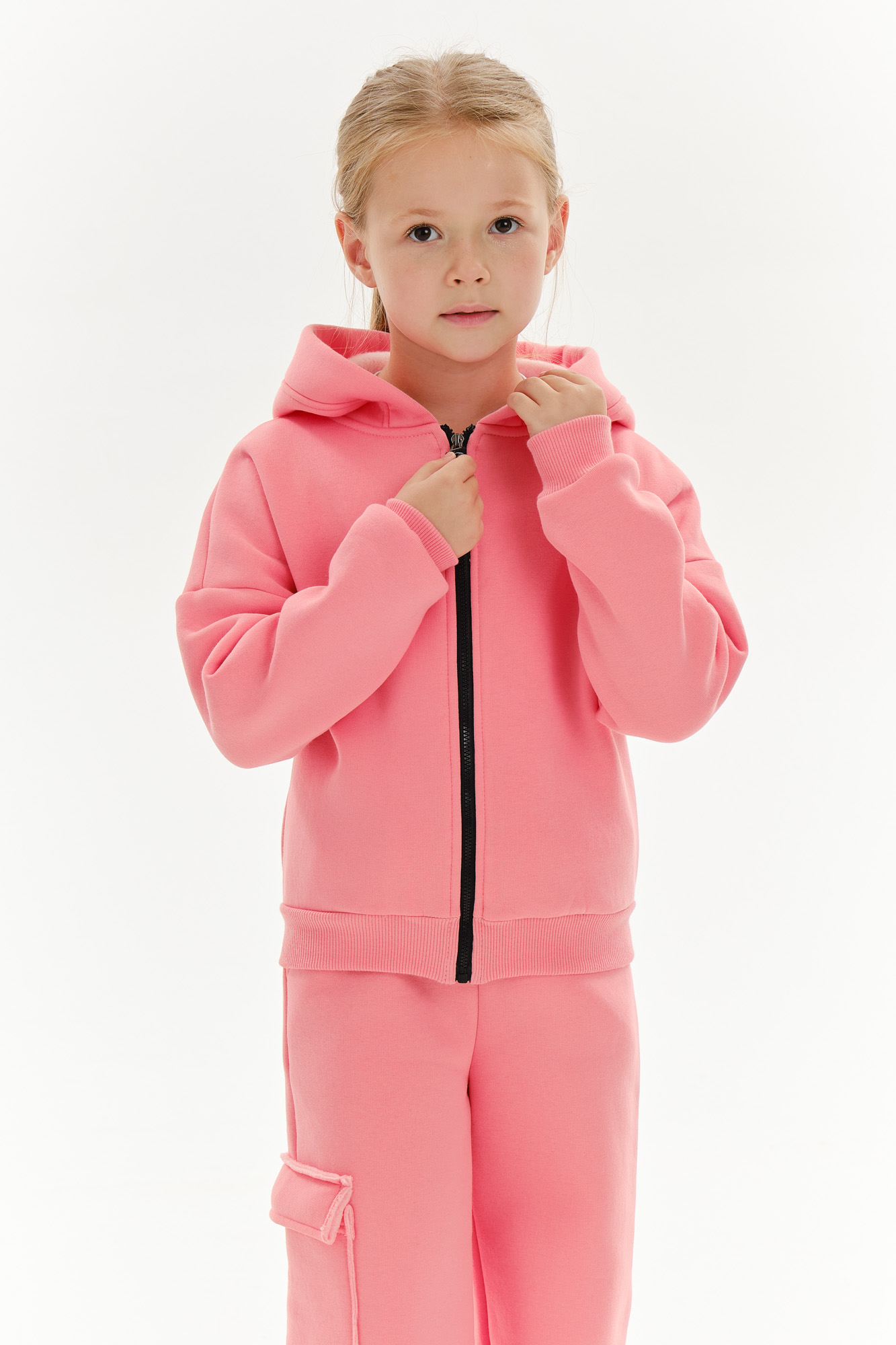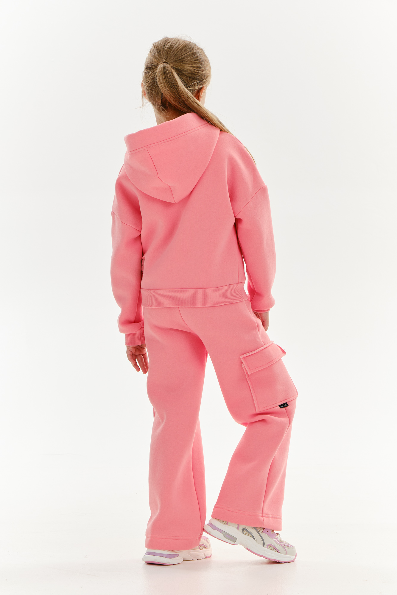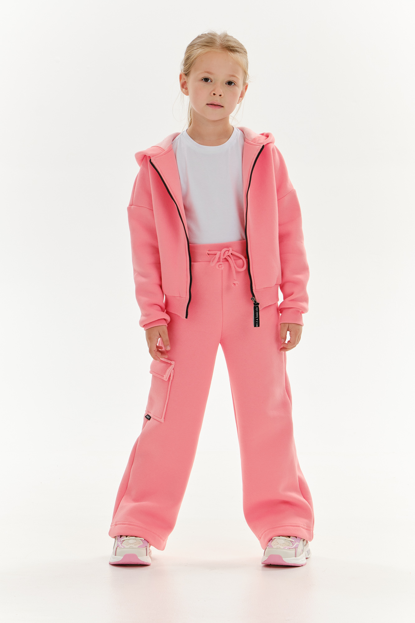 Состоит из укороченного худи на замке и широких брюк с накладным карманом на одной стороне.