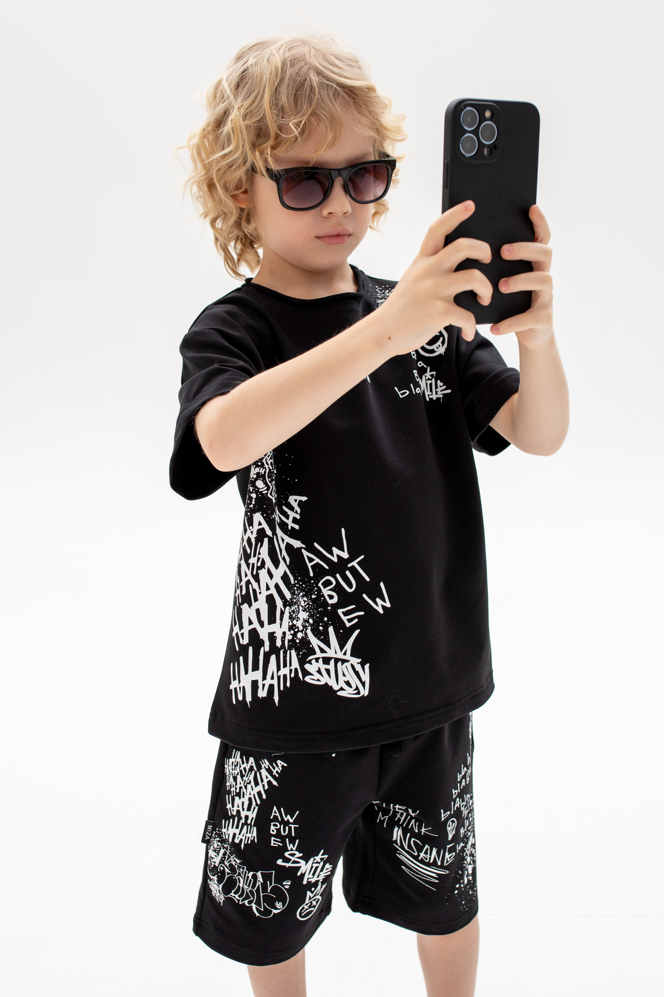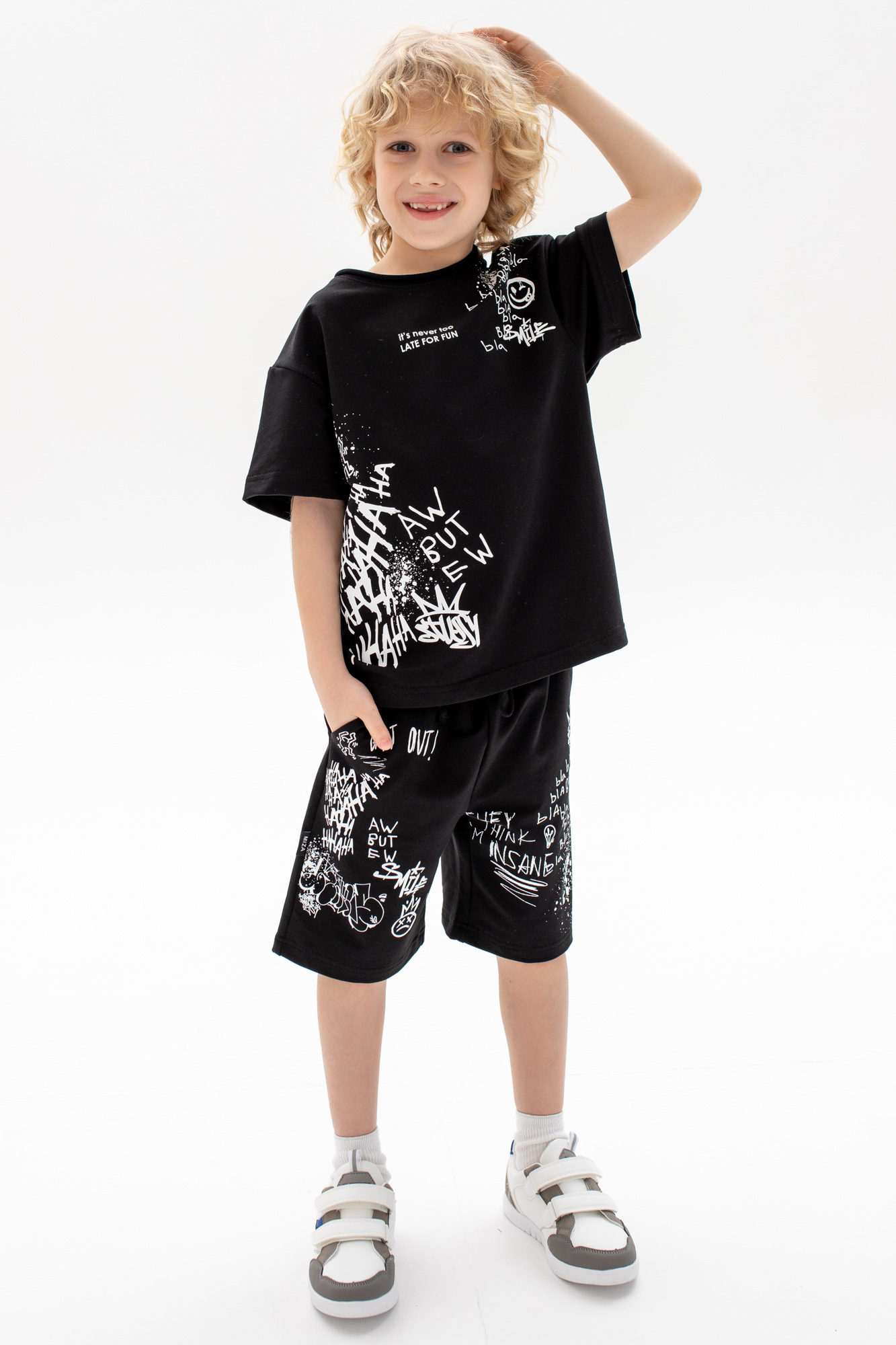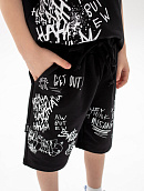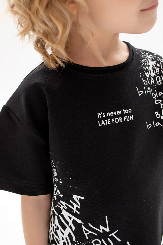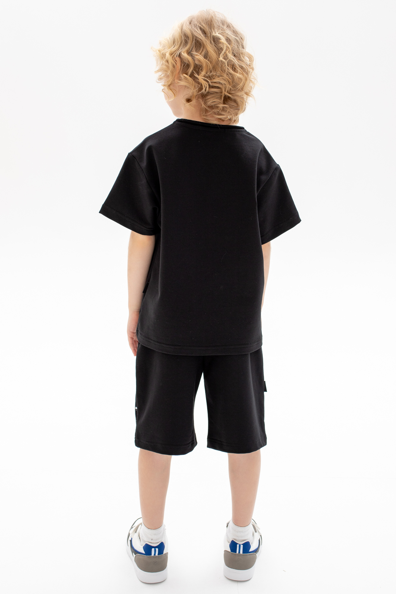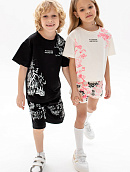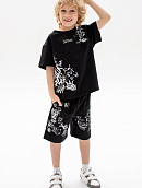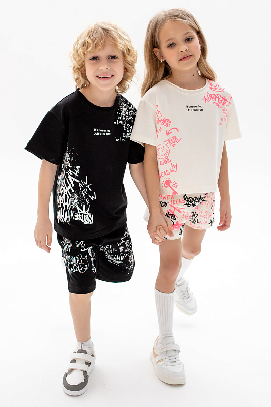 Состоит из футболки свободного кроя и прямых шорт с