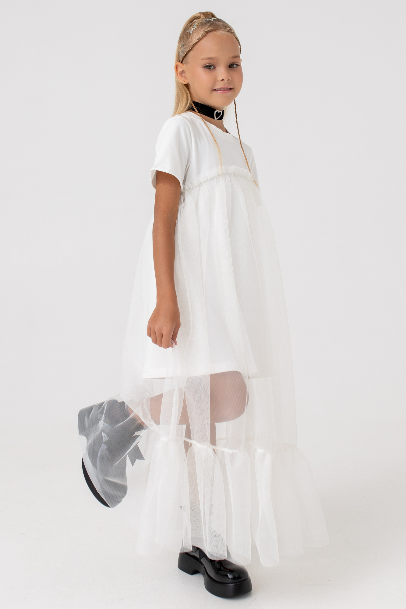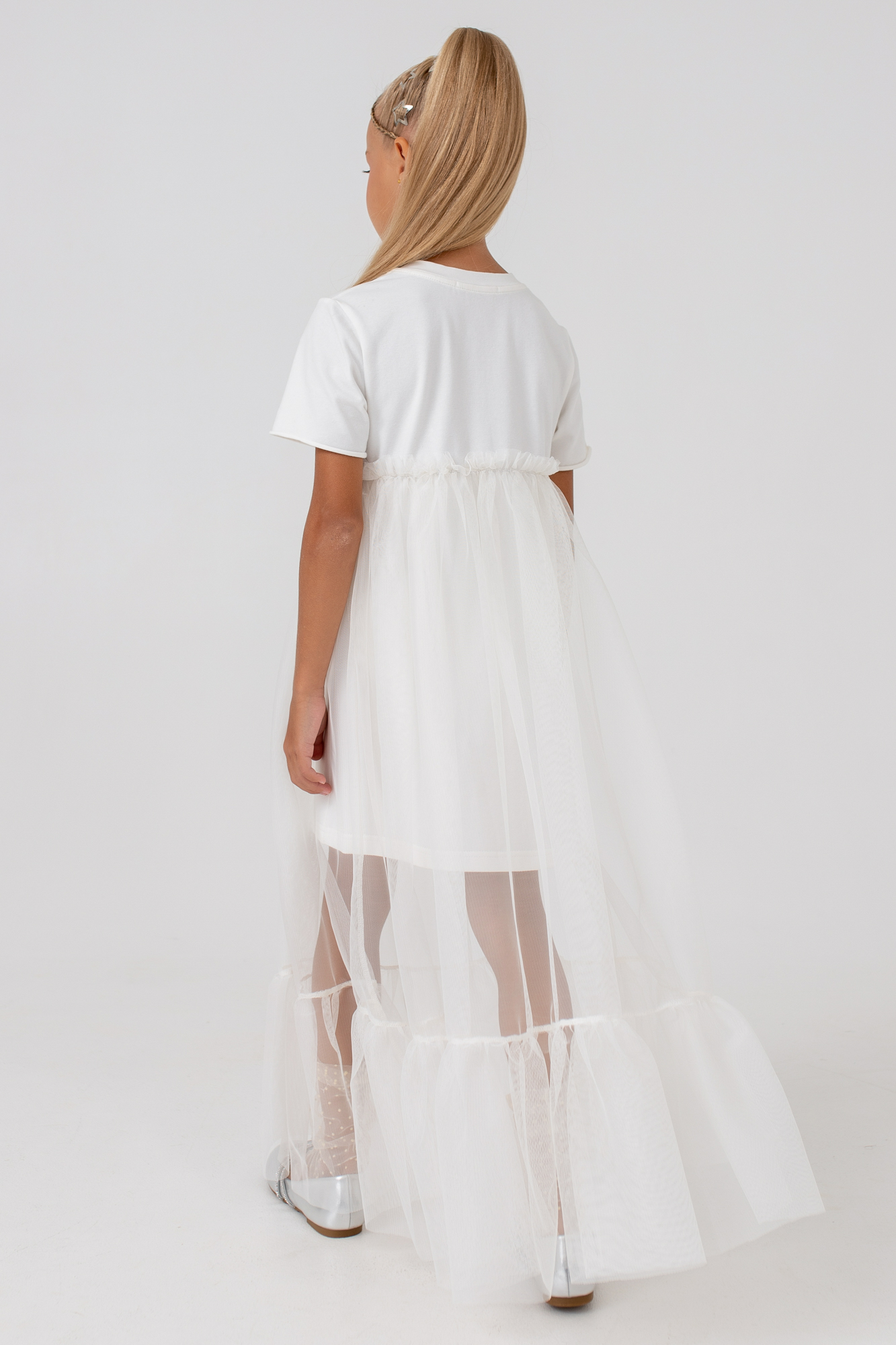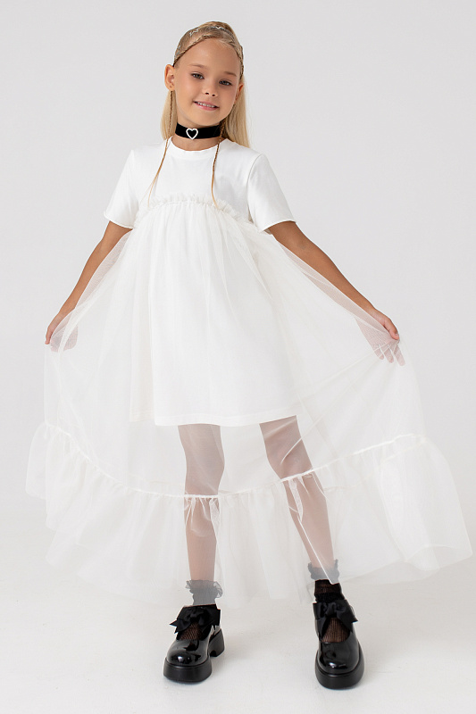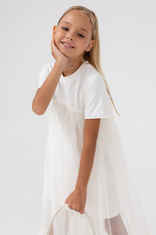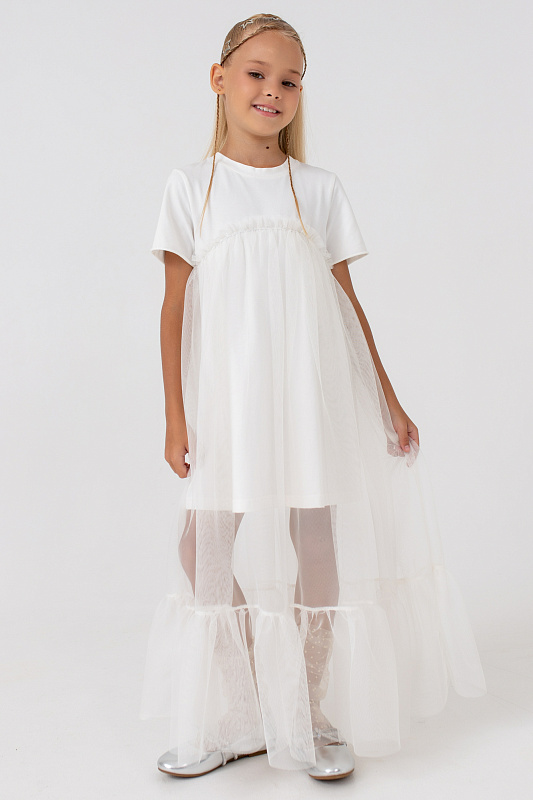 Платье-футболка А-силуэта с удлиненной сеткой.