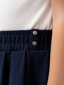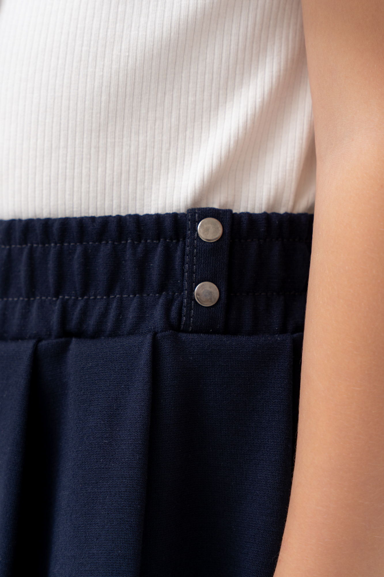 Пояс на эластичной резине, оформлен отделочными строчками и декоративными пуговицами сбоку.