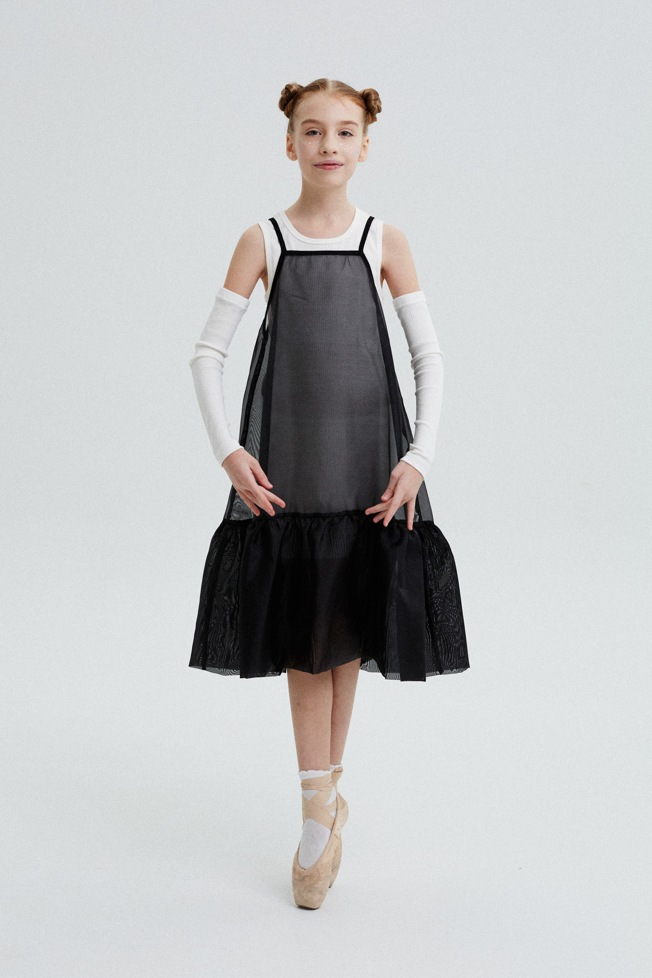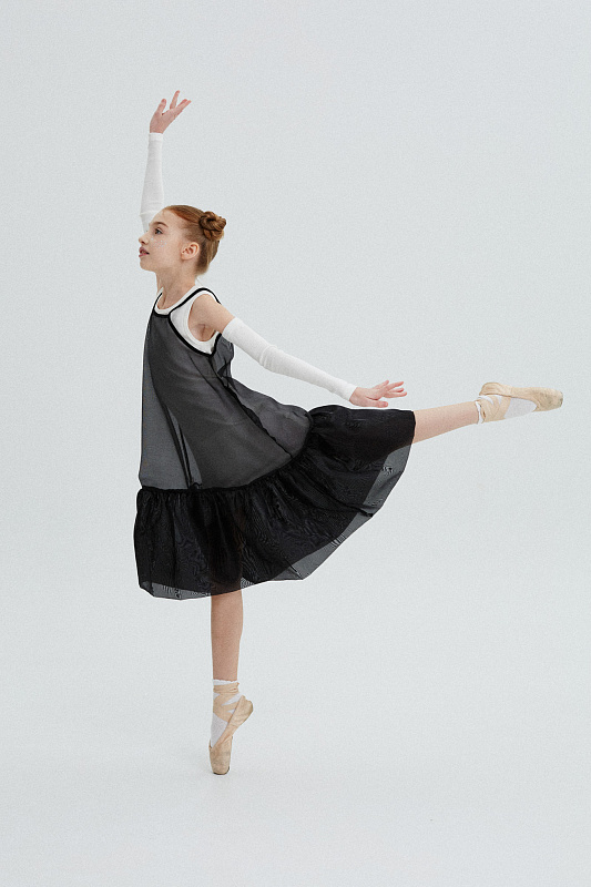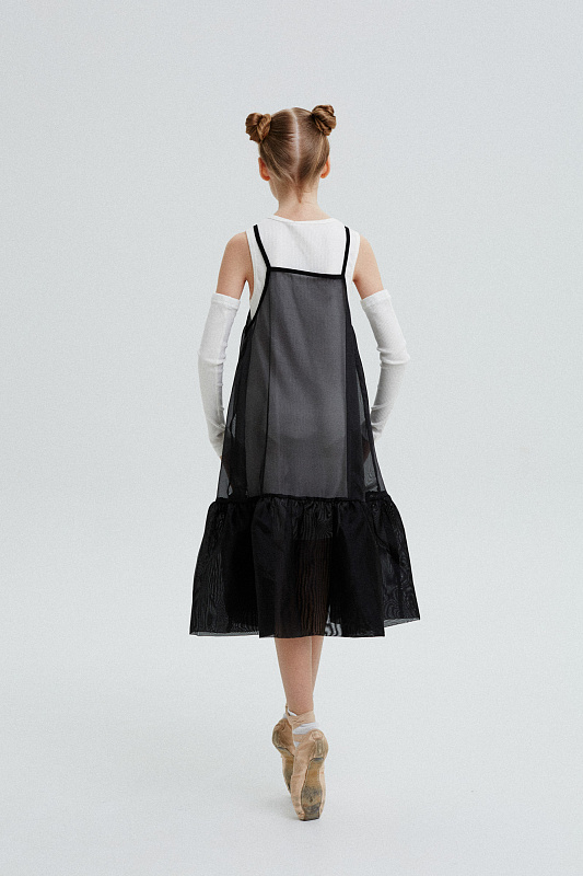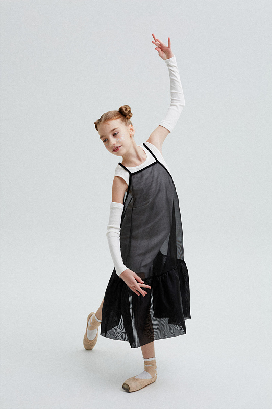 Комплект состоит из основного трикотажного платья-майки со съёмными рукавами и легкого сарафана на бретелях из воздушного капрона.