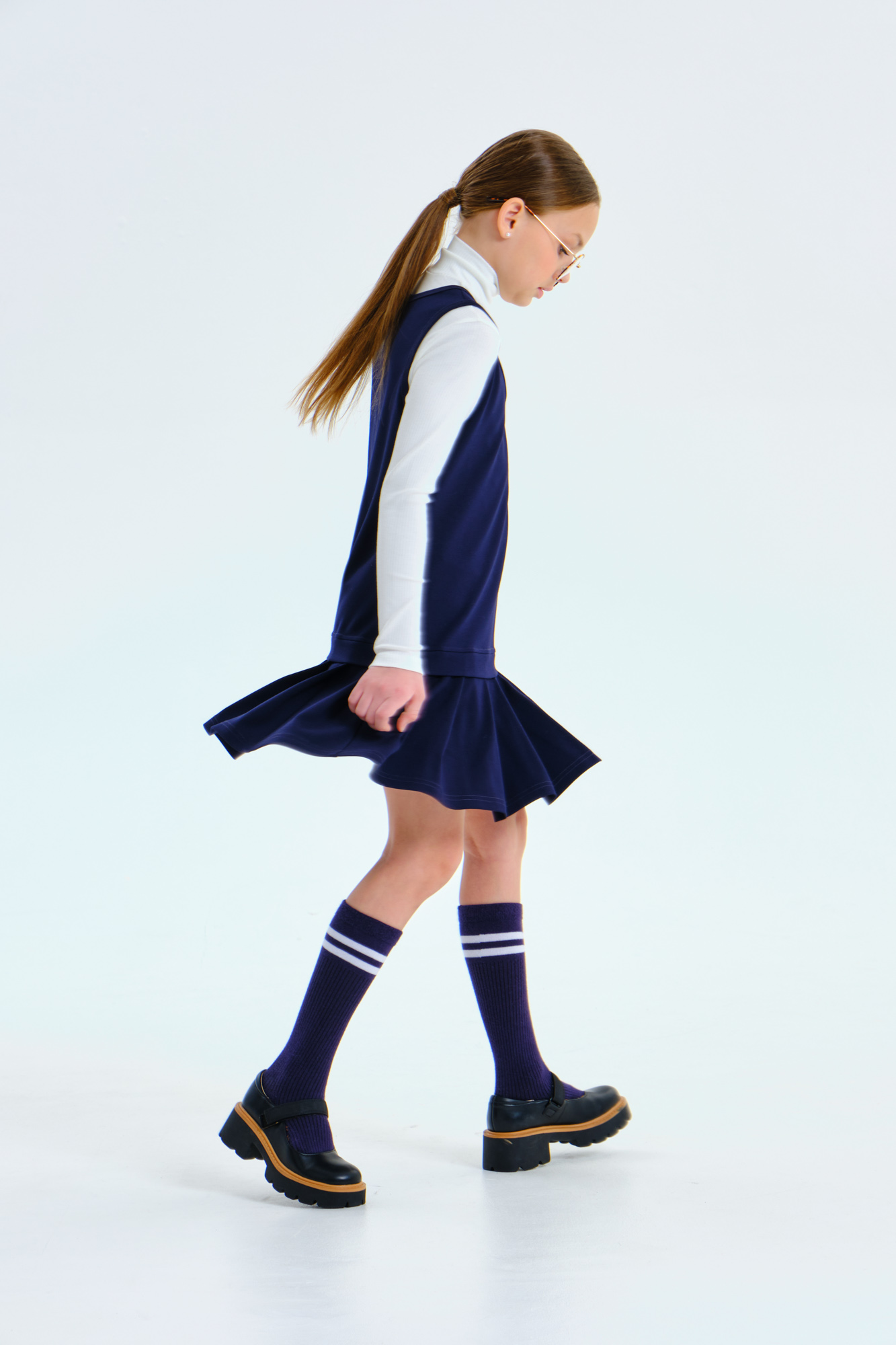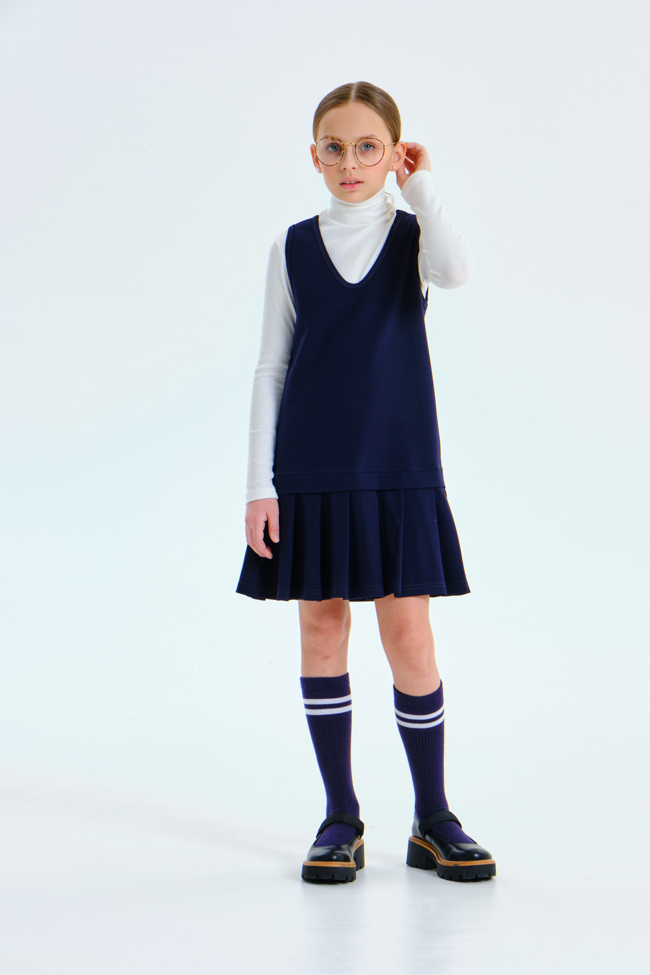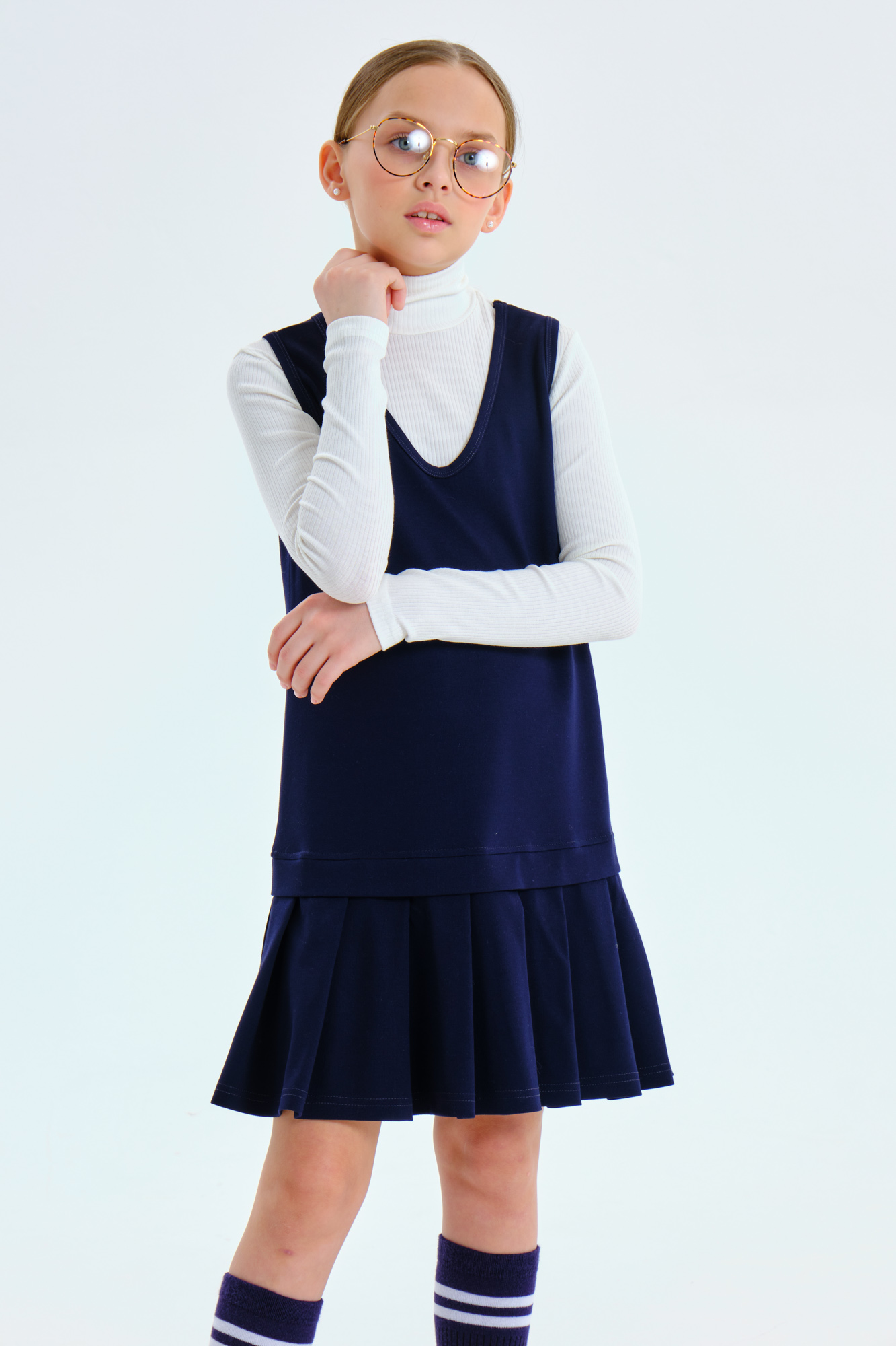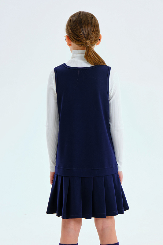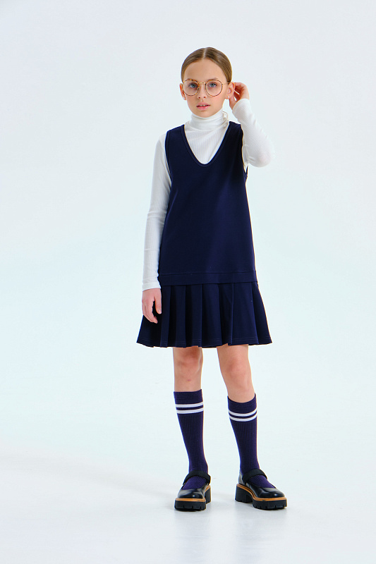 Сарафан А-силуэта с имитацией юбки со складками, выполнен из мягкого плотного трикотажа с гладкой поверхностью, который не мнётся, не закатывается и долго сохраняет свой первоначальный вид.