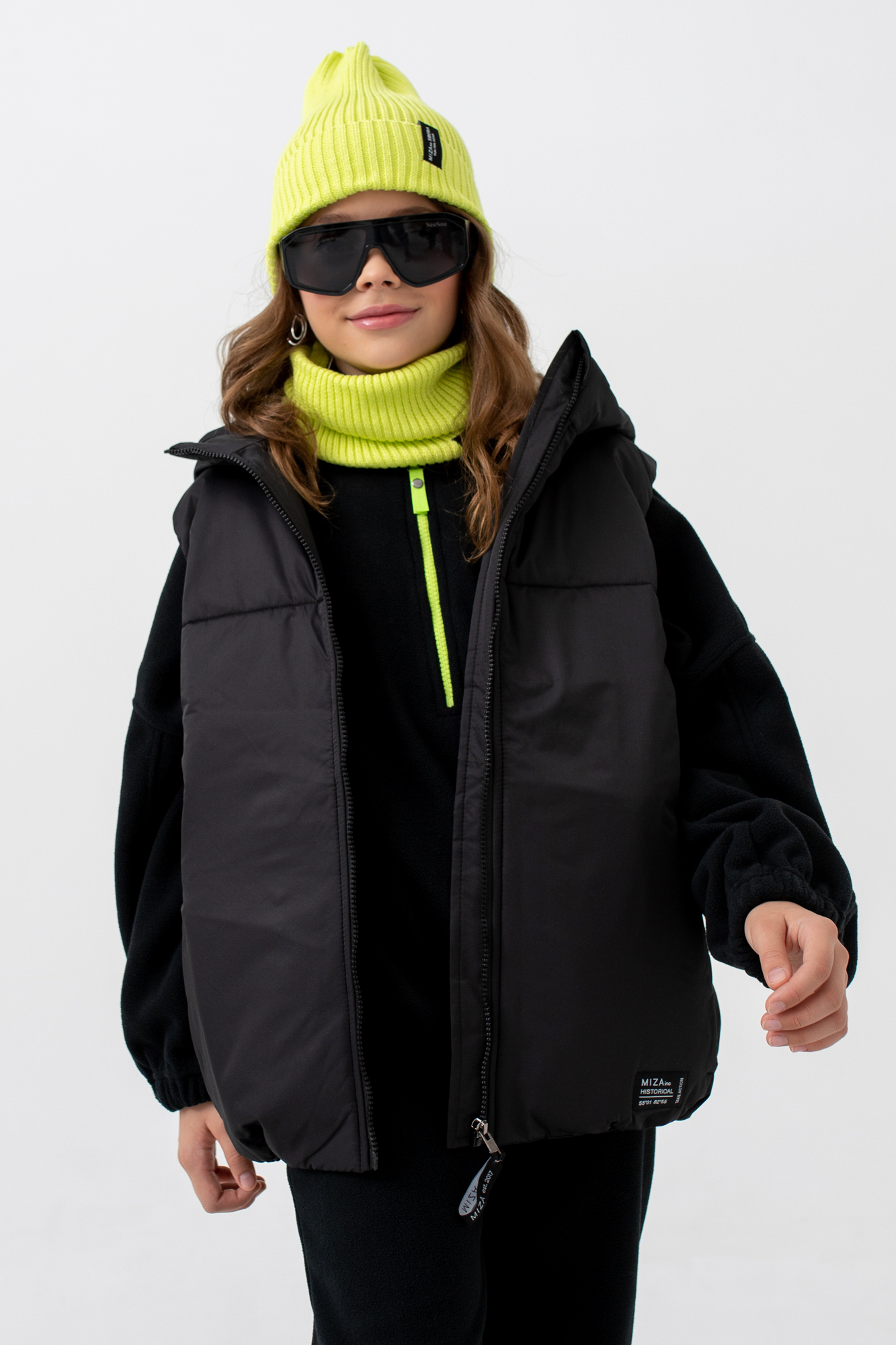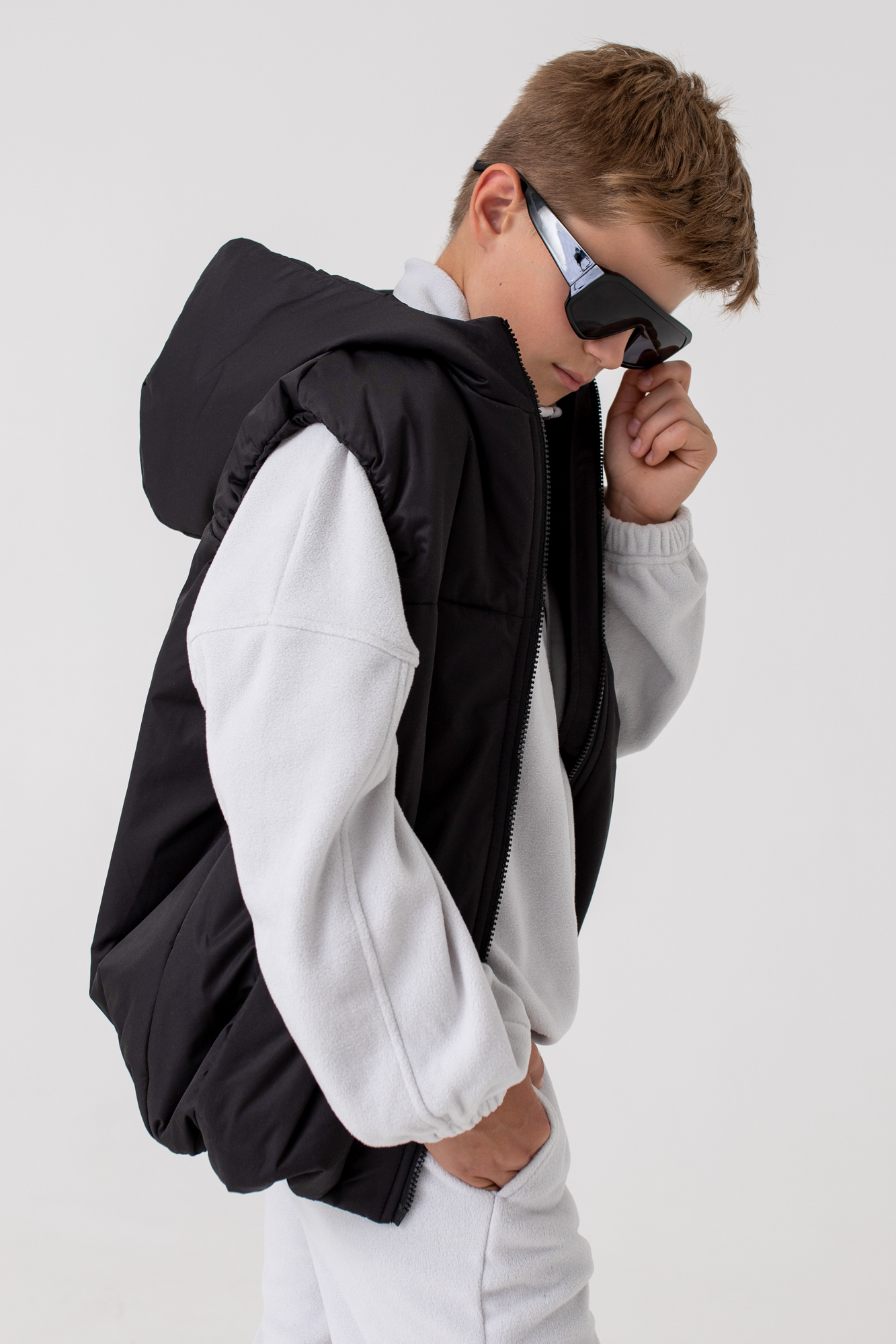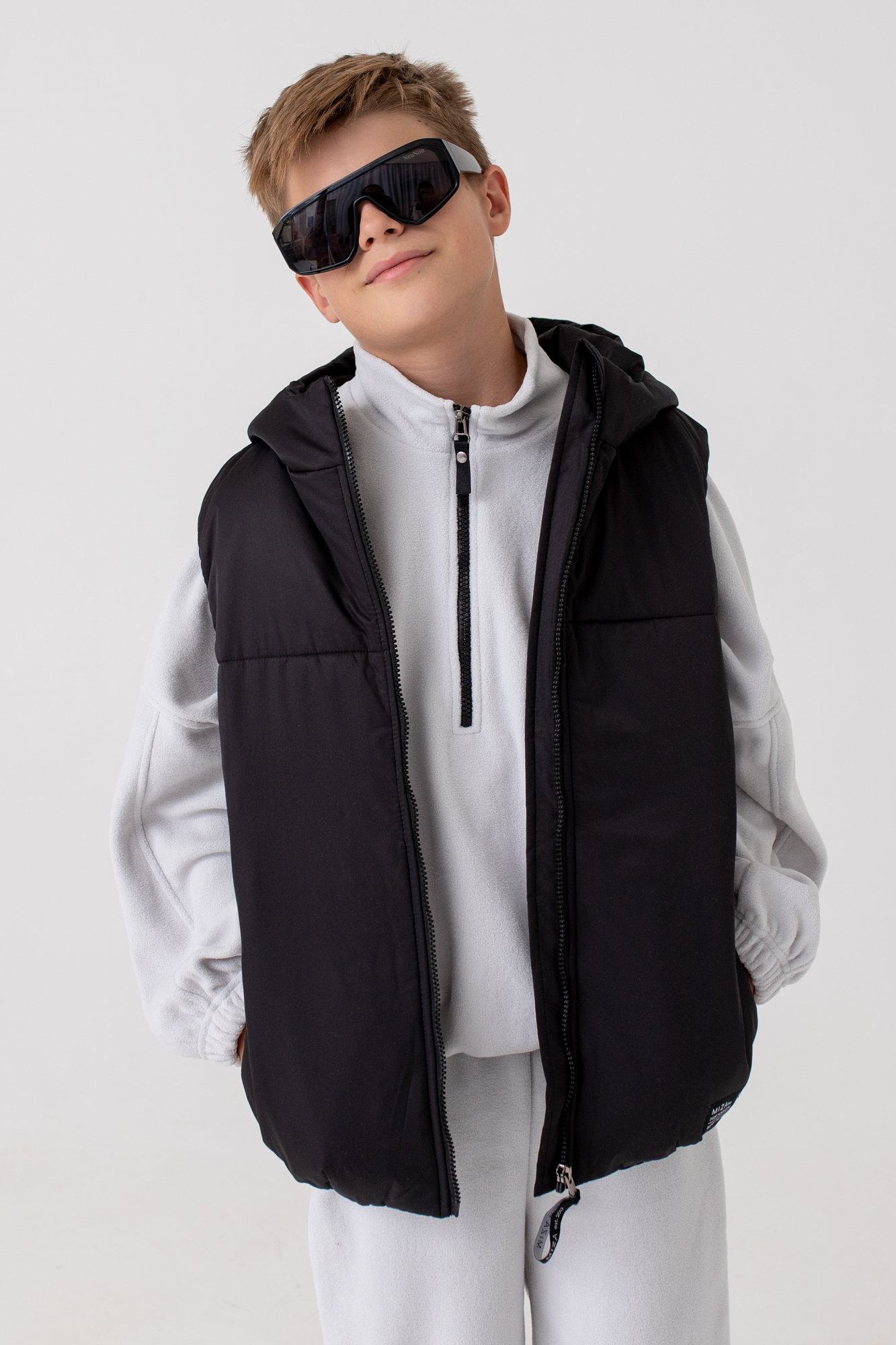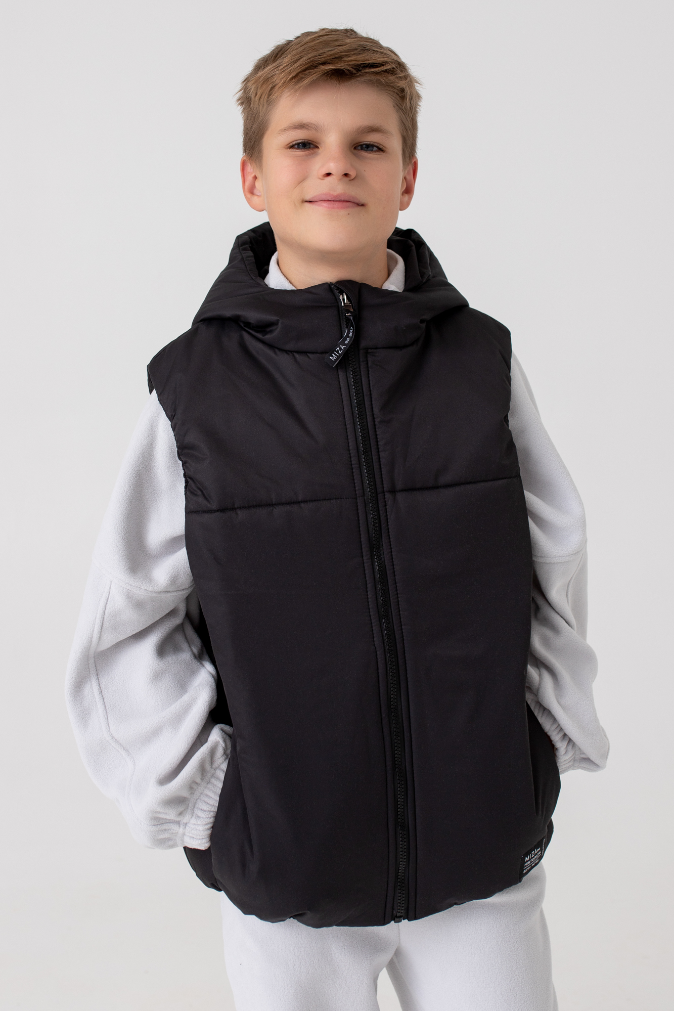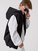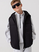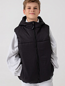Жилет с капюшоном из высокотехнологичной курточной ткани, обладающей ветро- и влагозащитными свойствами.