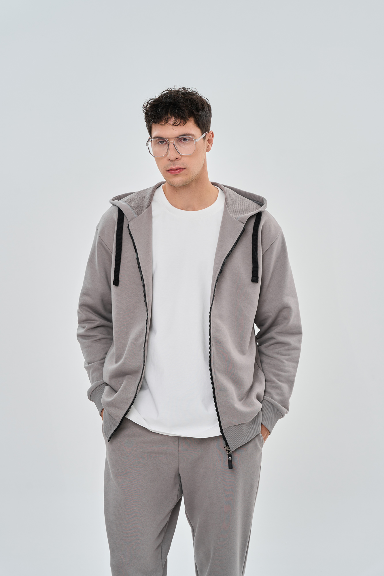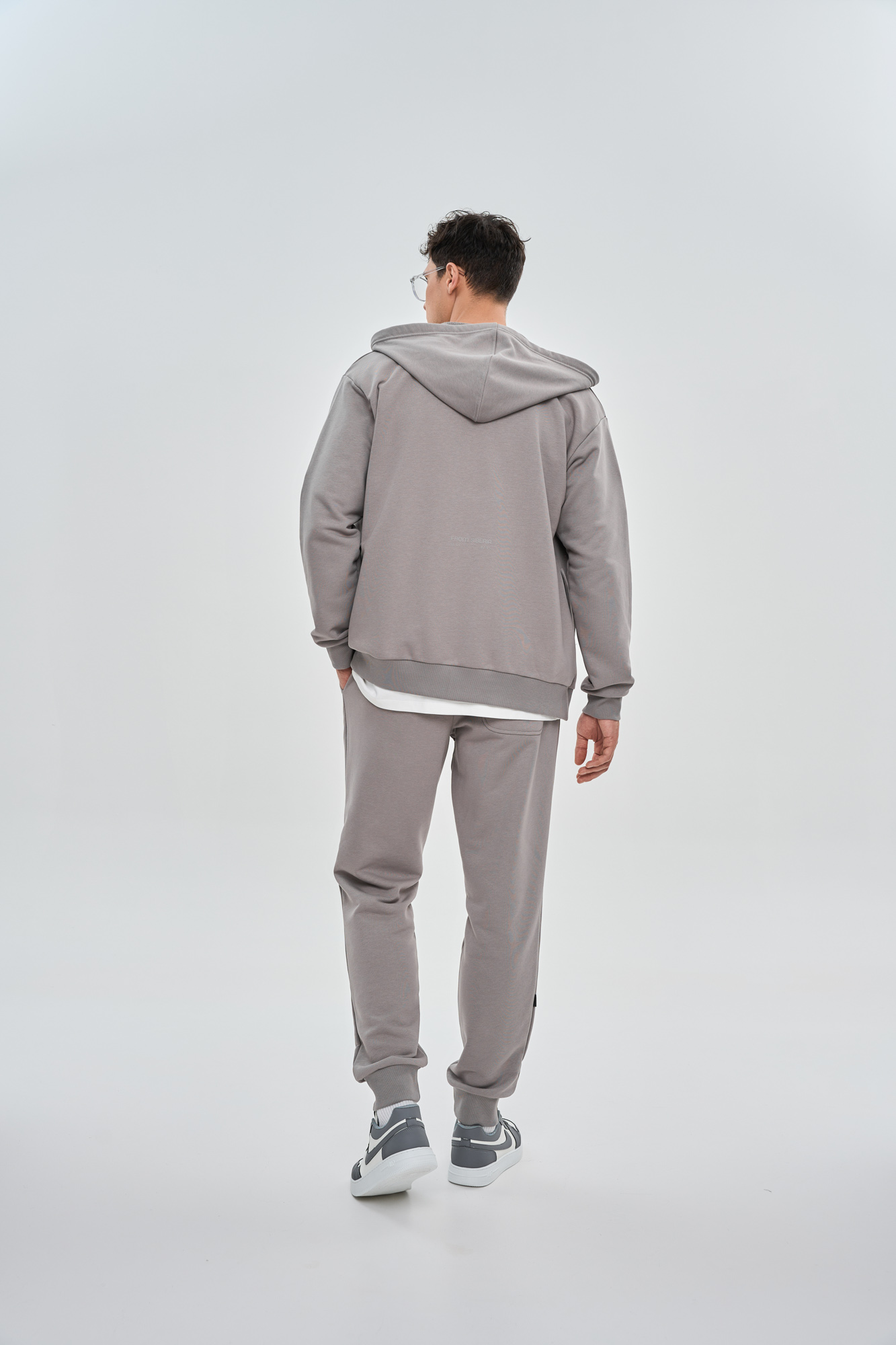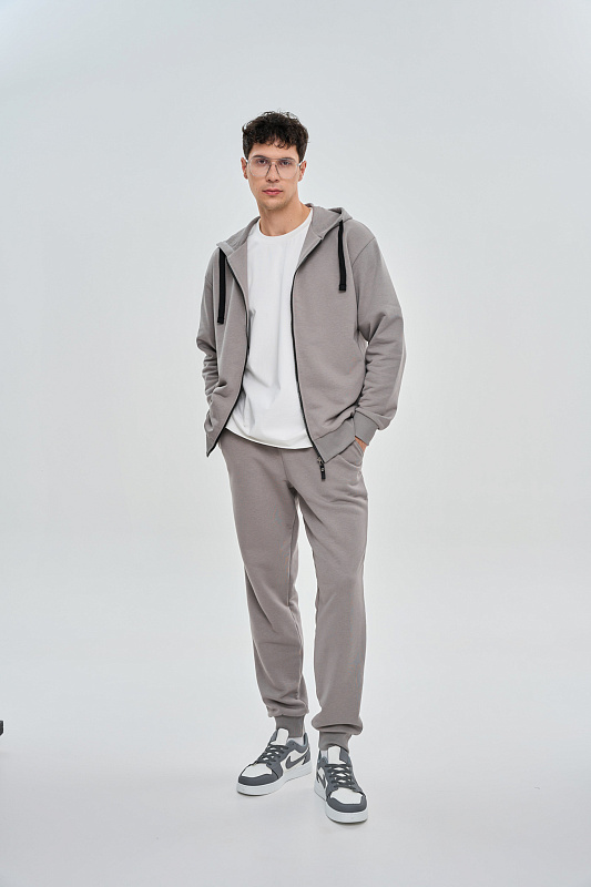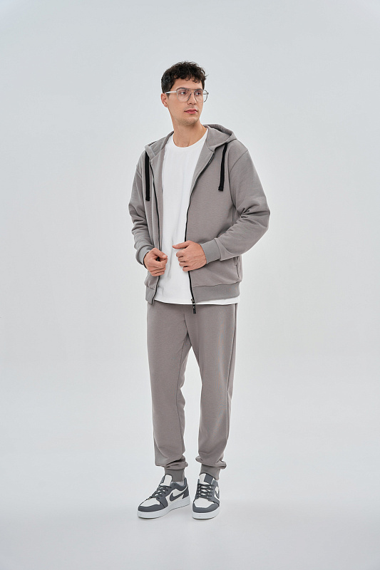 Состоит из бомбера с капюшоном, на молнии, и брюк-джоггегров.