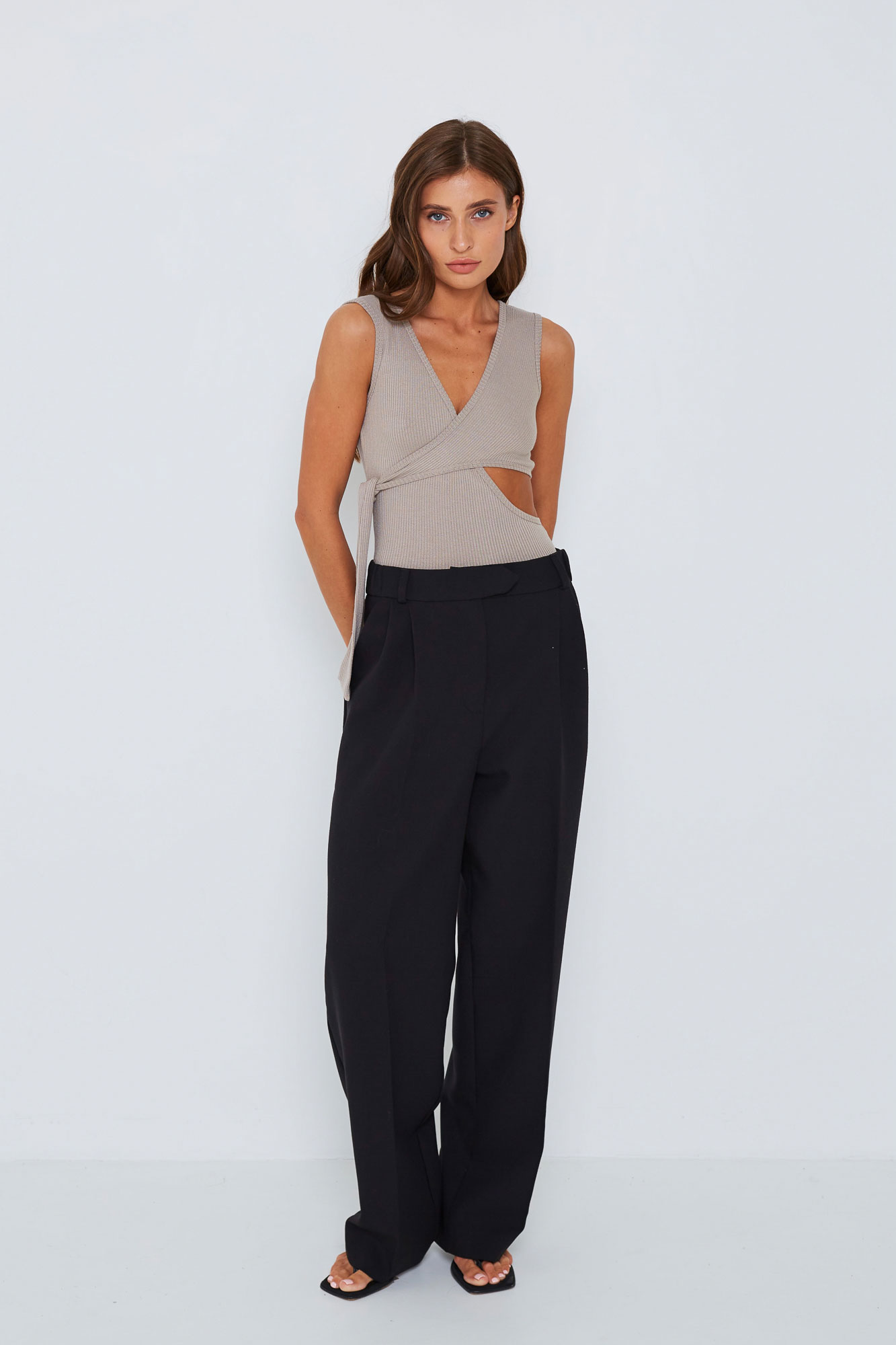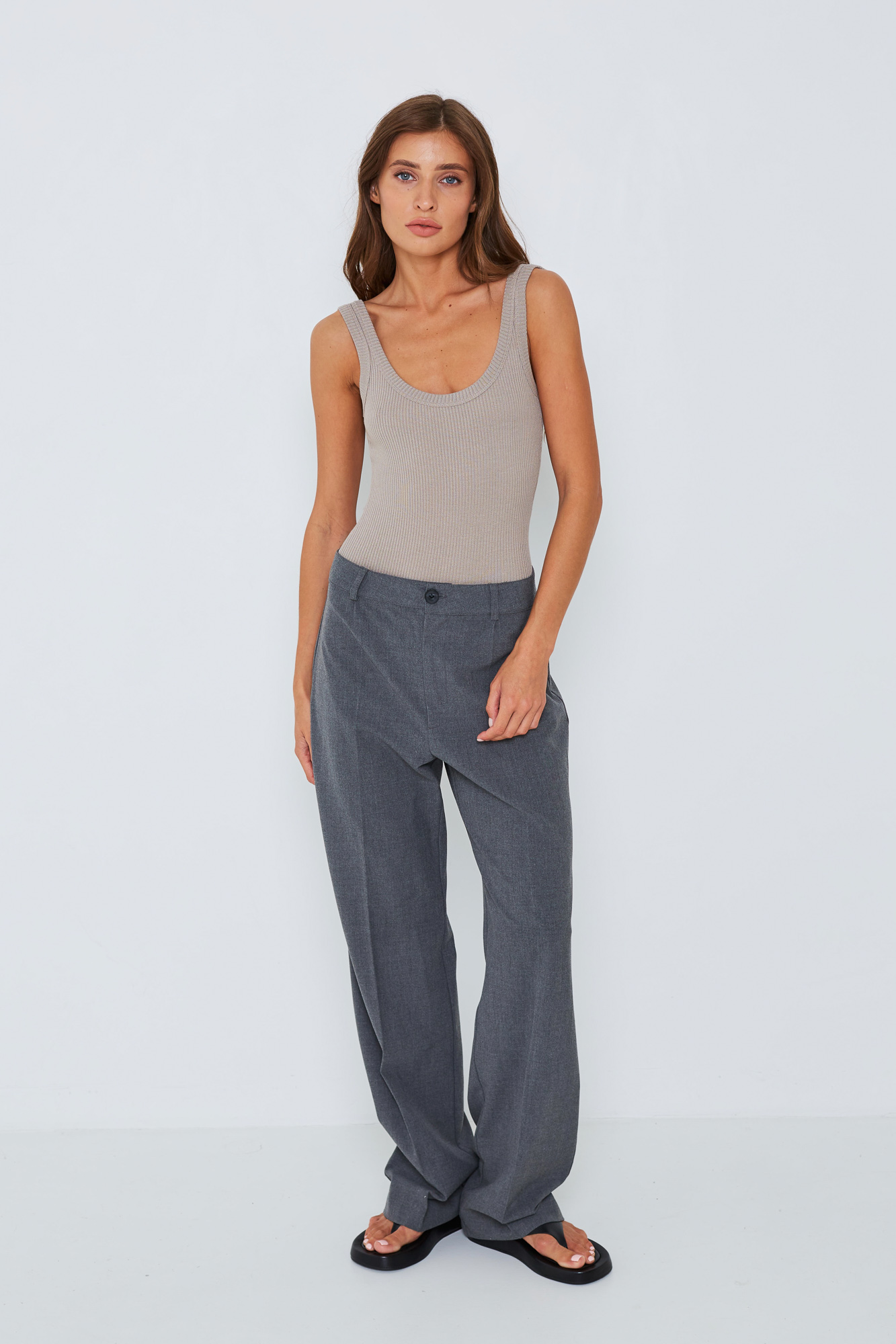 Боди на широких бретелях из мягкого трикотажа в рубчик.