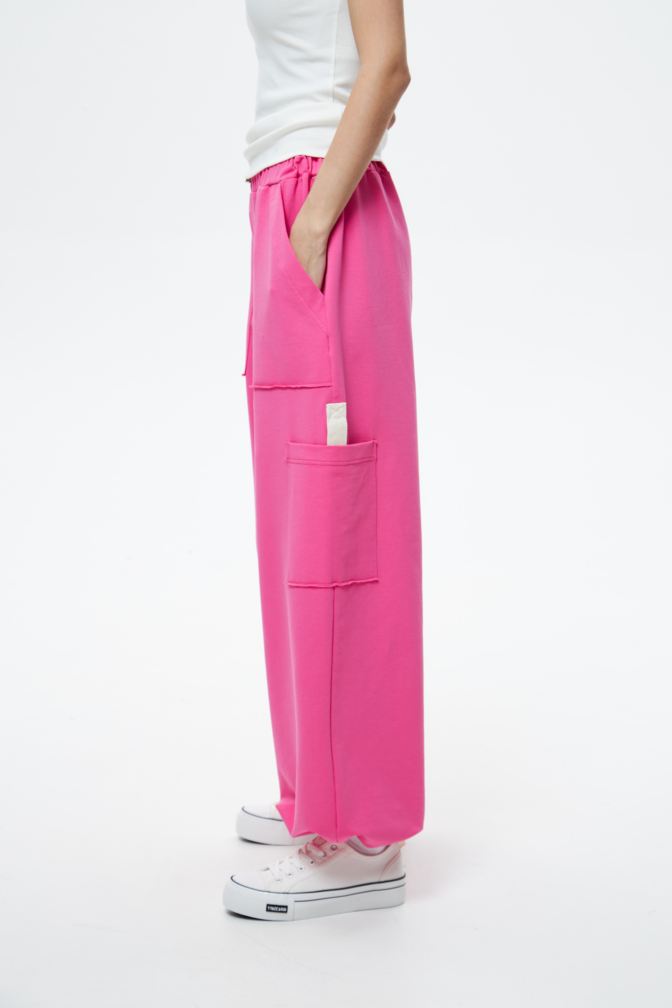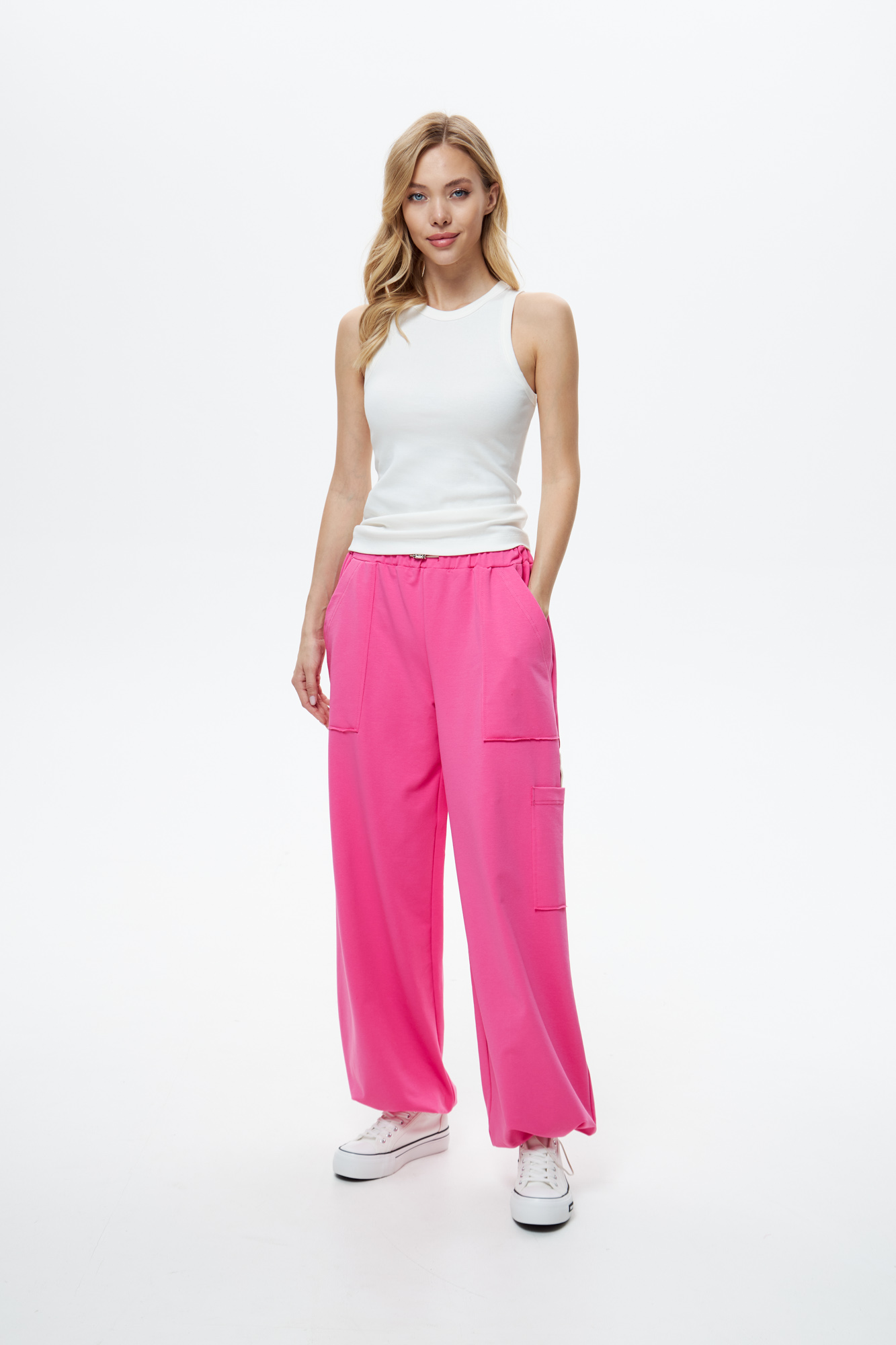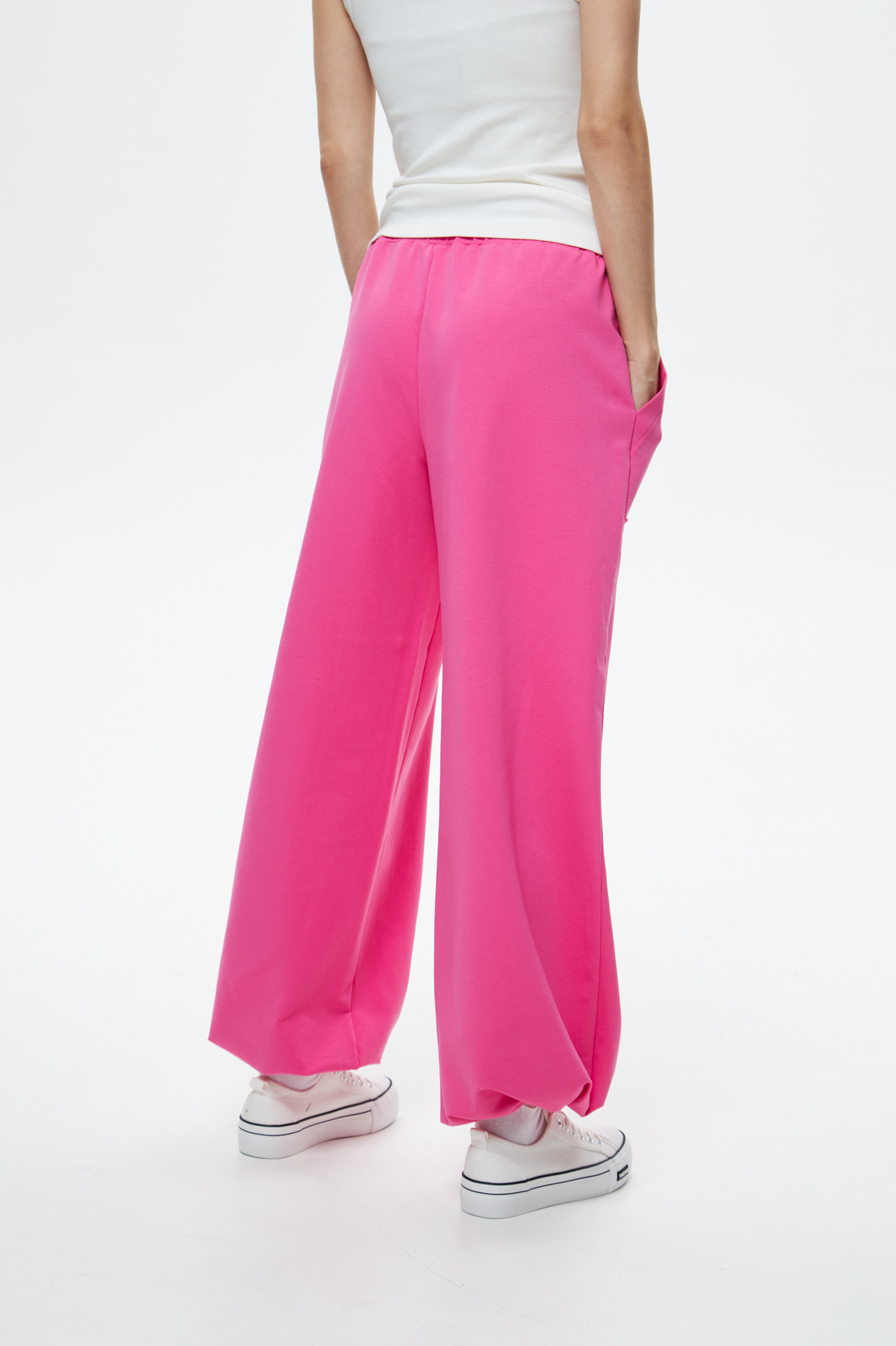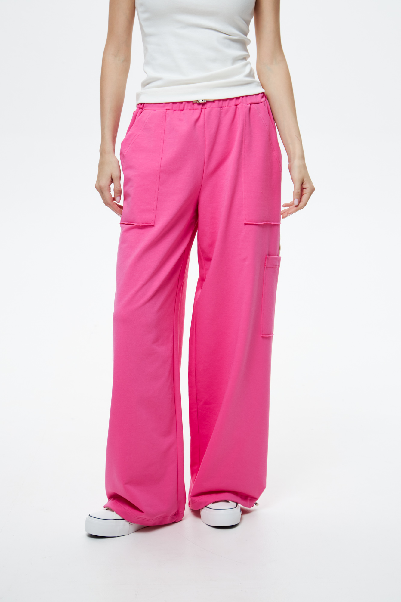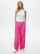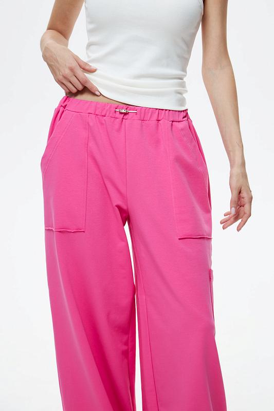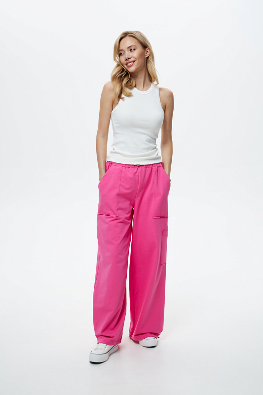 Брюки свободного кроя с накладным карманом и регулируемой резиной по низу.