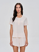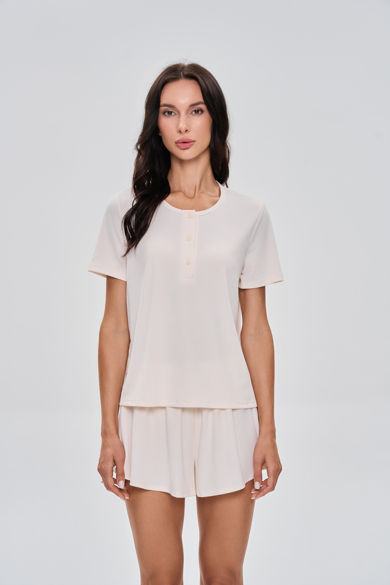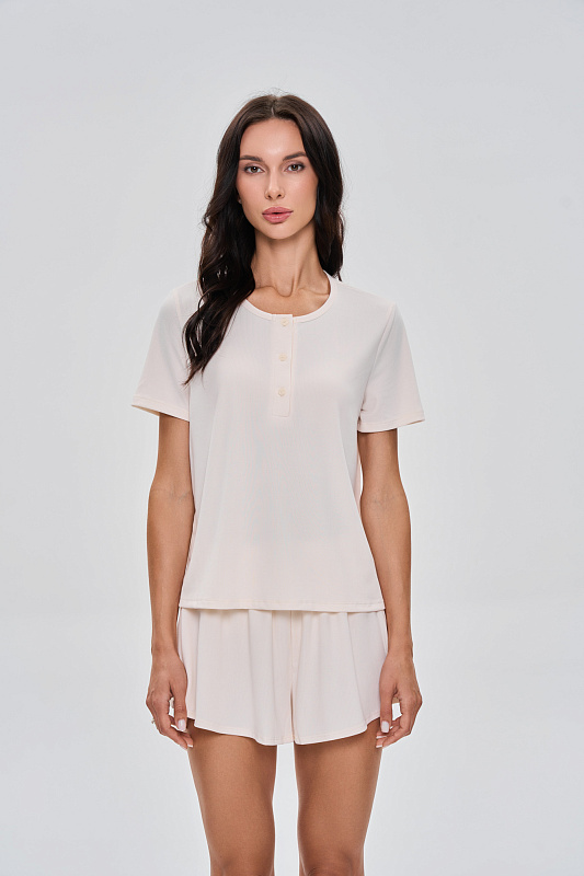 Состоит из футболки свободного кроя с планкой на пуговицах и шортиков.