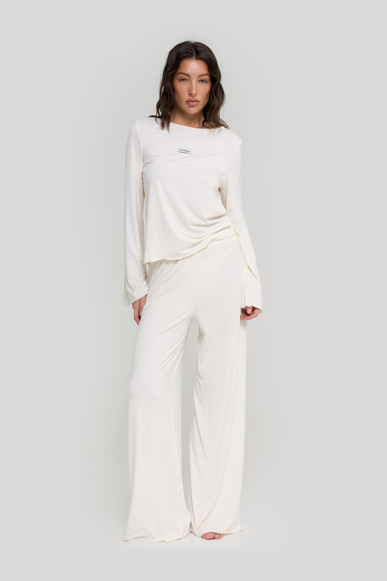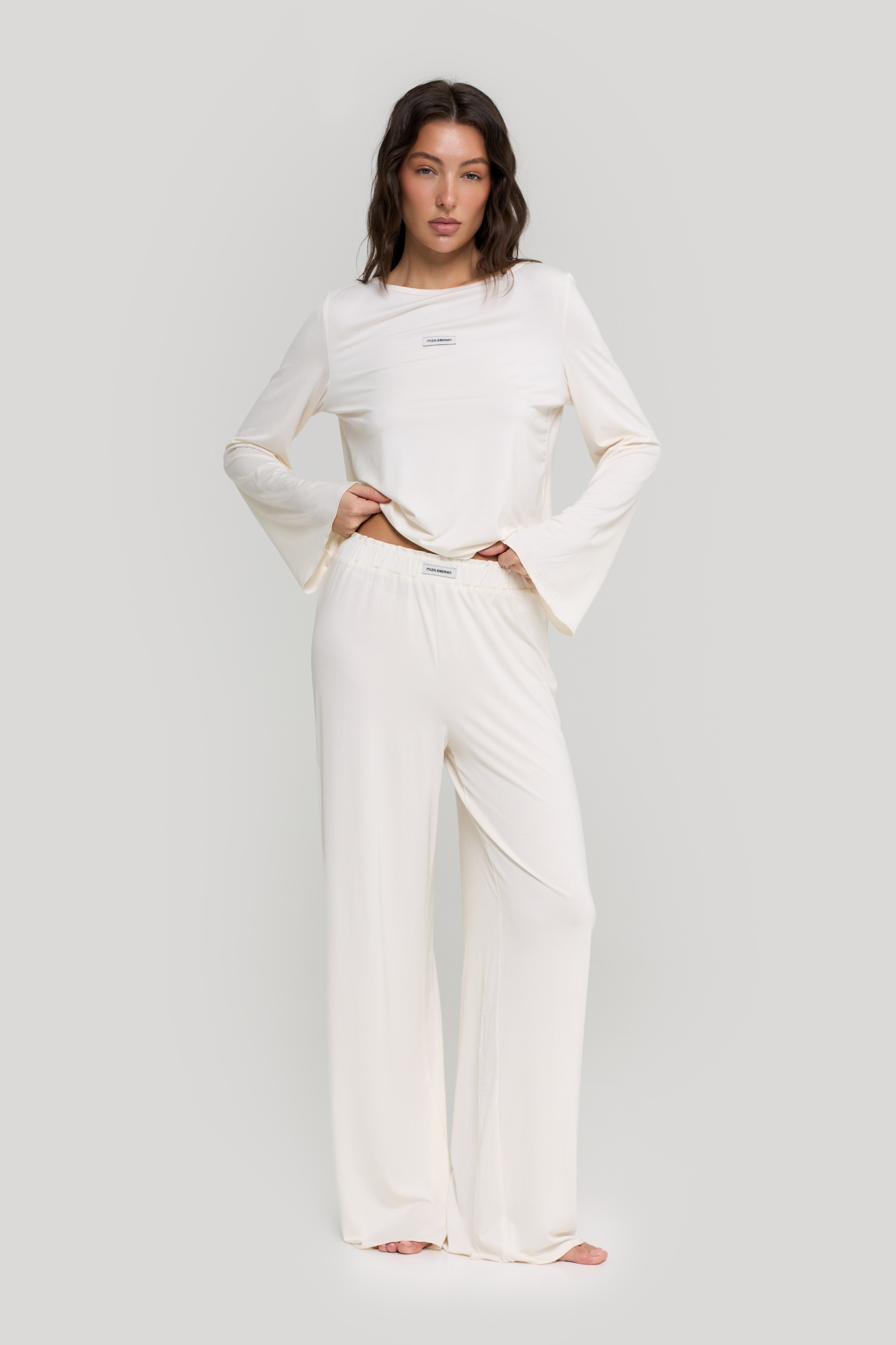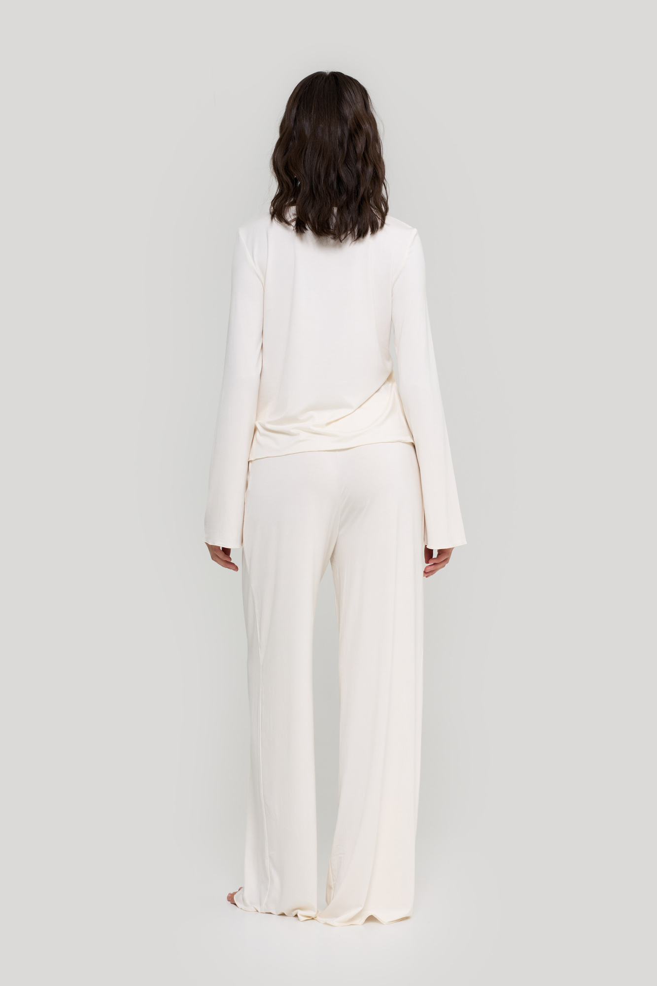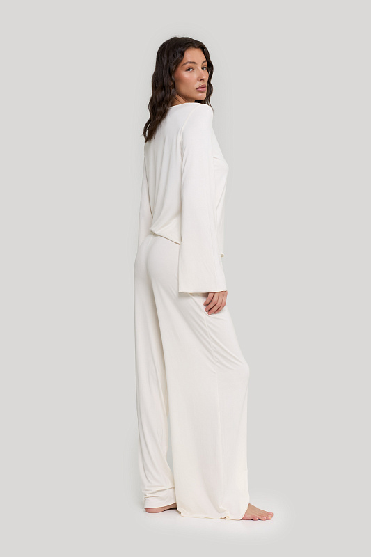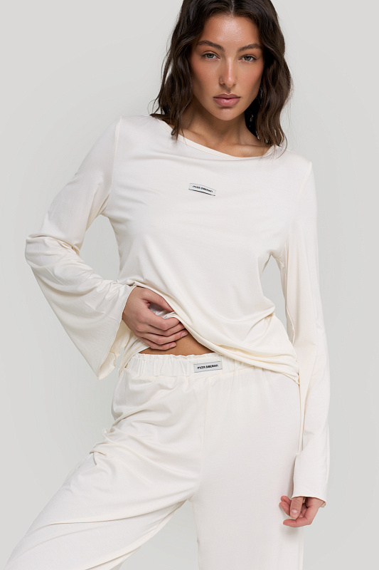 Свободный лонсглив и брюки свободного кроя оформлены брендированной текстильной нашивкой.