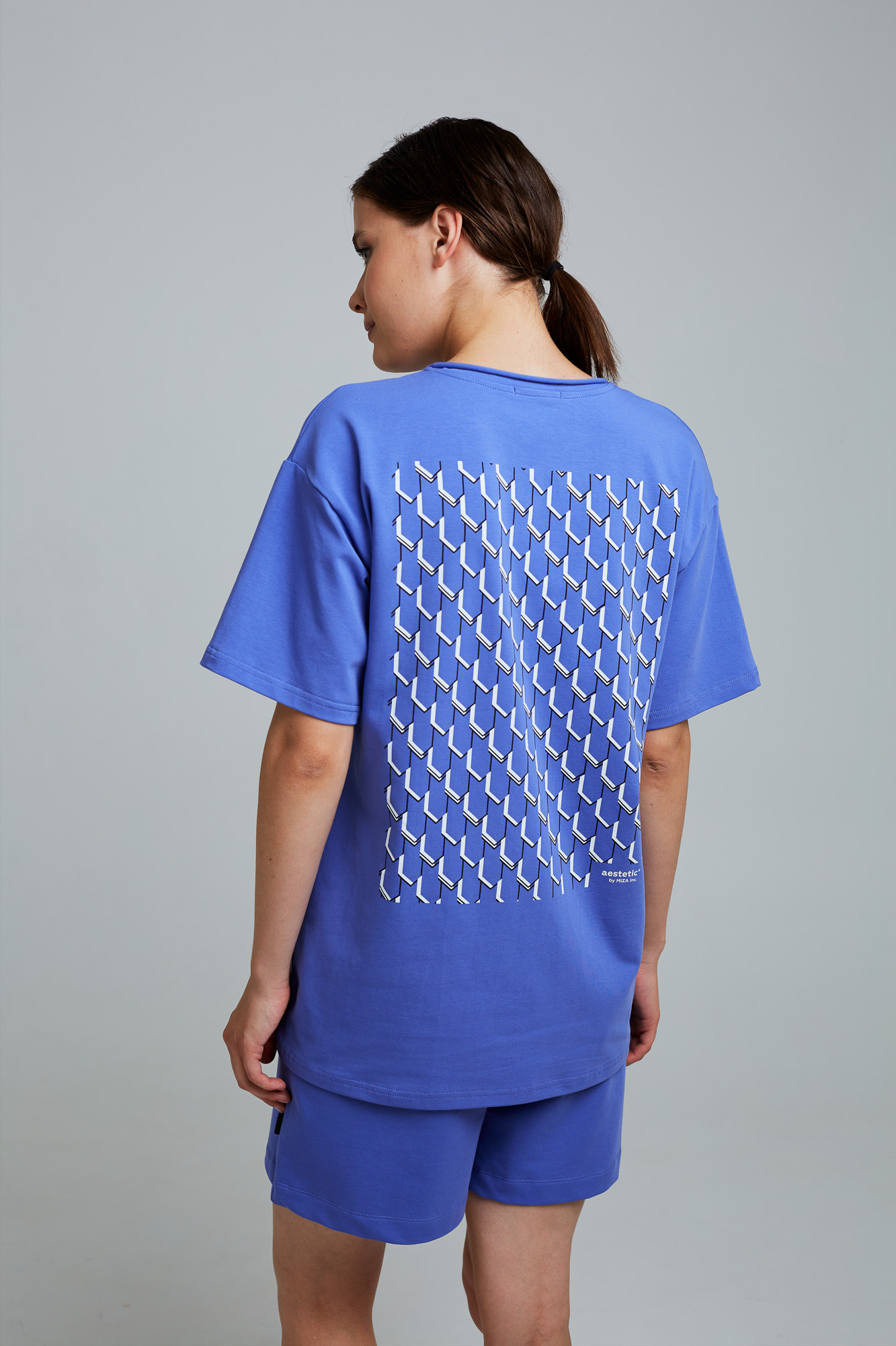 На переде небольшой текстовый принт, поддерживающий эффектный принт на спине.