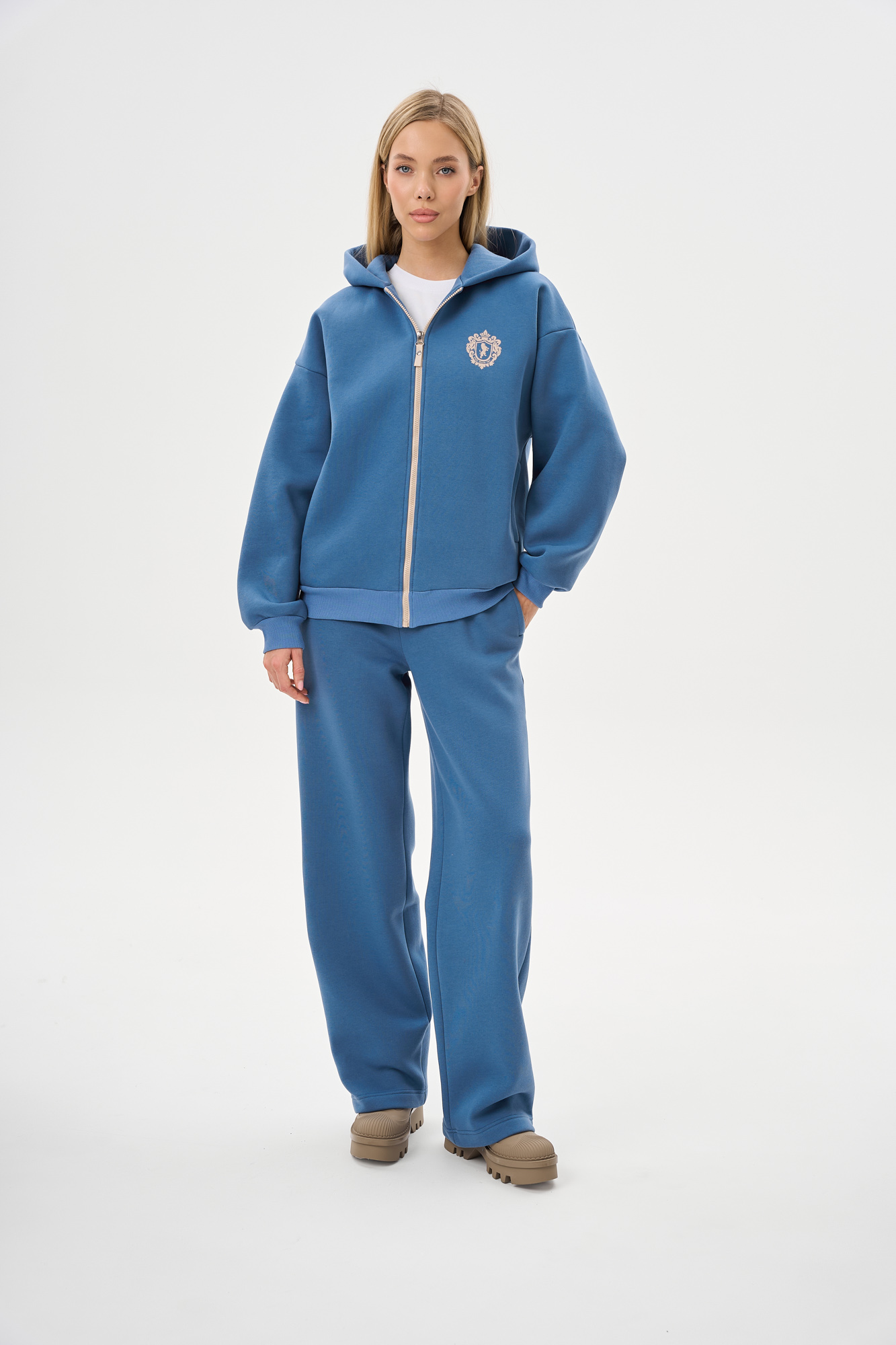 Состоит из худи на молнии и брюк прямого кроя.