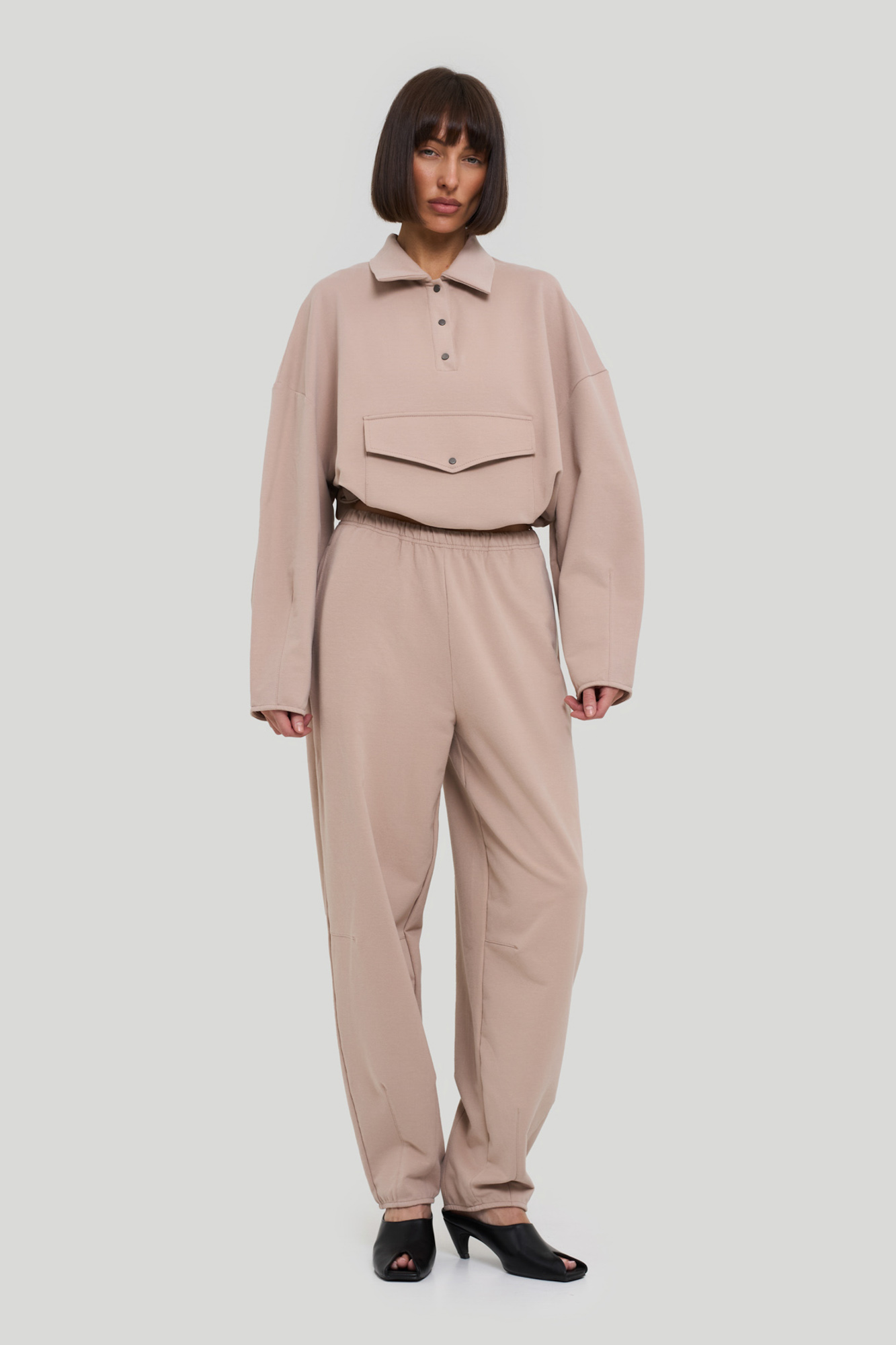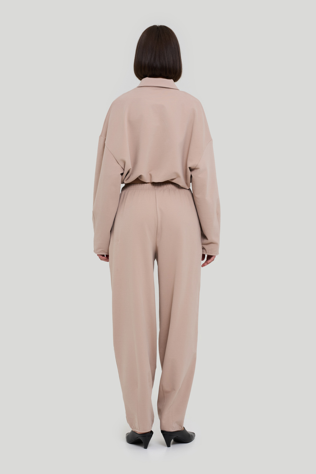 Костюм свободного кроя из плотного тонкого трикотажа.