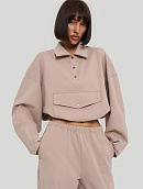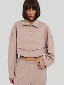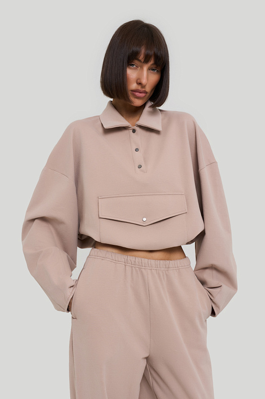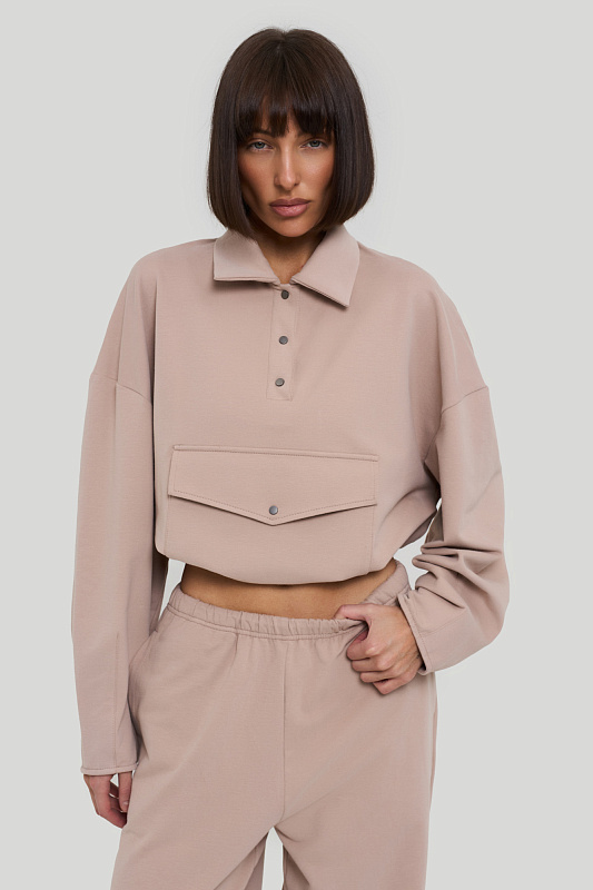 Состоит из свитшота с воротником типа "поло" и накладным карманом с клапаном.