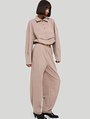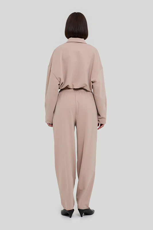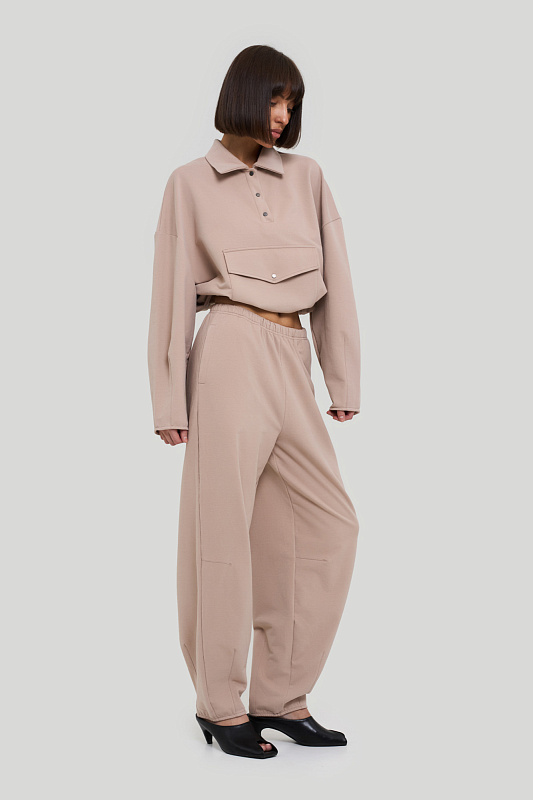 Брюки объёмные, немного заужены книзу.