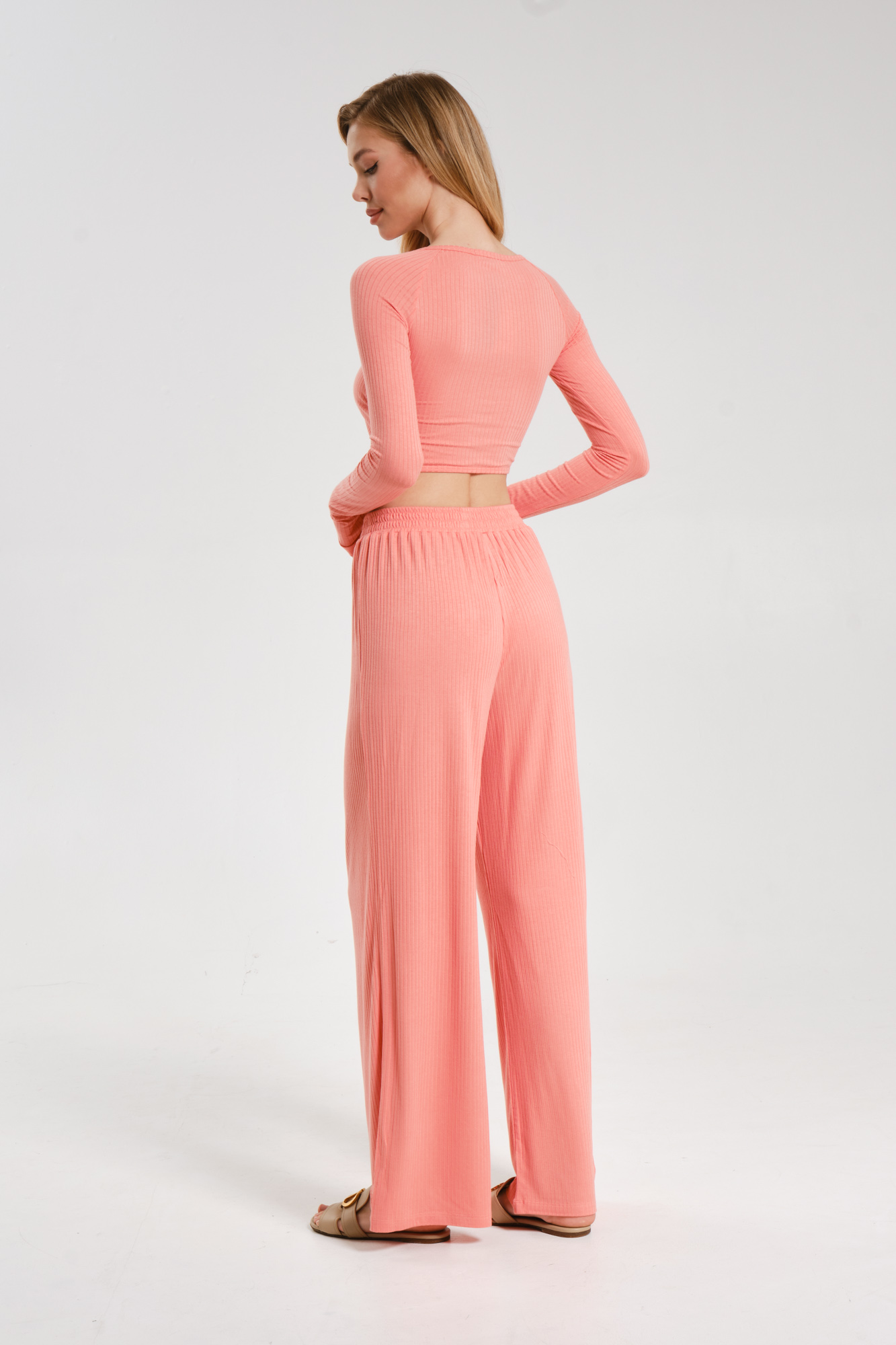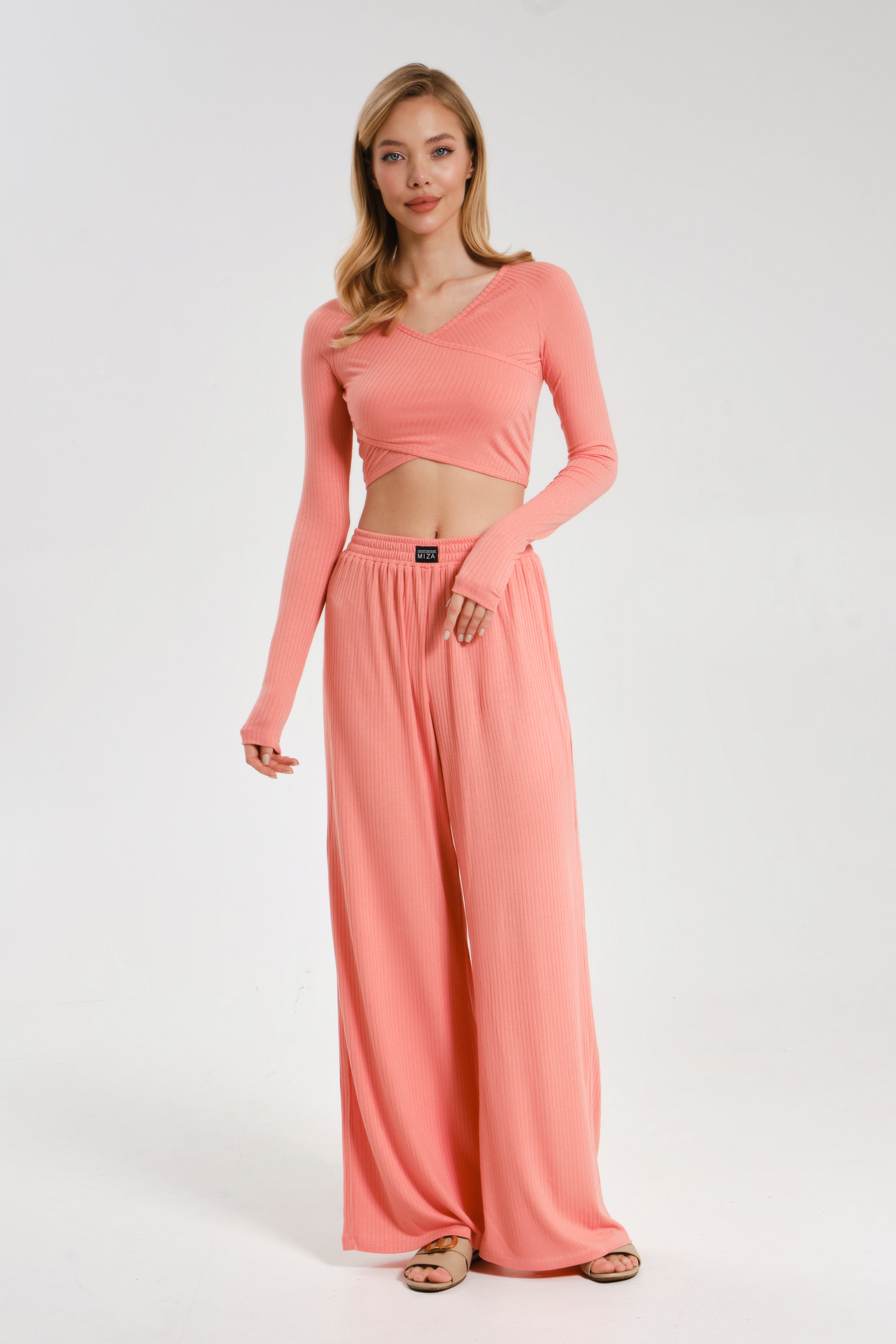 Состоит из широких брюк-палаццо и укороченного лонгслива.