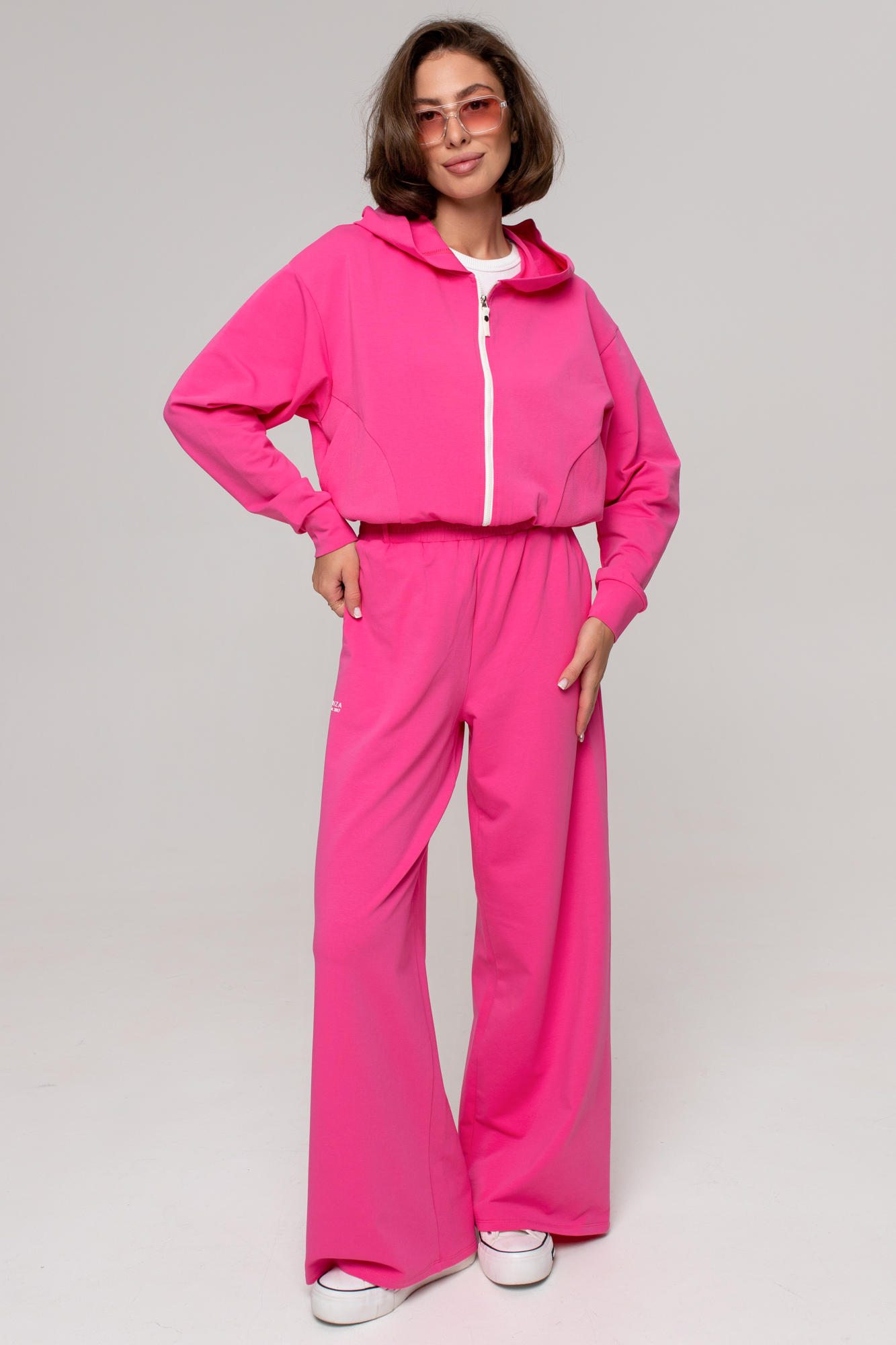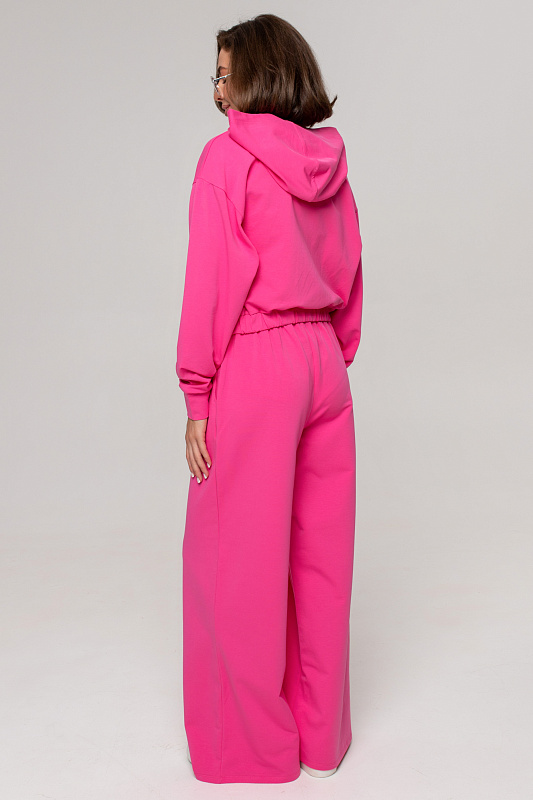 Состоит из укороченного бомбера с капюшоном и широких брюк-палаццо.