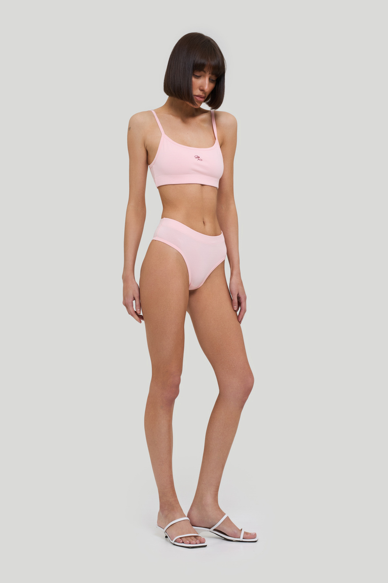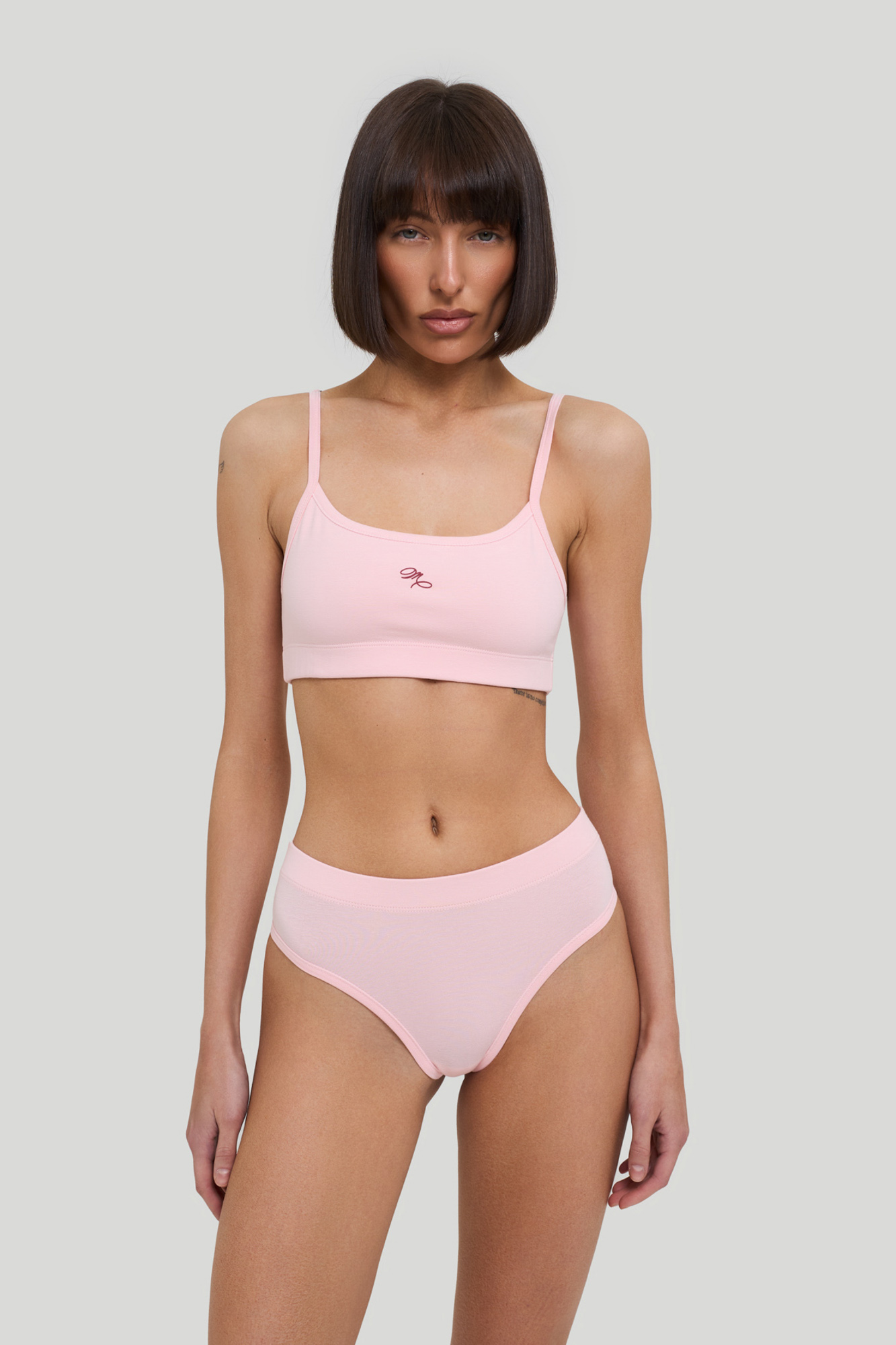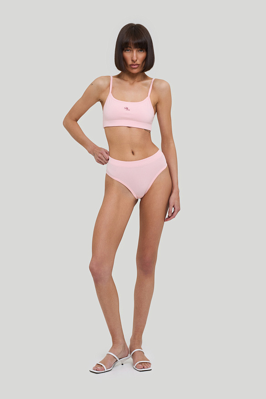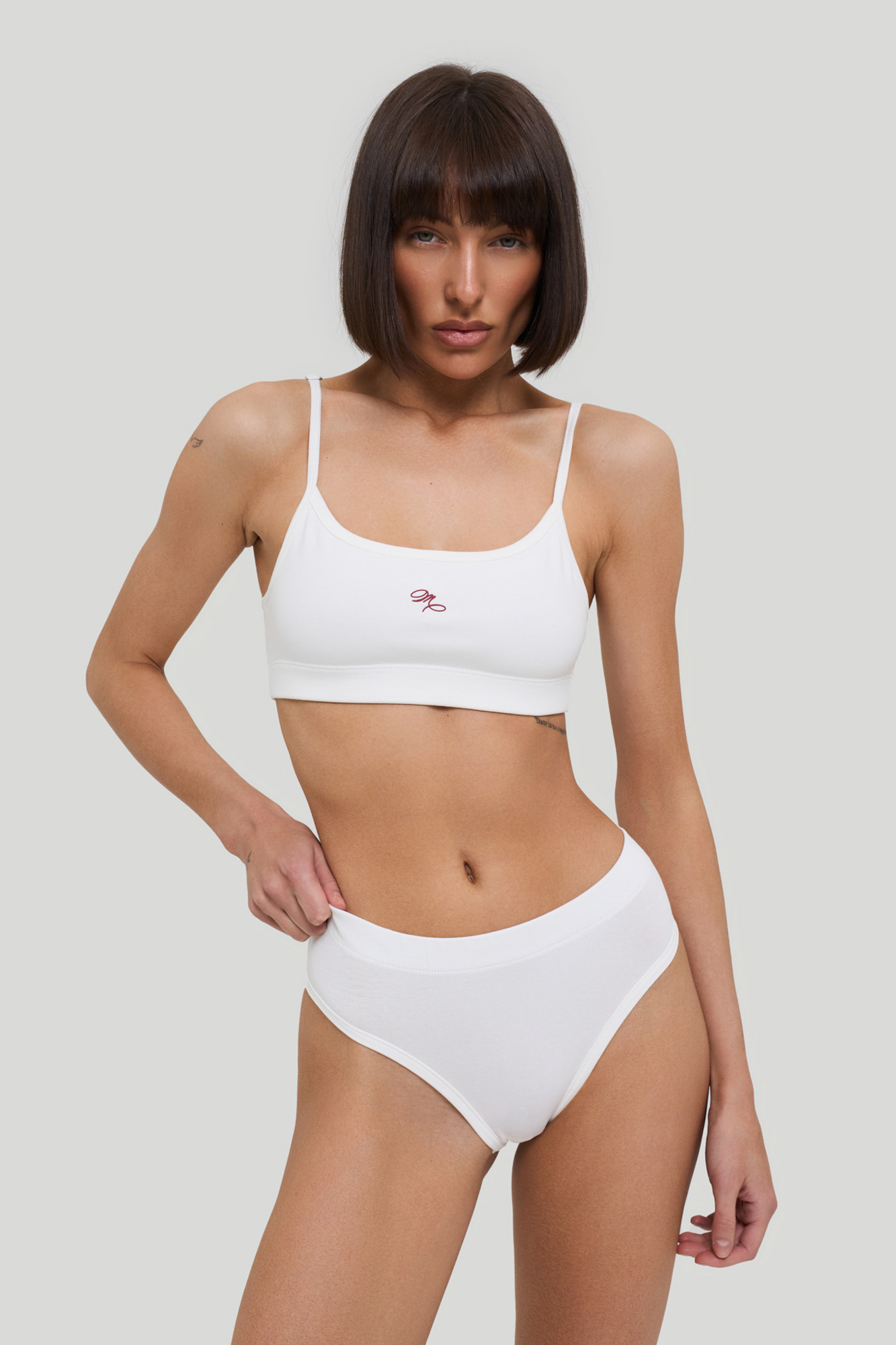 Комплект белья из эластичного хлопкового трикотажа с обработкой SilkTouch, состоит из бралетта с двойным передом, дополненного принтом, и трусиков слипов с высокой посадкой.