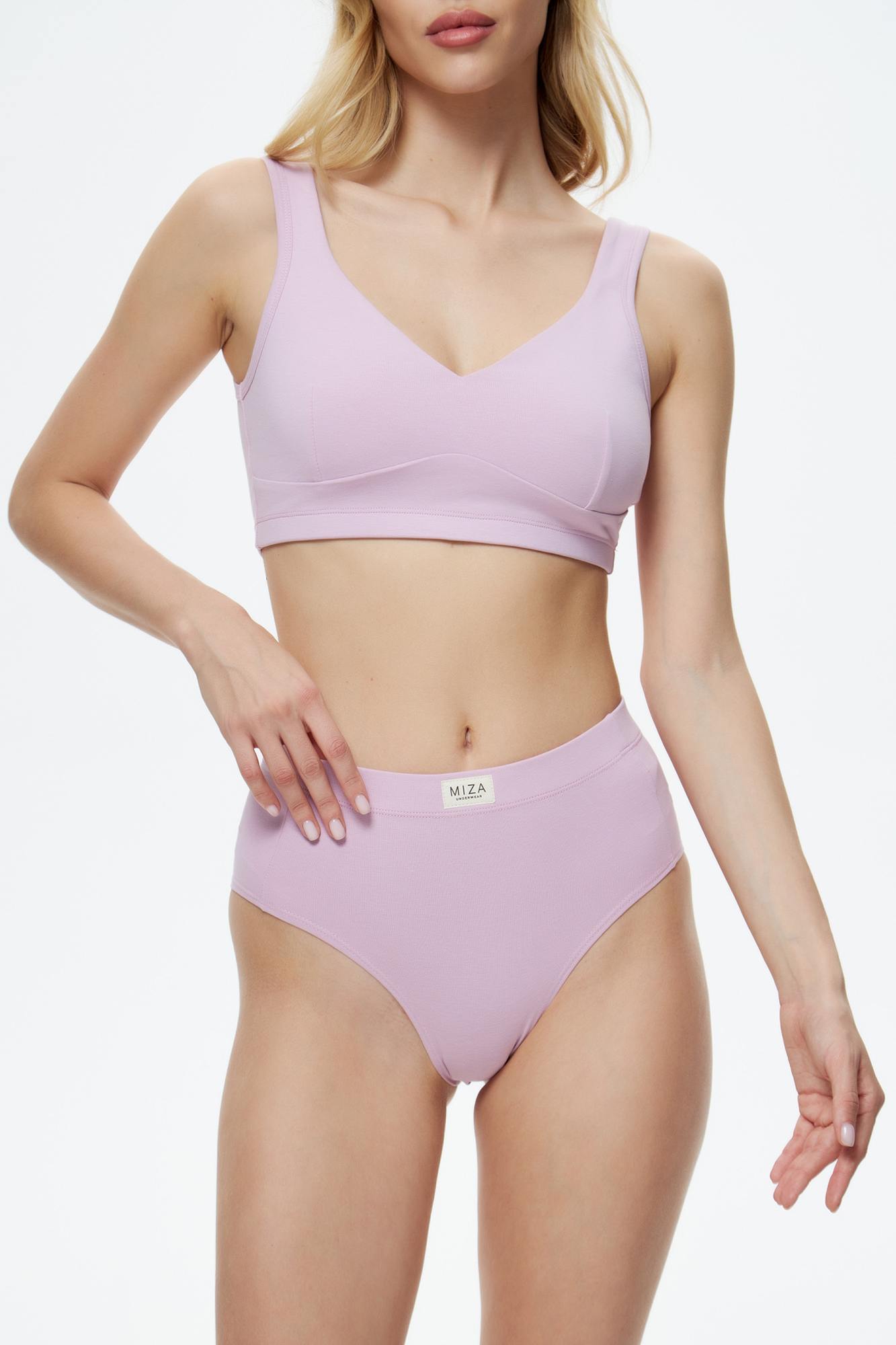 Комплект из мягкого хлопкосодержащего трикотажа (кулирка с лайкрой Пенье), состоит из бралетта на широких бретелях и трусиков Slip.